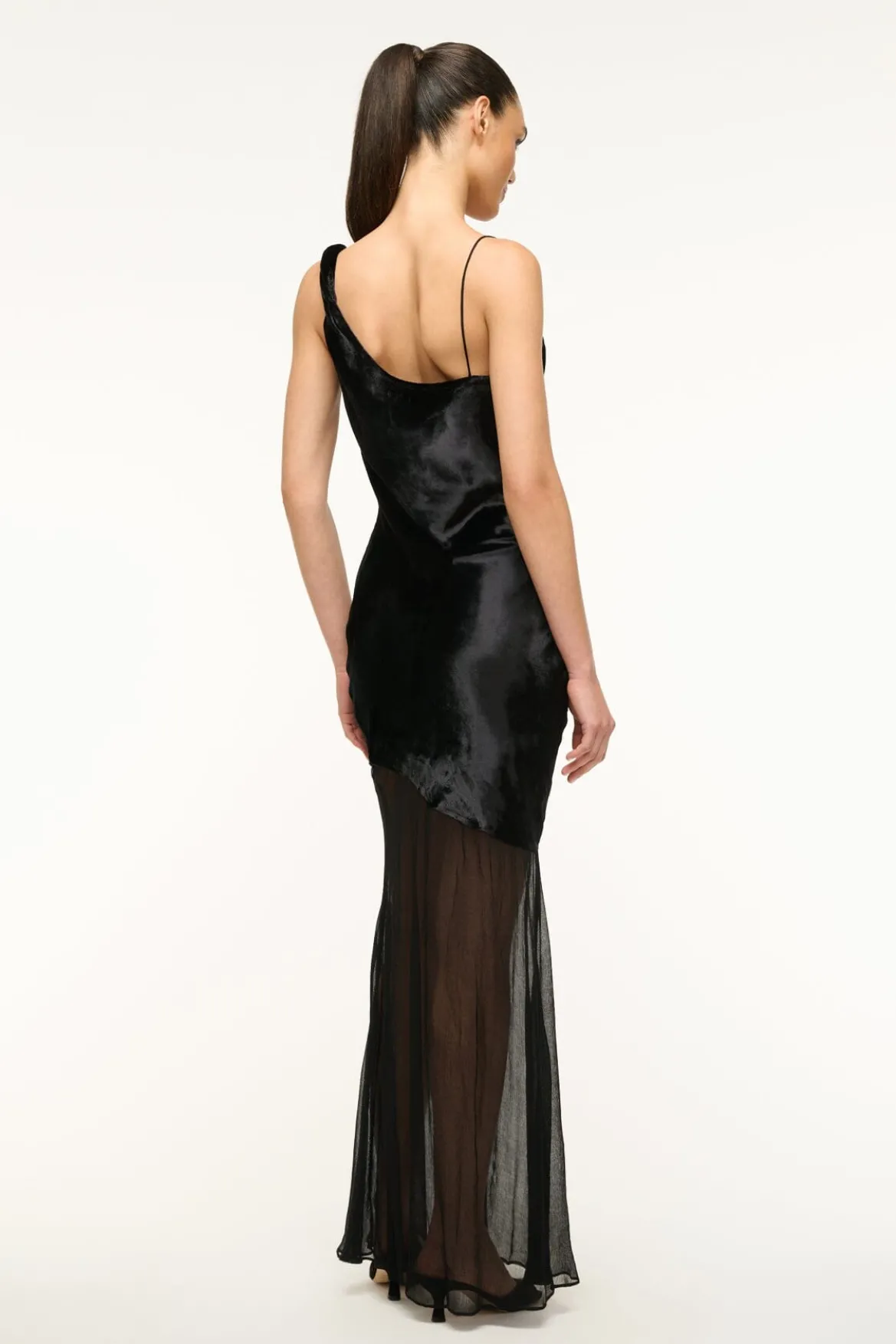 The Beaton Dress is an asymmetrical maxi-length dress with a velvet bodice that flows into a sheer crinkle chiffon skirt. It features a cowl neckline with mismatched straps and an open upper back.
