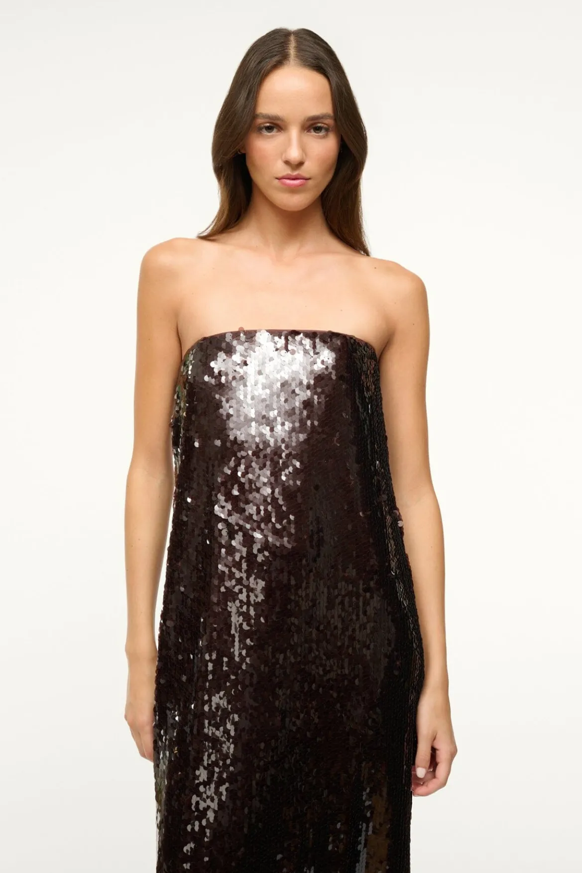 Our best-selling Casey Dress has been reimagined for the season; crafted in shiny sequins,this strapless gown features a relaxed silhouette throughout the body, a back slit, and a hidden zipper.