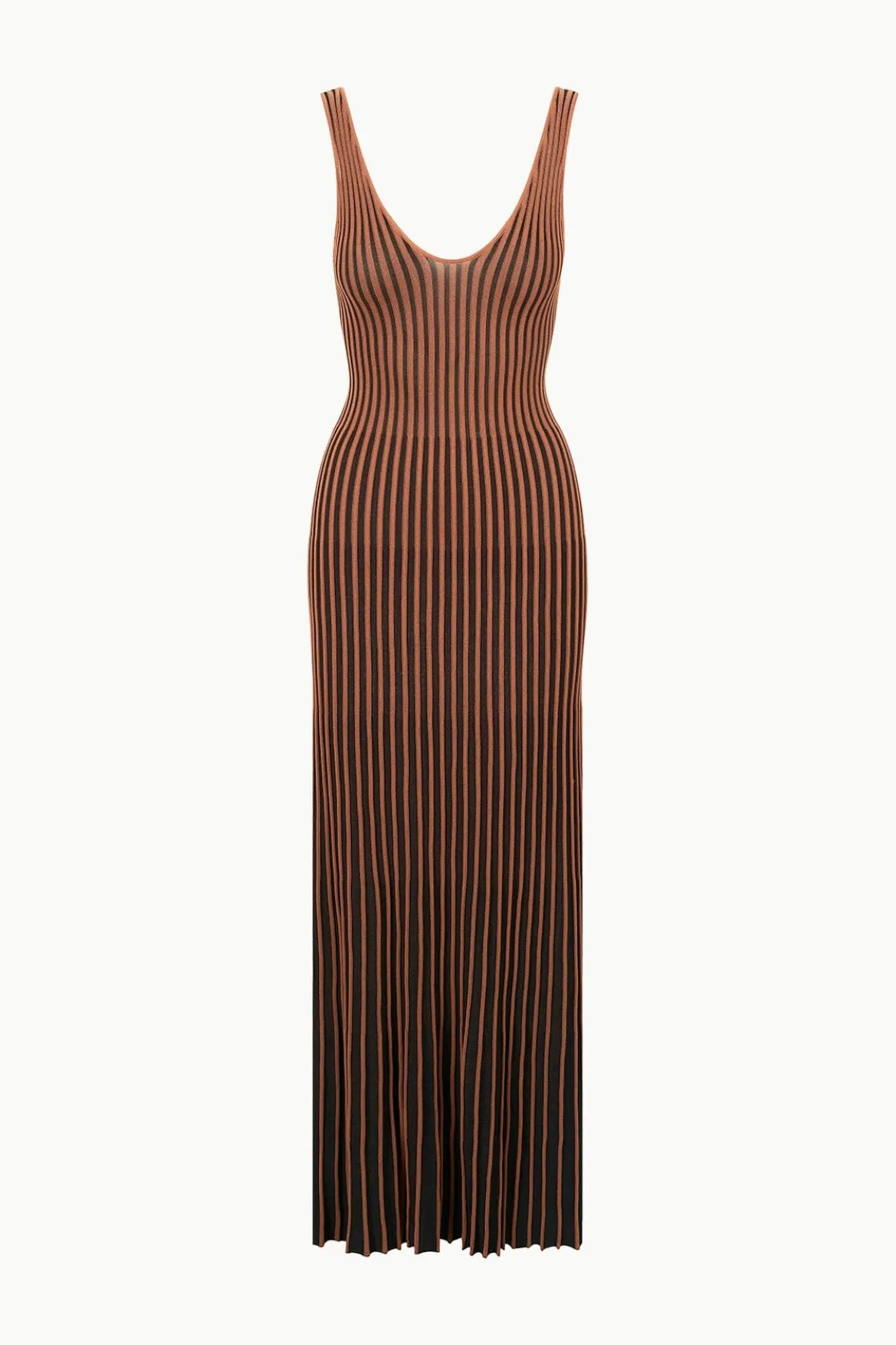 A sleeveless, maxi length dress made out of a flattering two-toned pleated rib knit fabric. This slip-on dress features a deep v neckline and slightly fluted skirt.