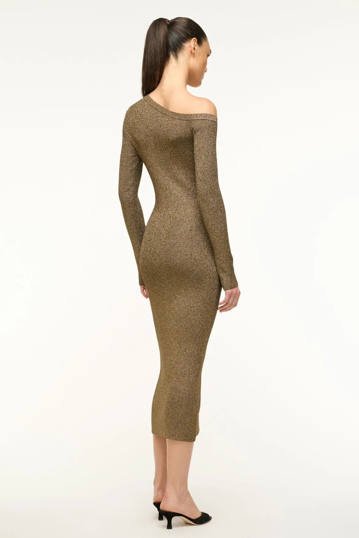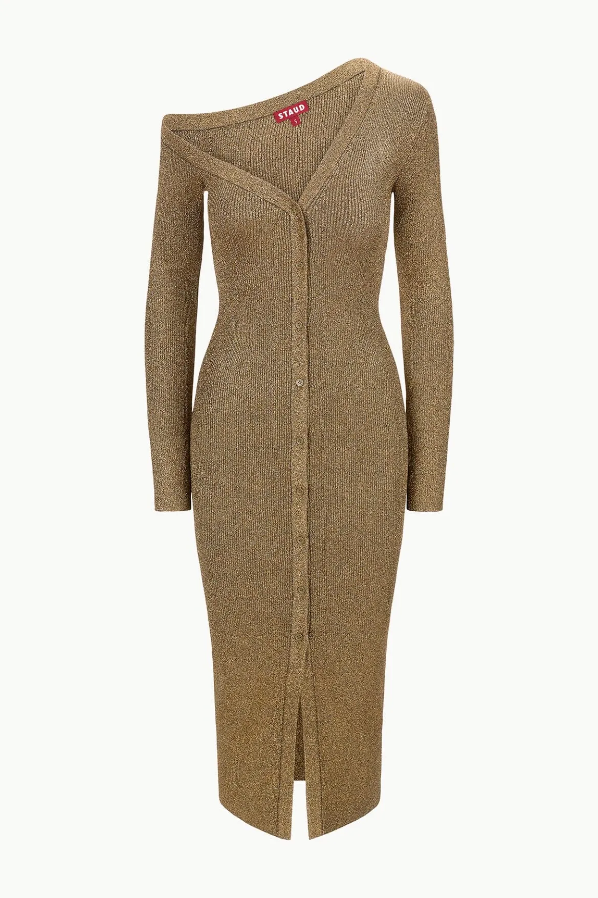 The Craftsman Sweater Dress is our update to the Craftsman Sweater. This style is an off-one-shoulder fitted midi dress.