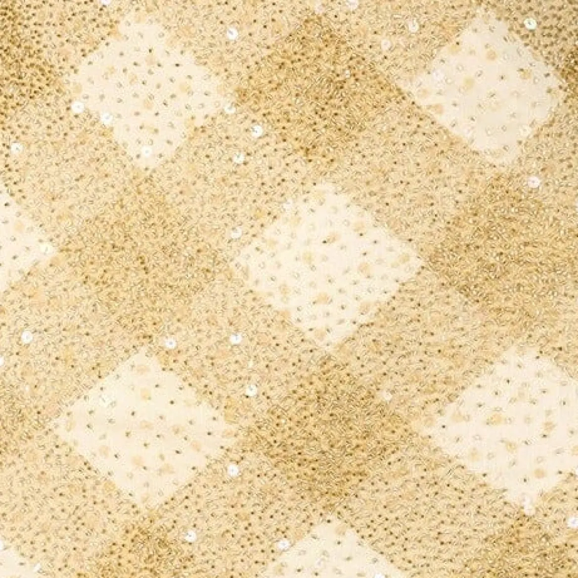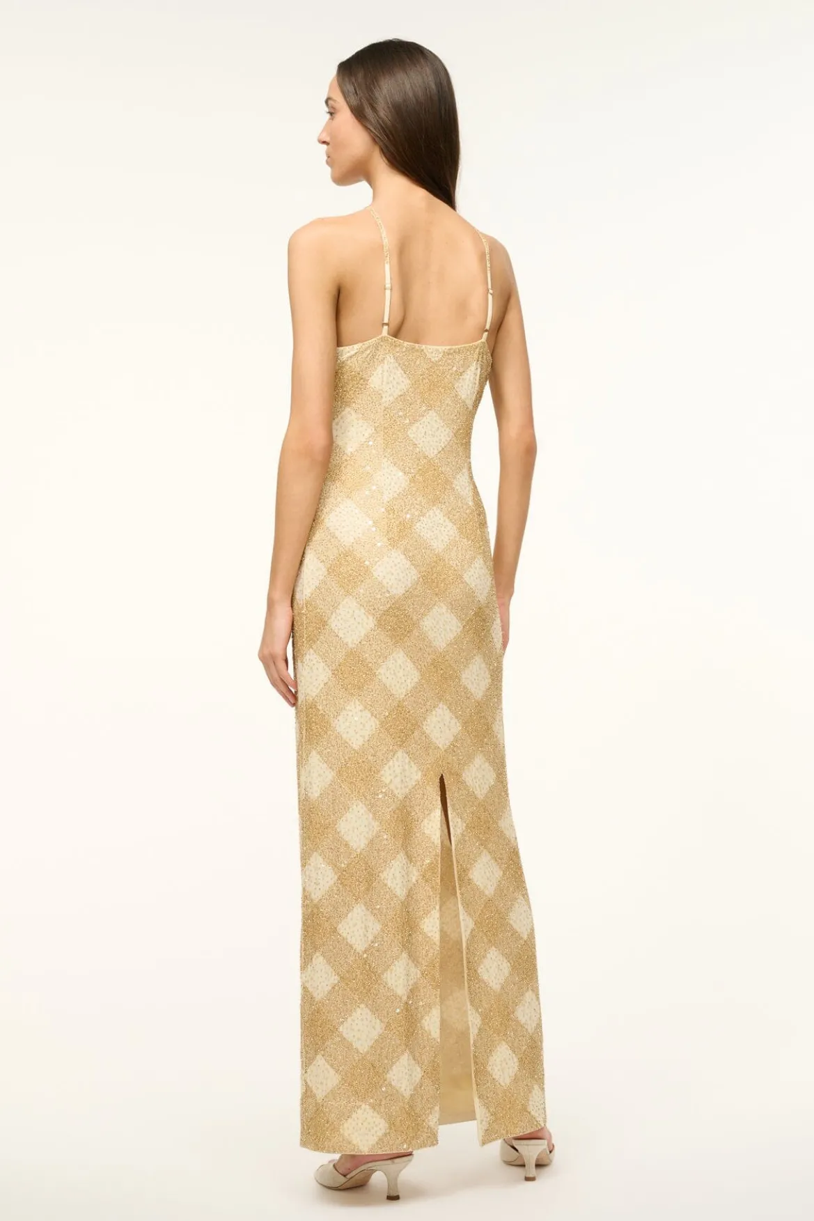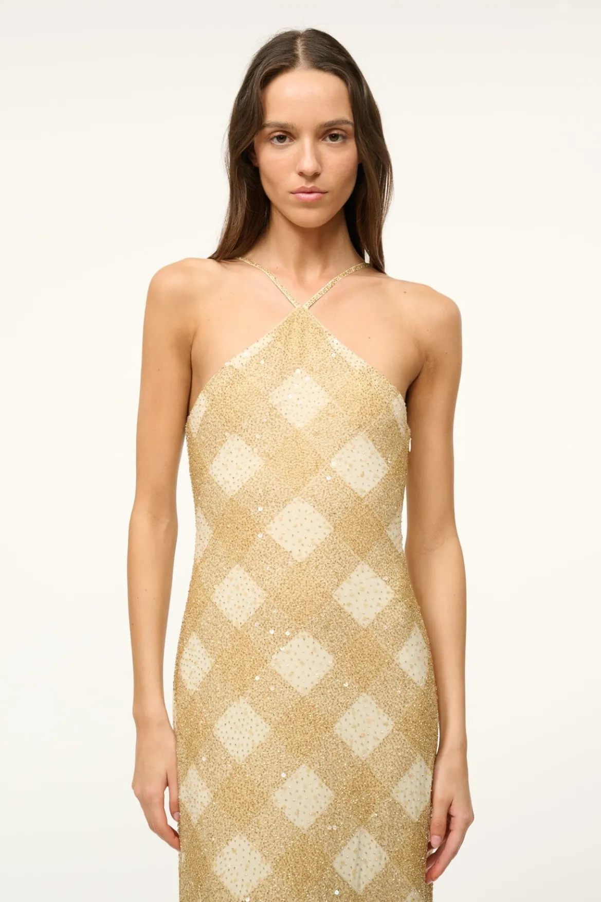 The Cubism Dress is a fully beaded, bias-cut gown with a halter neckline and adjustable cris-cross straps at the back.
