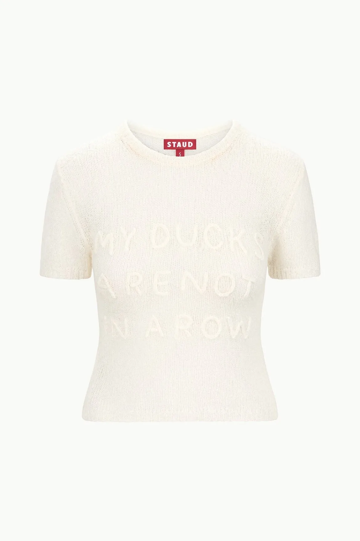 A playful fuzzy knit tee for the season, featuring “my ducks are not in a row” embroidery on the front “and one is probably a pigeon” on the back.