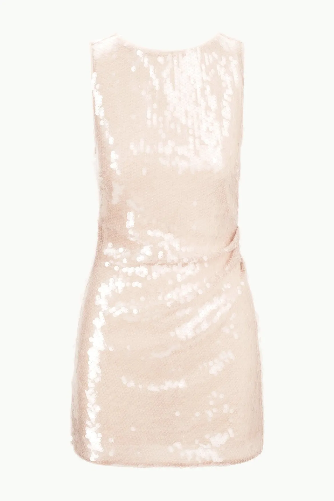The Eton Dress is a boatneck mini dress with asymmetric draping at the waist and a hidden center back zipper.