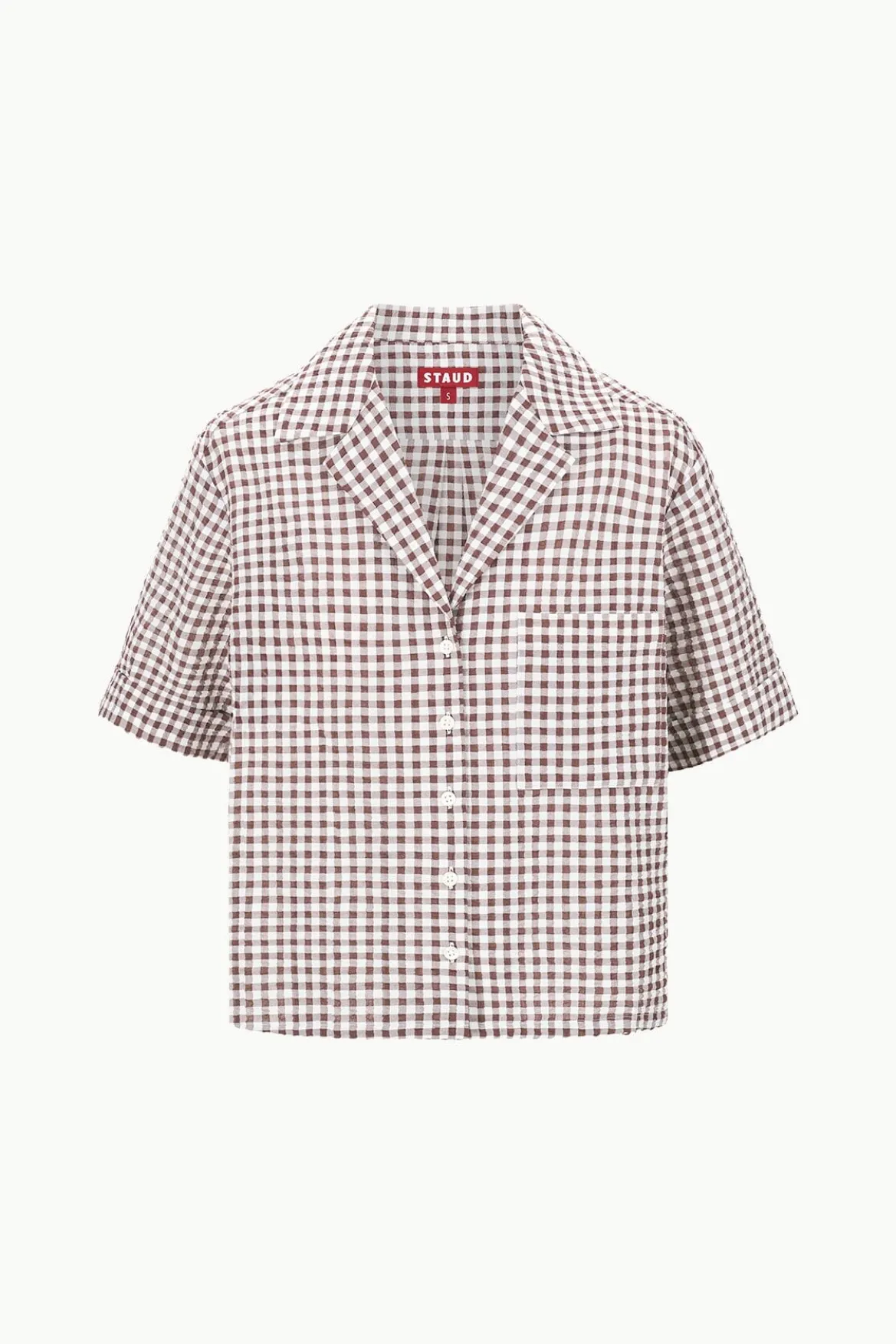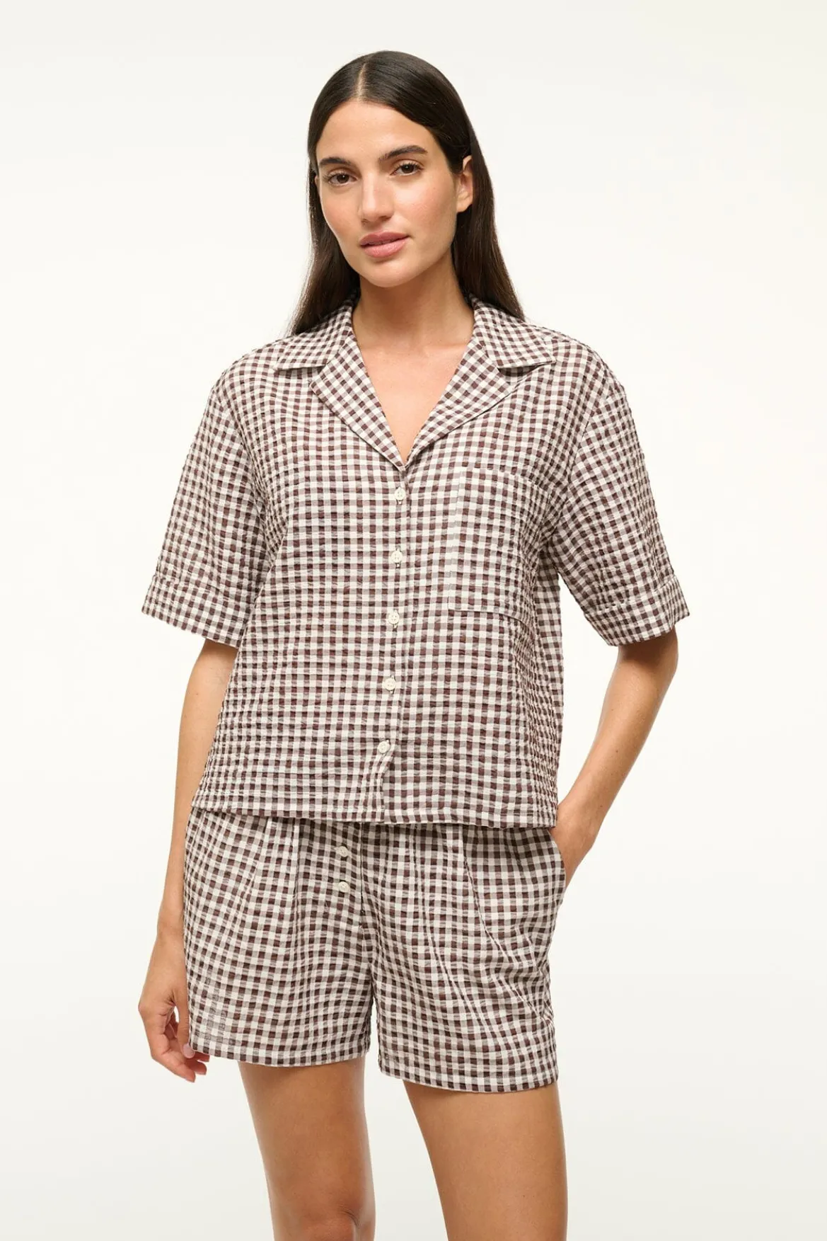 A seersucker coverup button down shirt that pairs with our Gabi Short. This style features a boxy fit, a front pocket, and button detailing at the front so it can be worn open or closed.