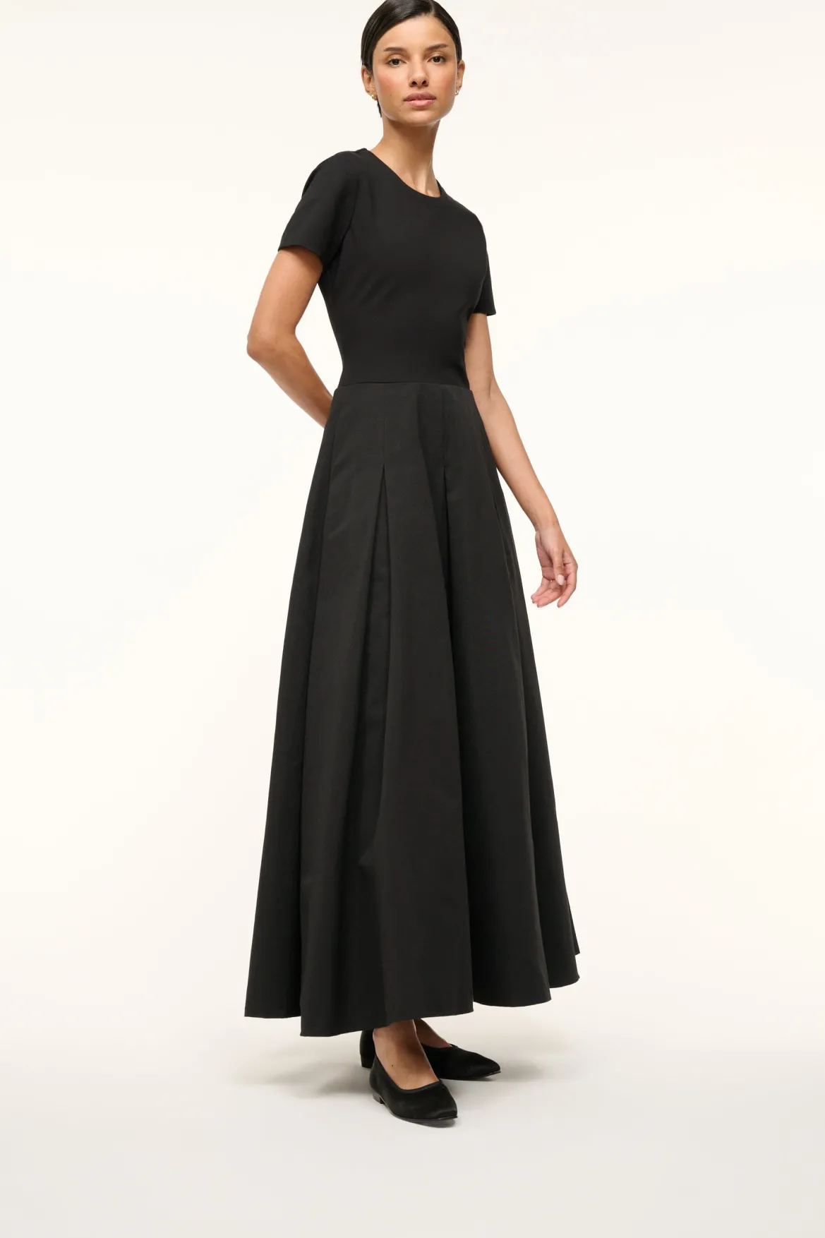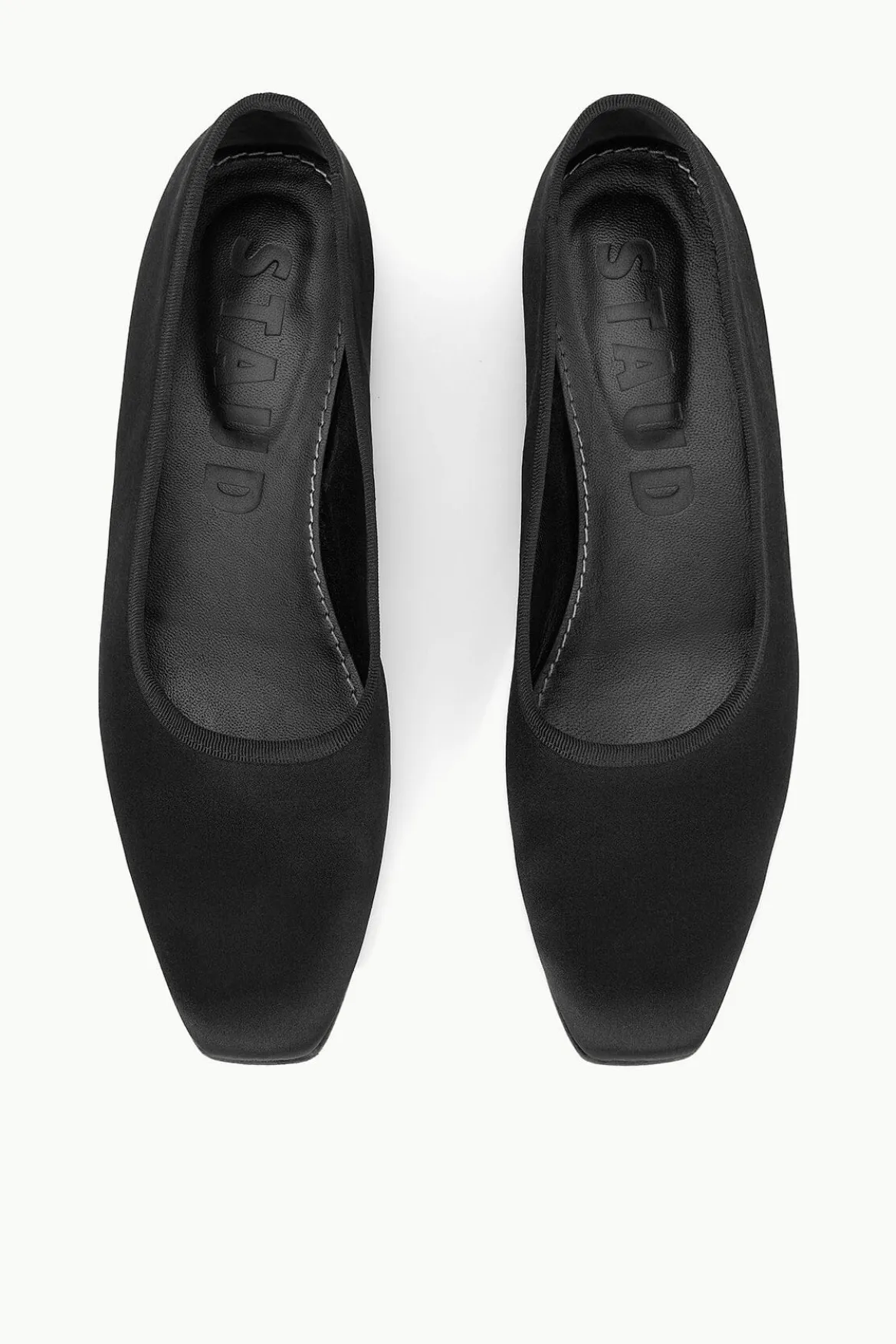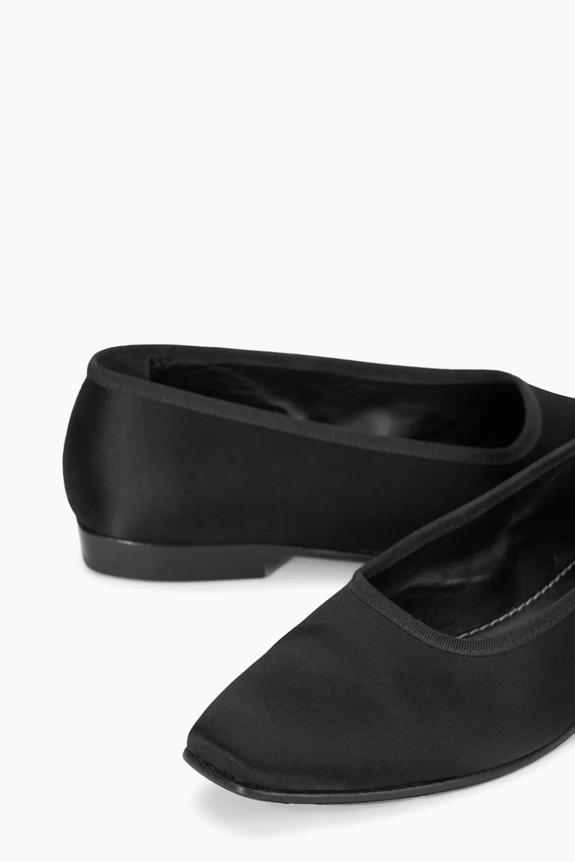 The Keith Ballet Flat is a satin flat with grosgrain trim featuring an elongated squared off toe.