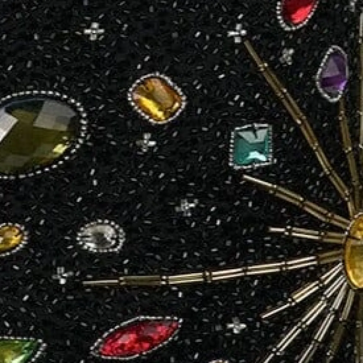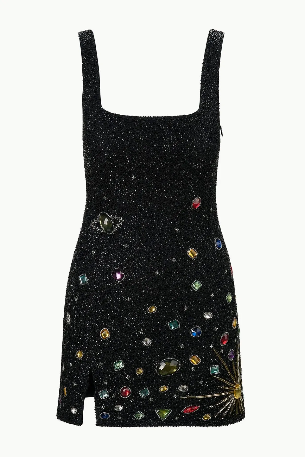 Our best-selling hand beaded mini dress has been updated in a galaxy-inspired pattern for the season. This style is fully beaded and features a slit and a hidden side zipper.