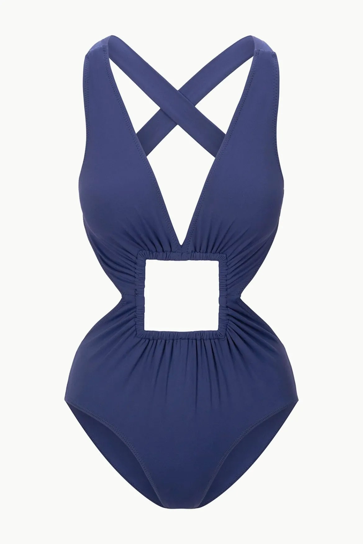 The Liberty One Piece features a self covered square shaped hardware detail at the center front, a plunging neckline and criss-cross straps at the upper back.