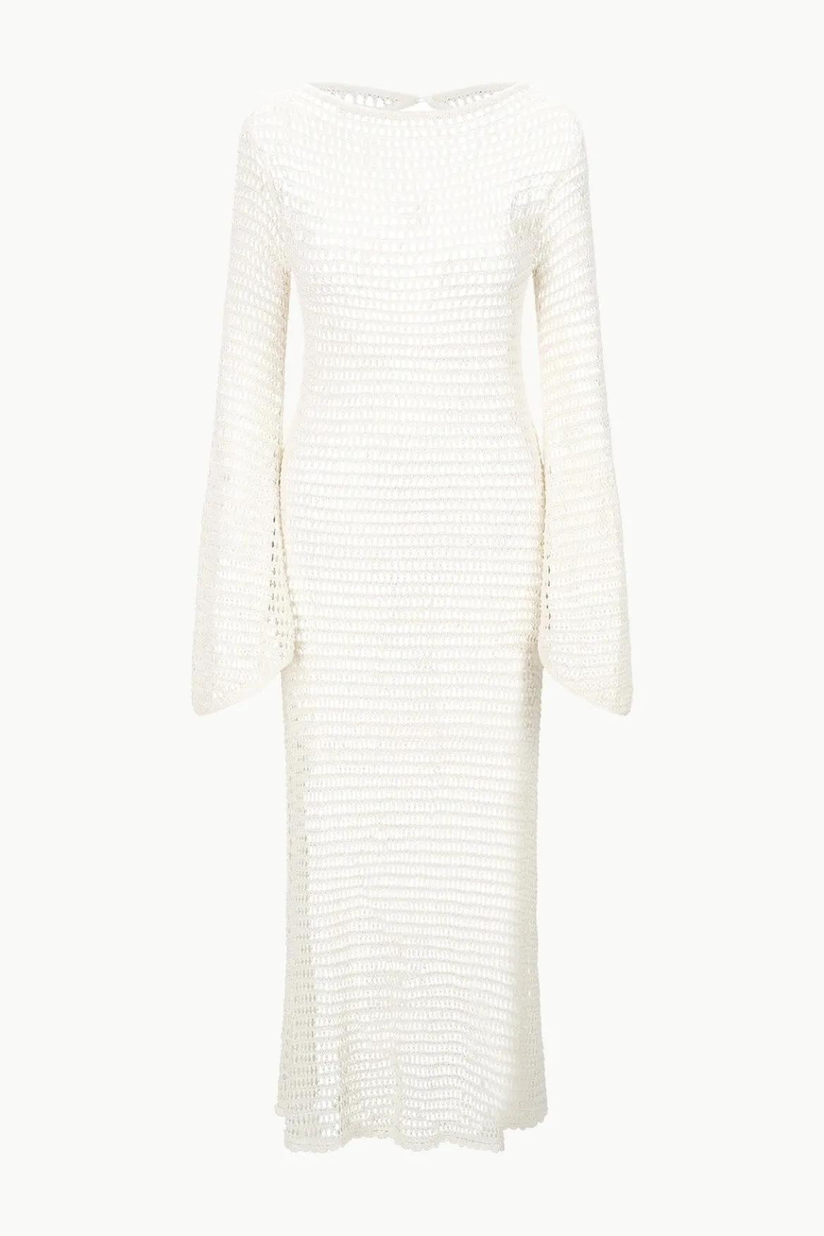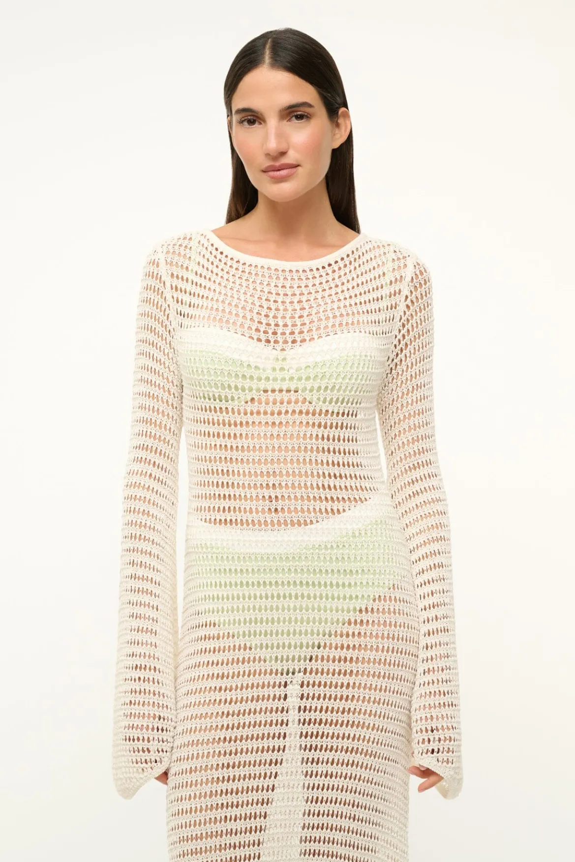 The Lorena Dress is a new maxi crochet dress, featuring a boat neckline and an open back. This style features a button closure at the neck, flared bell sleeves, and has an open weave.