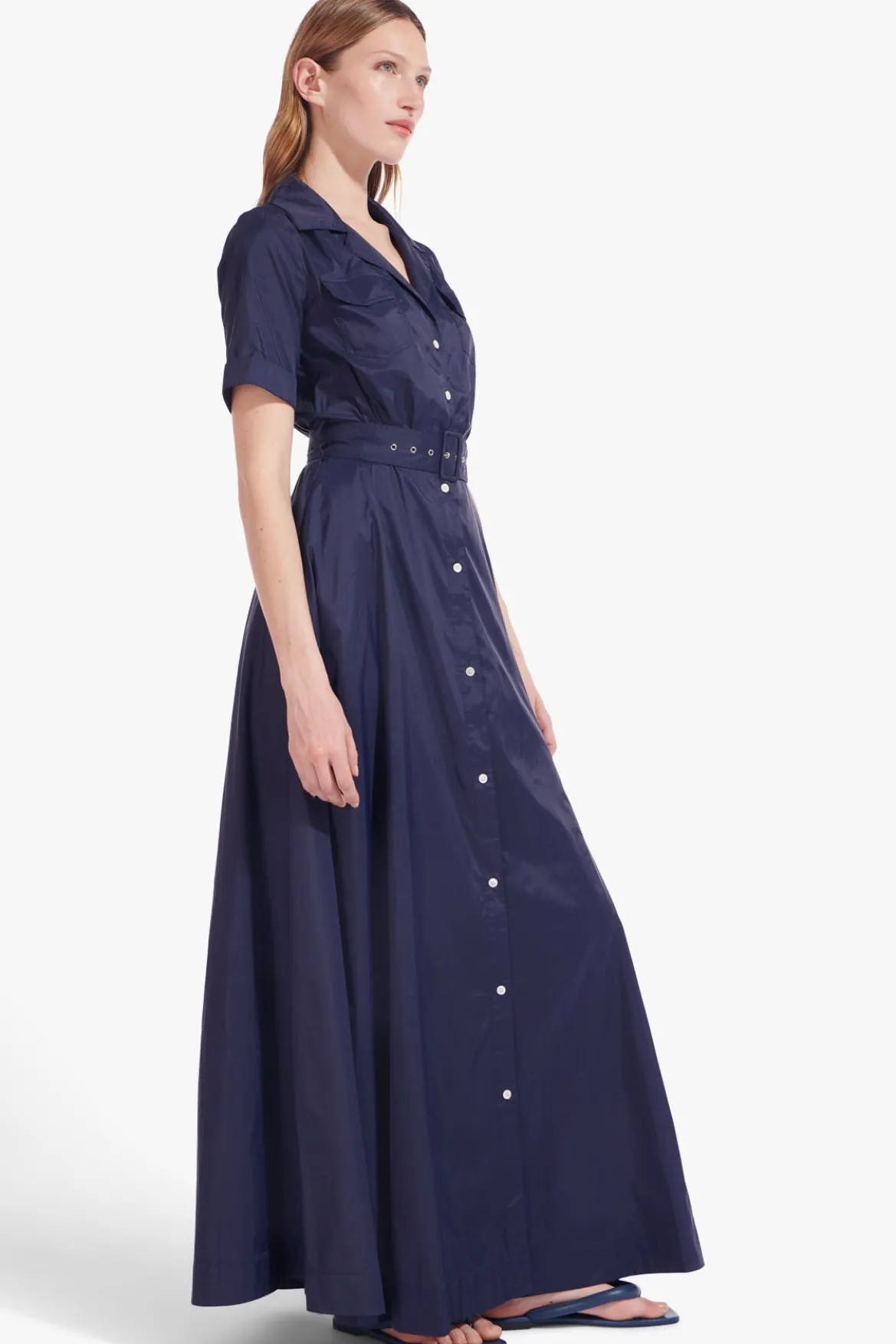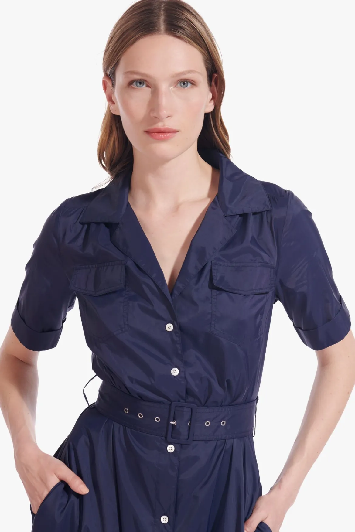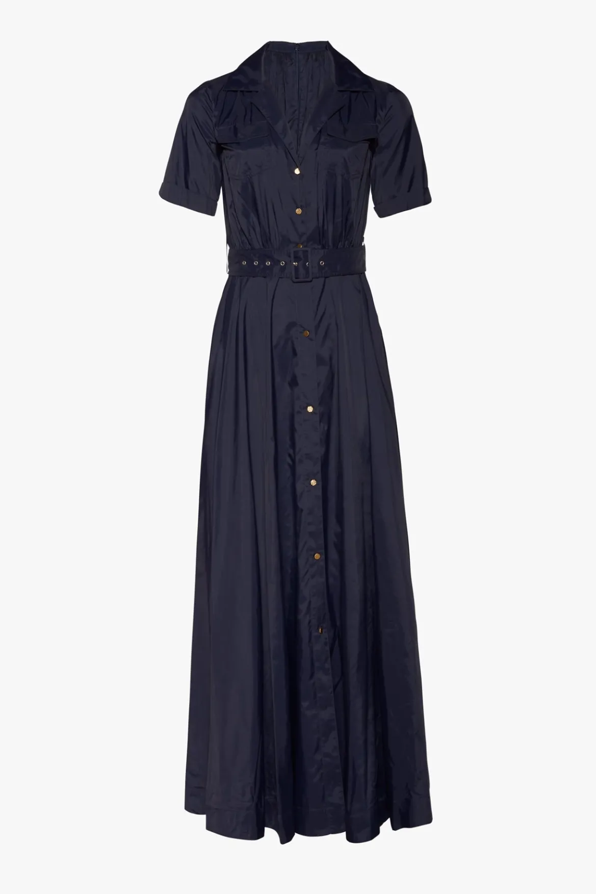 The Millie is a full length dress made out of our sustainable recycled tissue nylon. This dress features two front pockets, a button down front and matching belt.