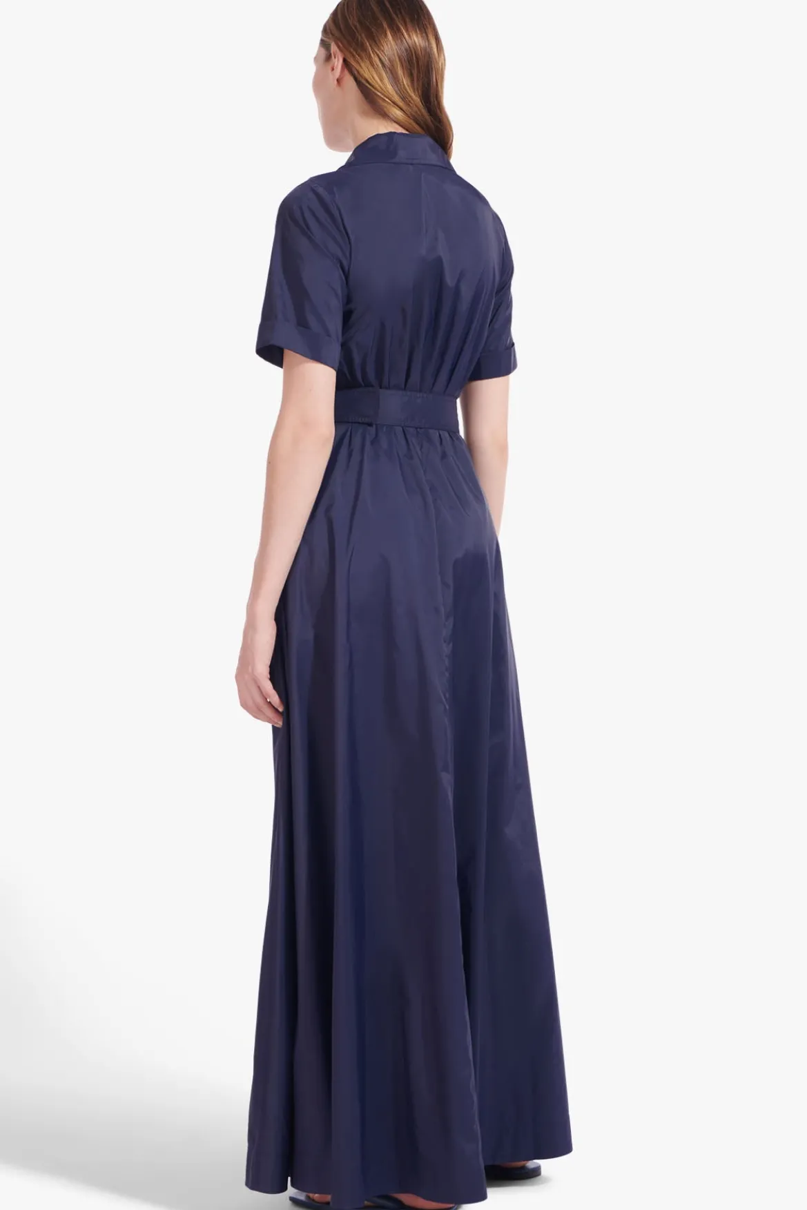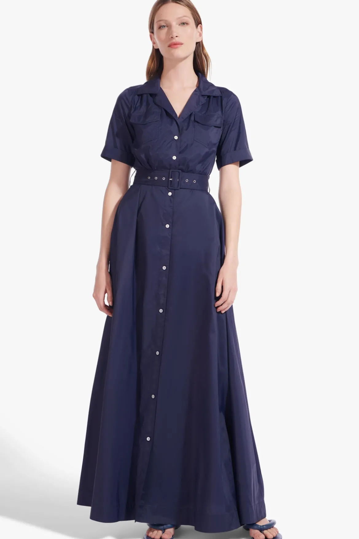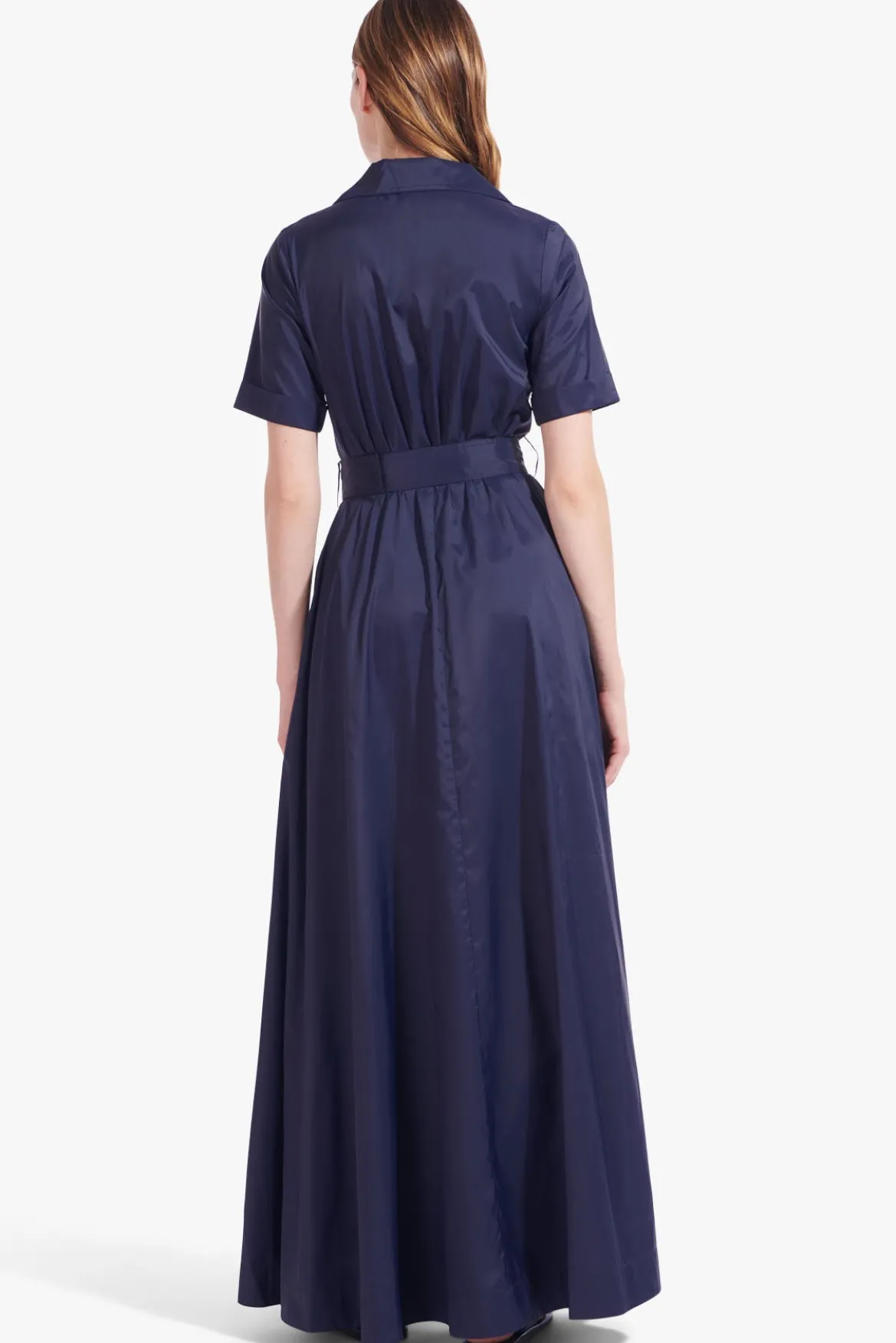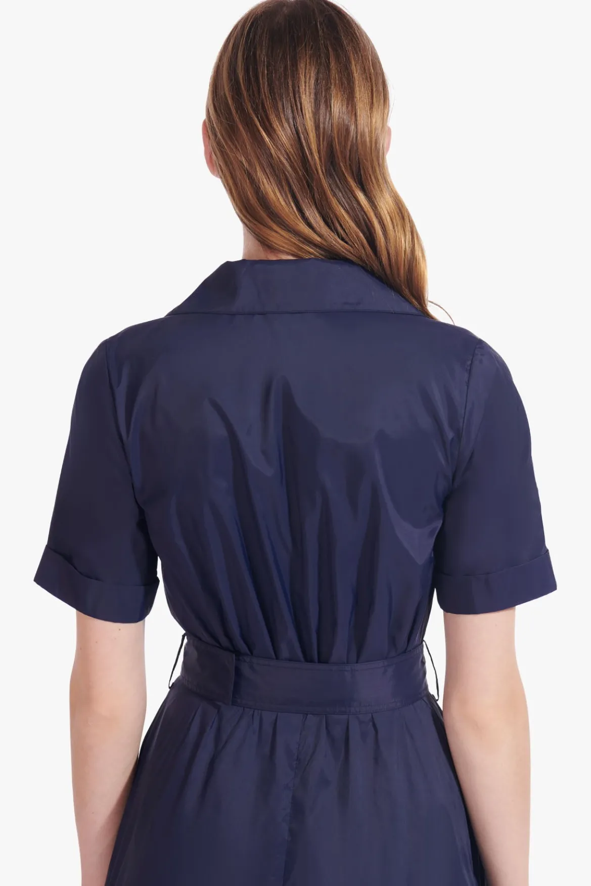 The Millie is a full length dress made out of our sustainable recycled tissue nylon. This dress features two front pockets, a button down front and matching belt.