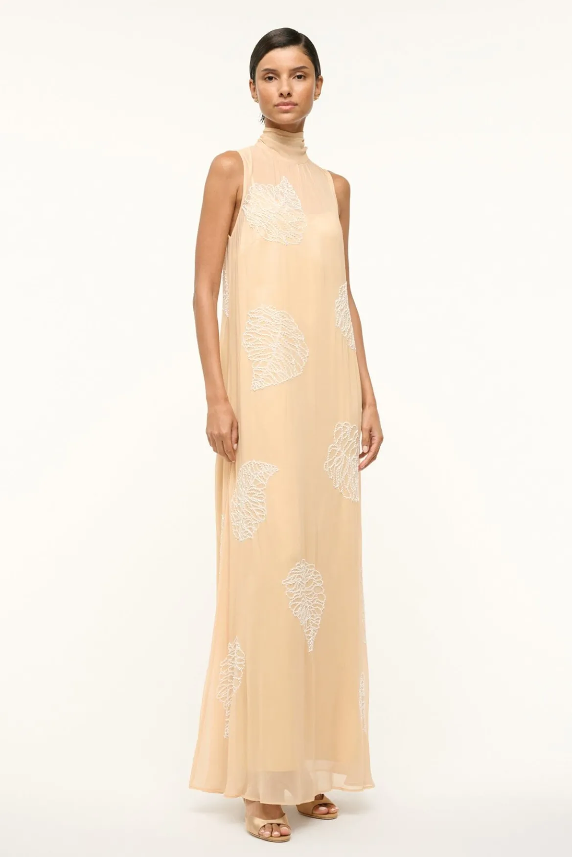 A sleeveless high neck dress made from beaded chiffon, the Rubi features a 3D palm leaf applique and back neck tie.
