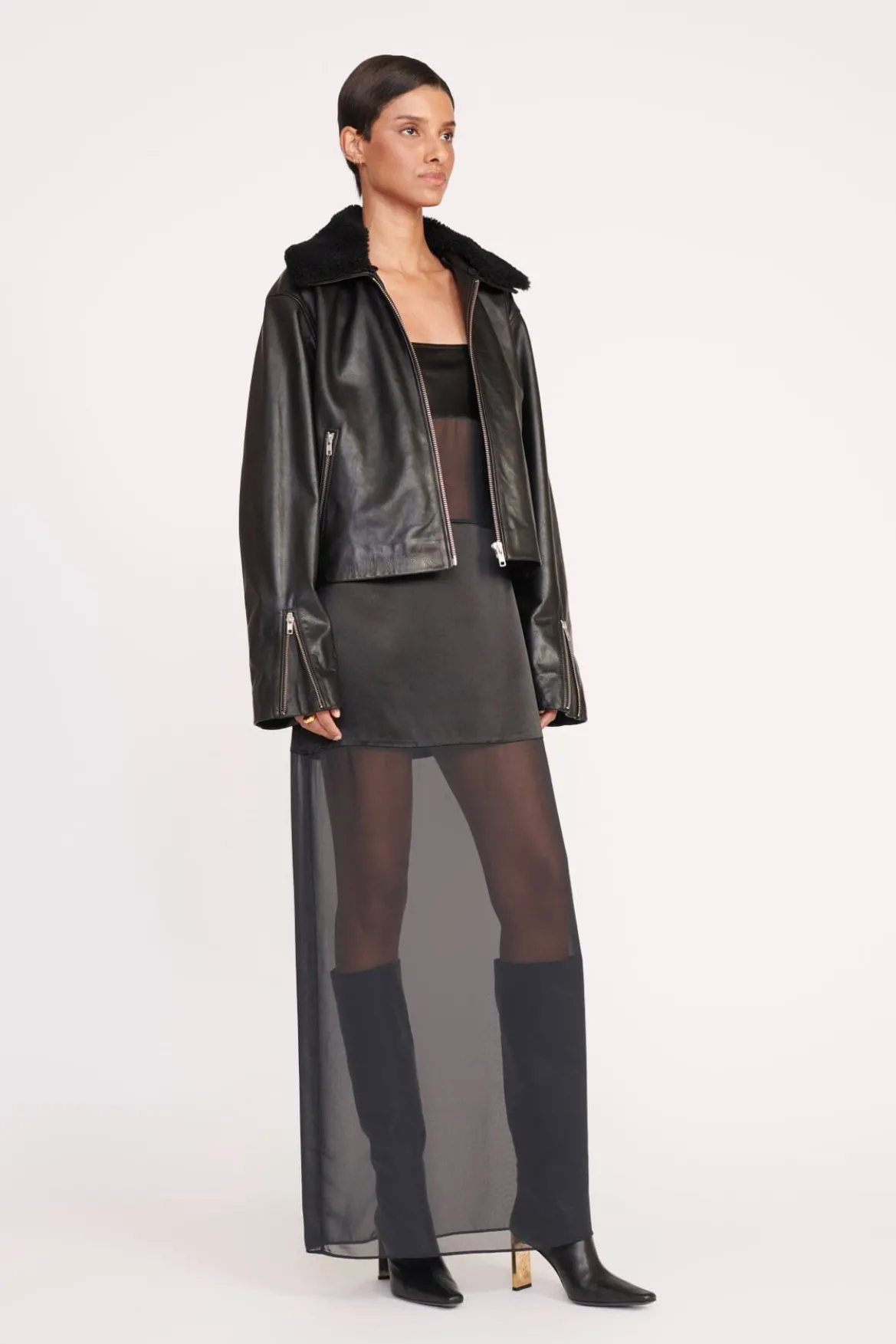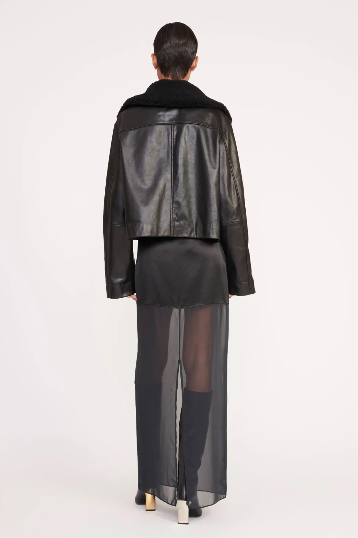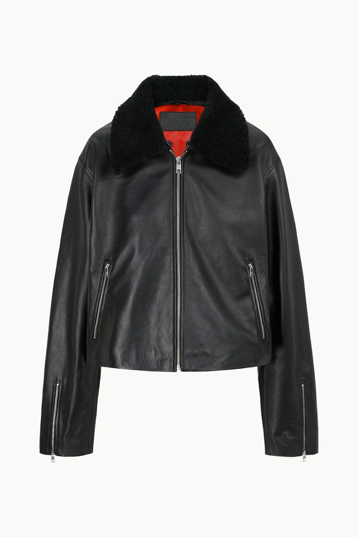 This style is a calf skin leather jacket with removable shearling collar. The Lenora Jacket features a cropped boxy fit and side zipper pocket details.
