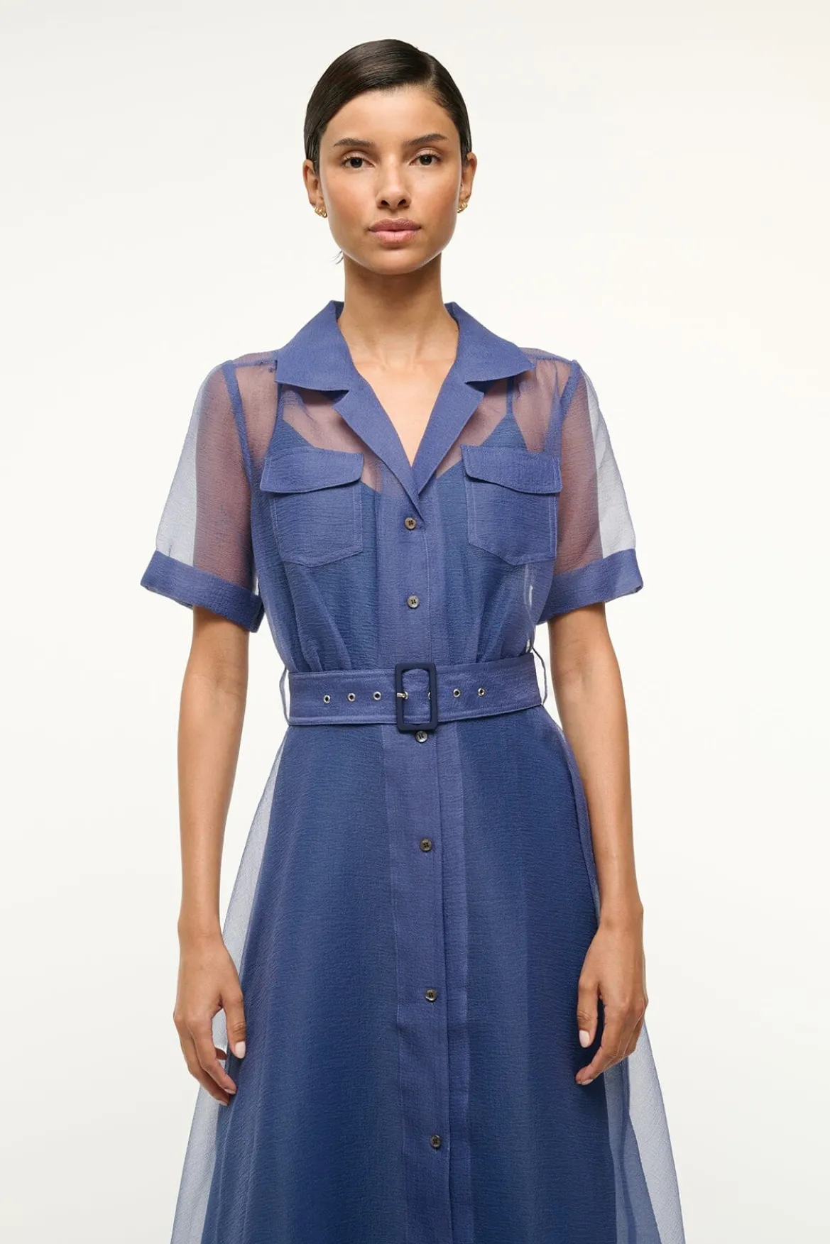 The Millie is a full length dress made out of organza. This dress features a slip, two front pockets, a button down front and matching belt.