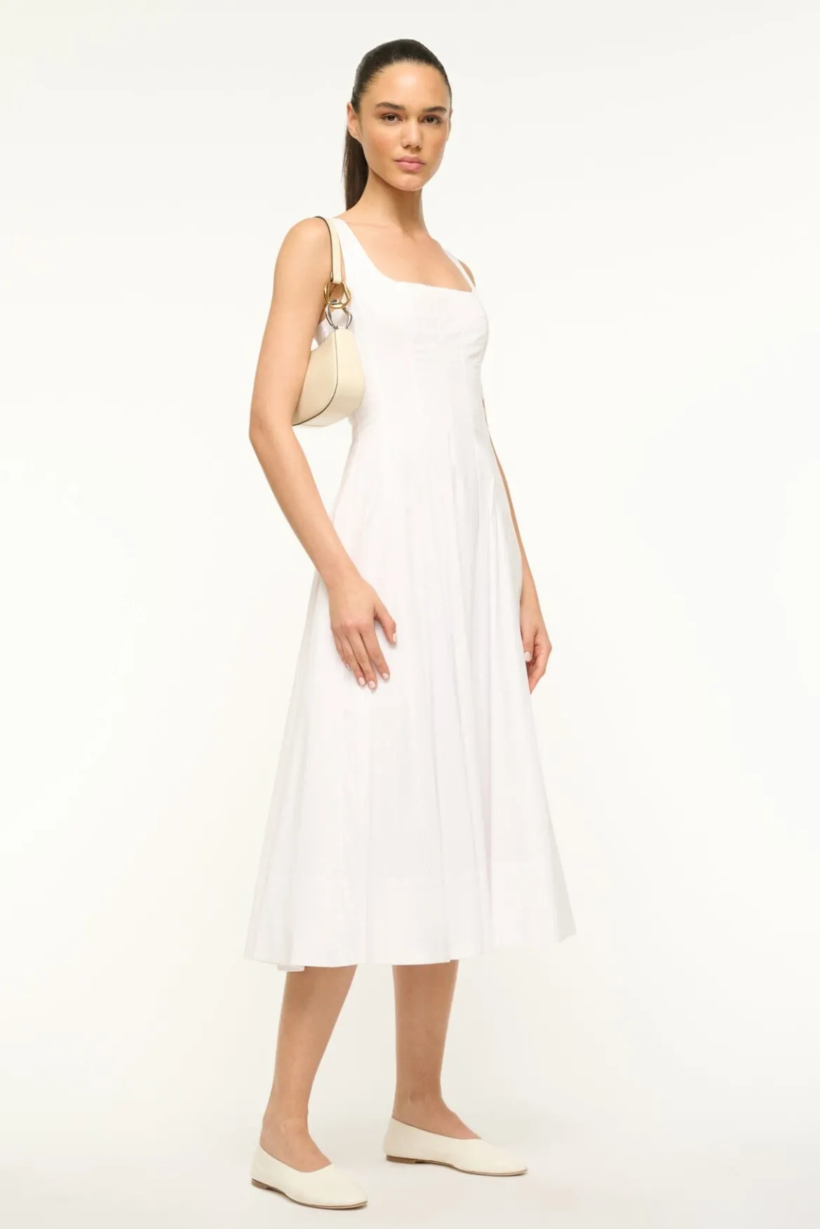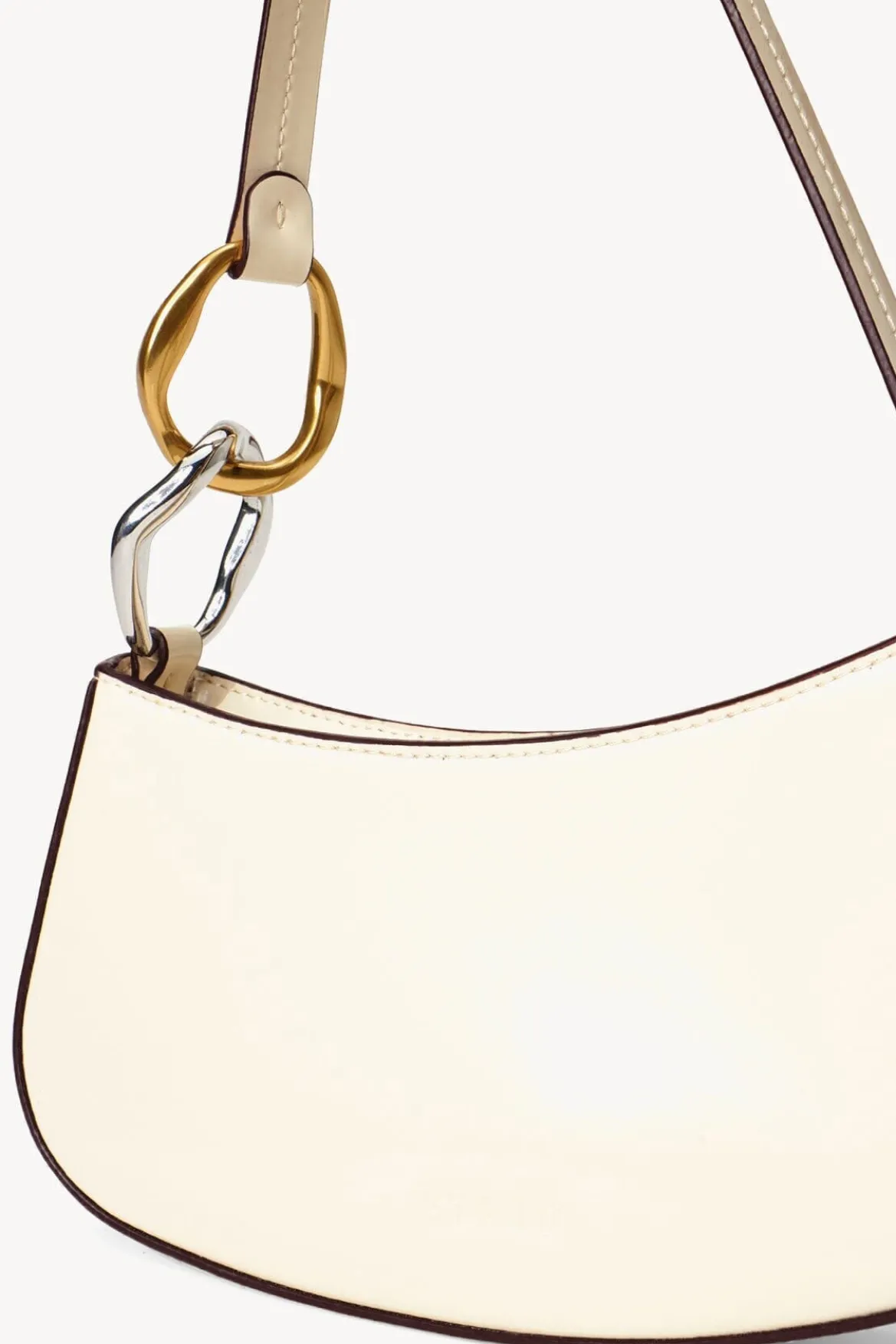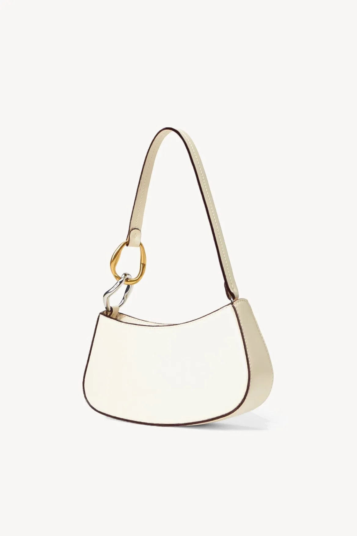 The Ollie Bag is a mini shoulder bag made out of polished leather. This style features a hardware design on the strap and a zip closure.