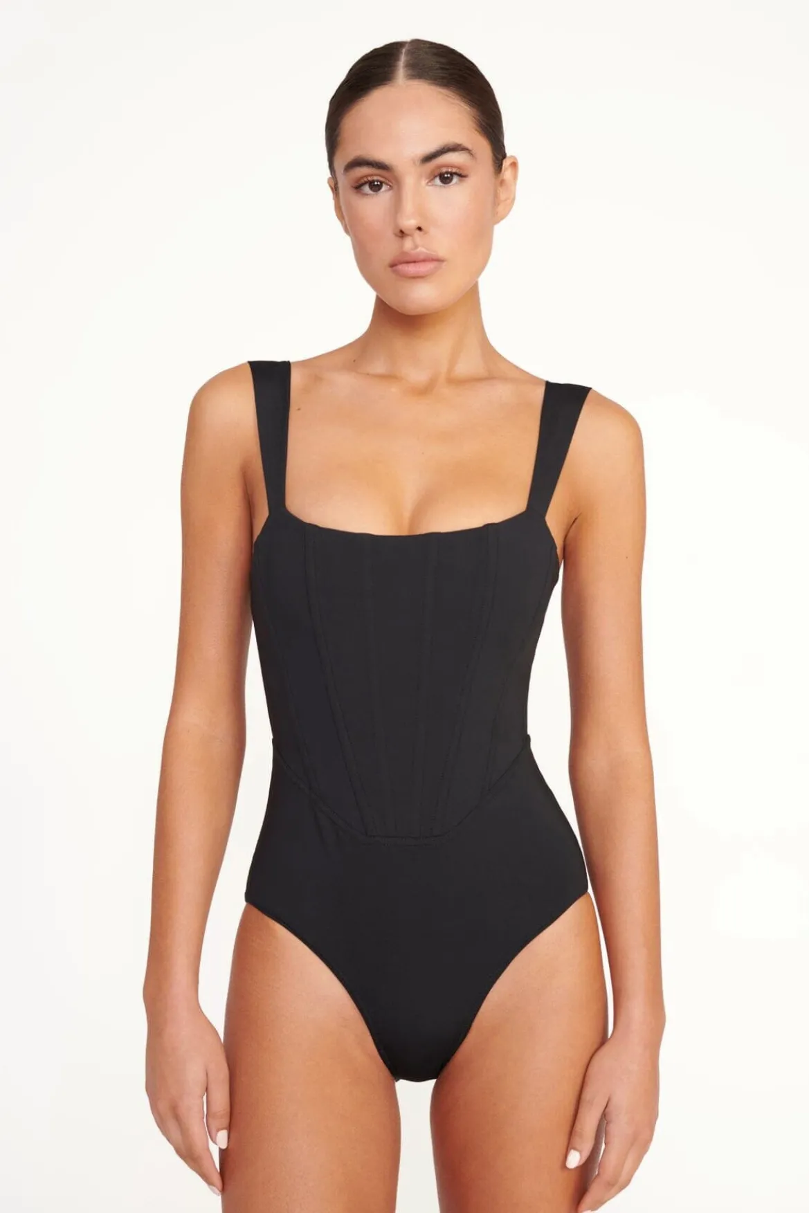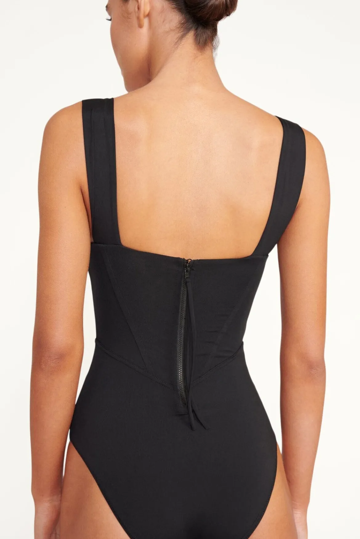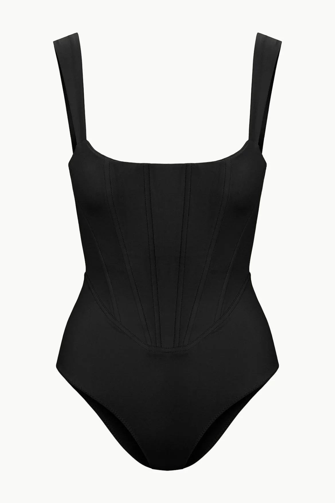 The Adelaide is a new one piece swimsuit with corset-style boning throughout the chest and torso. This style features zipper at the back and supportive shoulder straps.