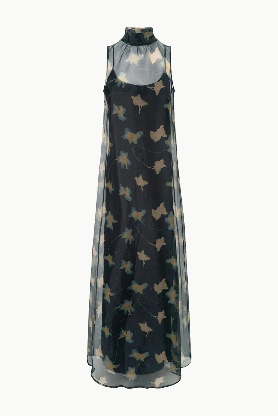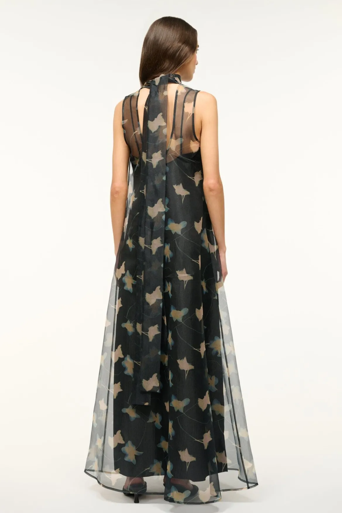 The Albee Dress is an organza sleeveless dress featuring a high neck with a functional tie in the back. This style is sheer and features an interior slip.