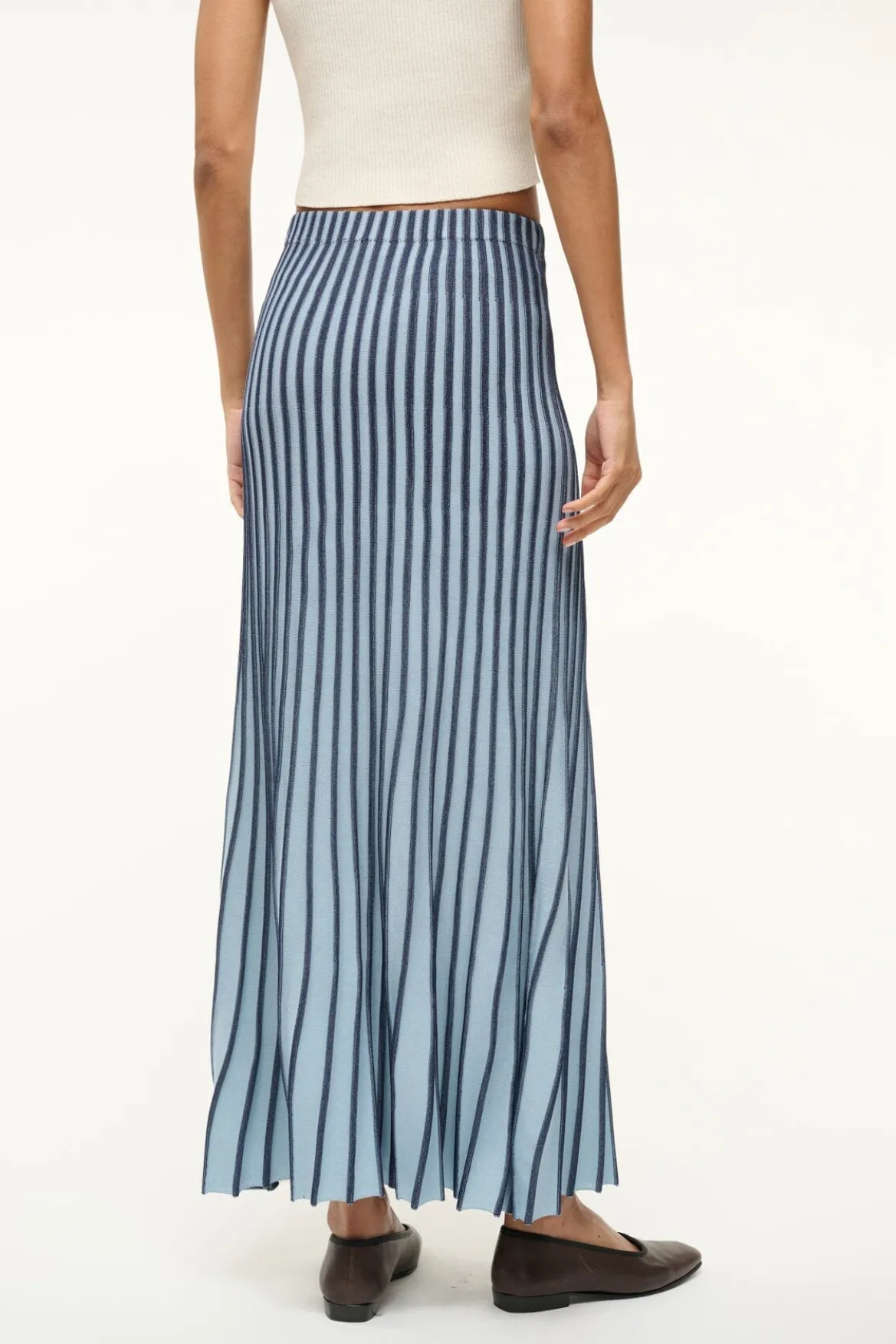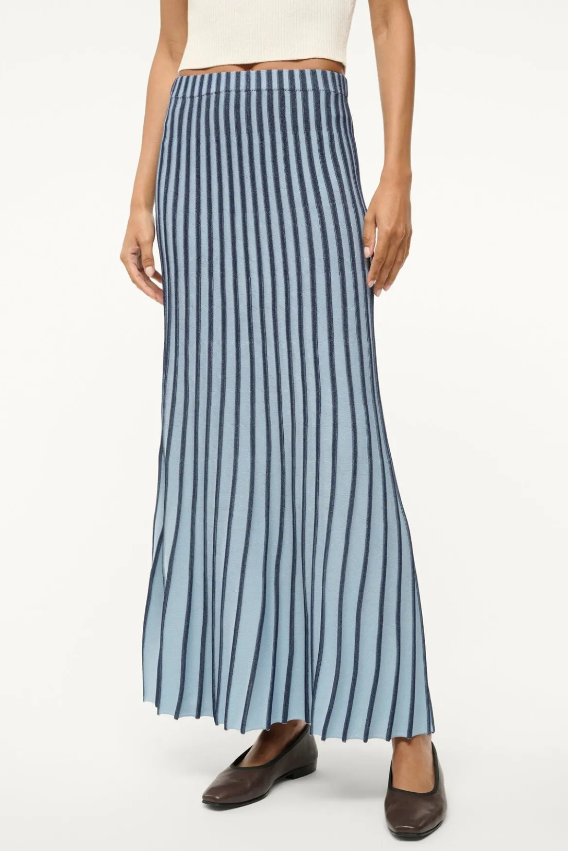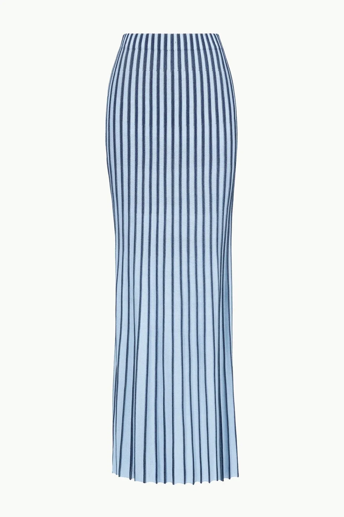 A maxi length skirt made out of a two-toned rib knit fabric. The Aleida Skirt features an elasticated waistband and slightly flared hem.