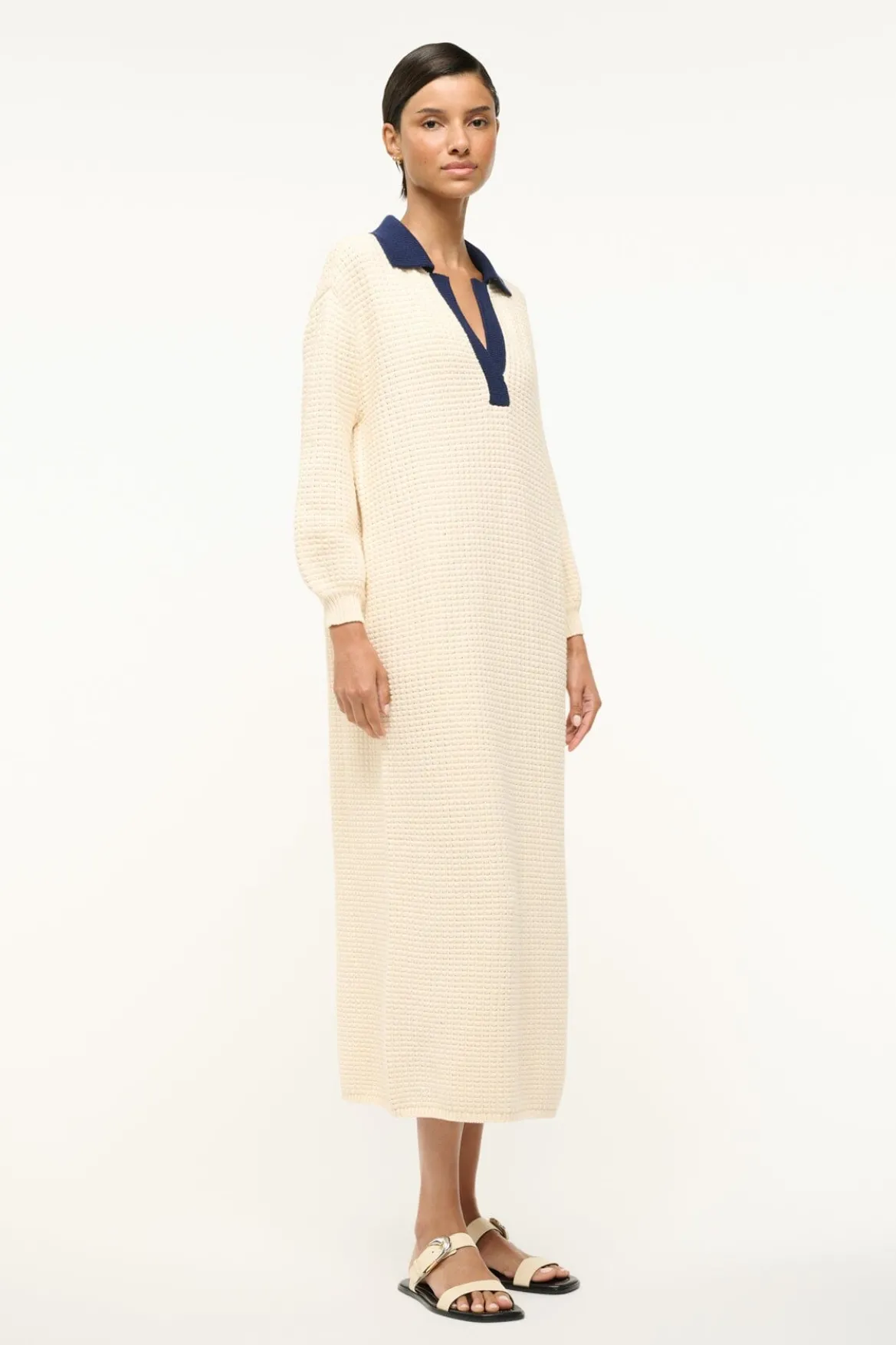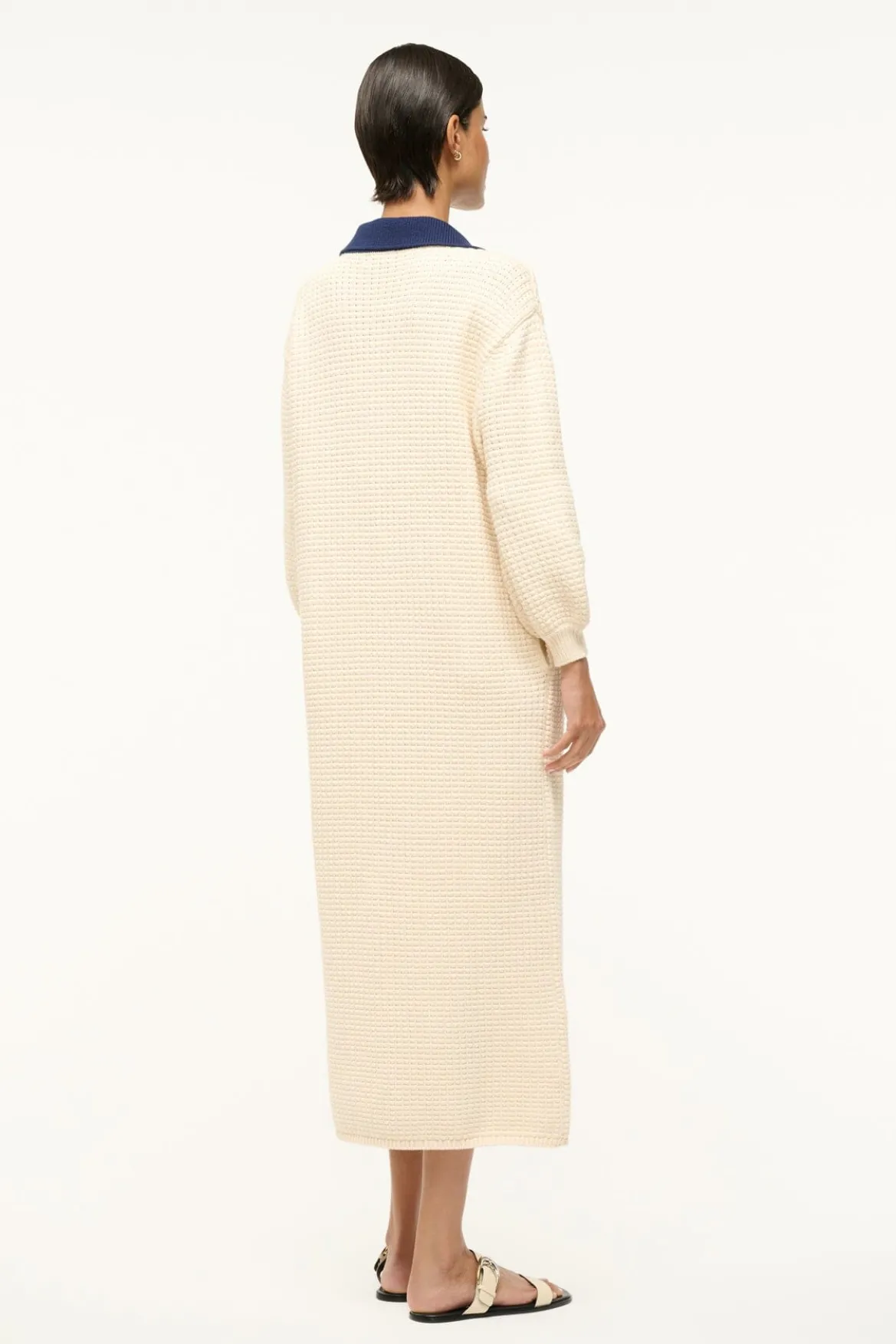 A cozy transitional piece, the Altea Dress is made out of a chunky cotton waffle knit fabric. This style features a long sleeve and a contrasting polo collar.