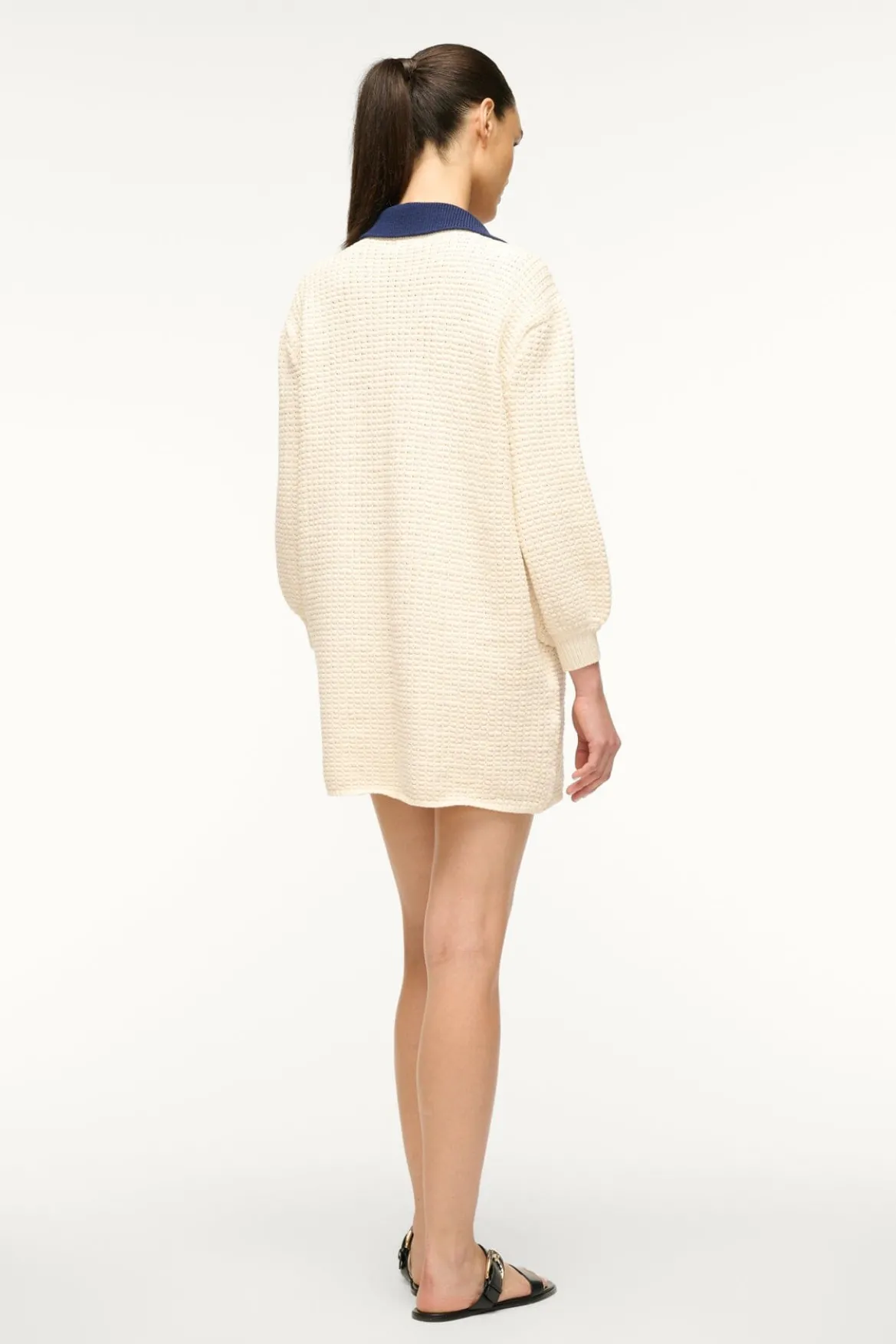 The Altea Mini Dress is made out of a chunky cotton waffle knit fabric and features a contrasting polo collar. This style offers a cozy, roomy silhouette with slightly billowy sleeves.
