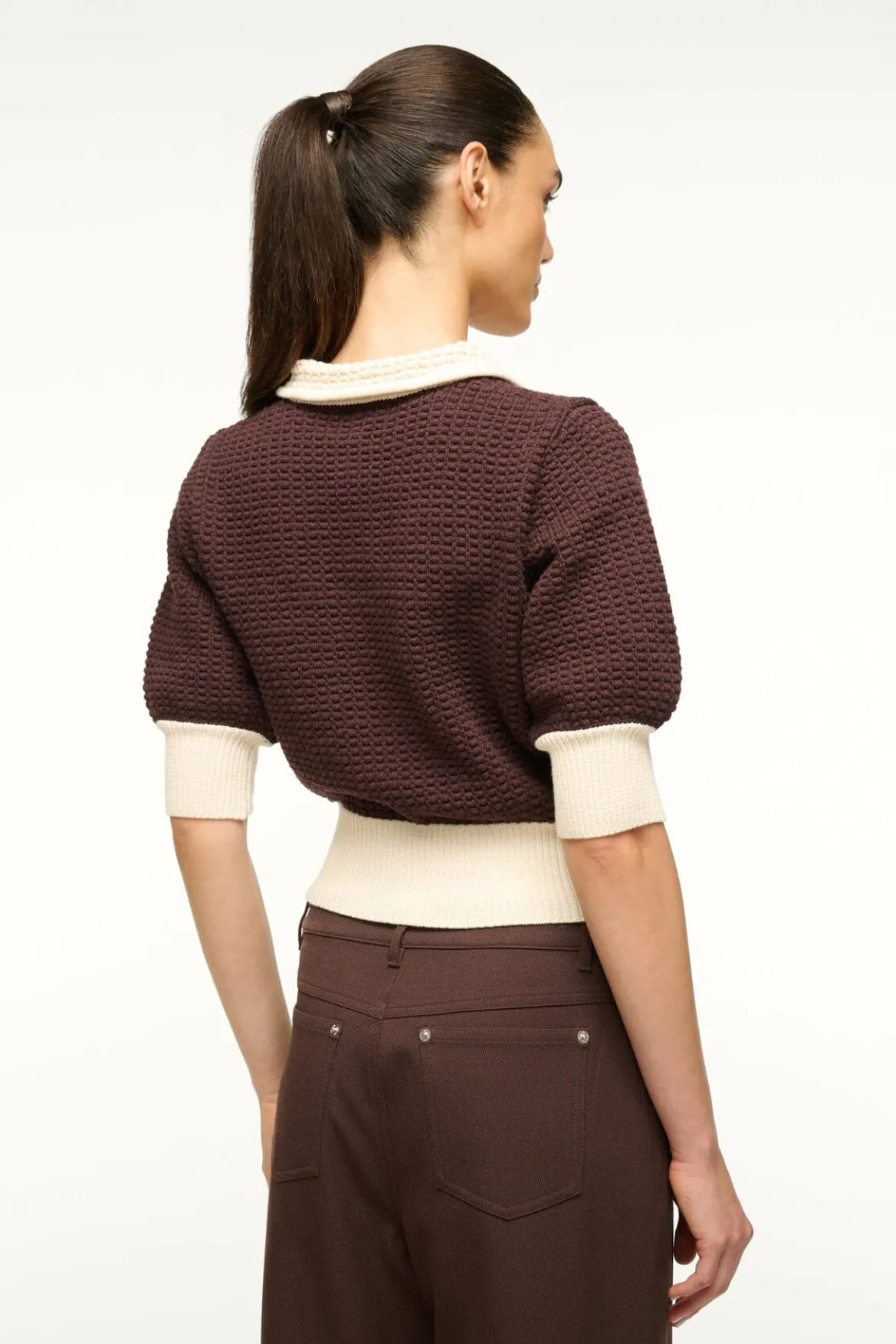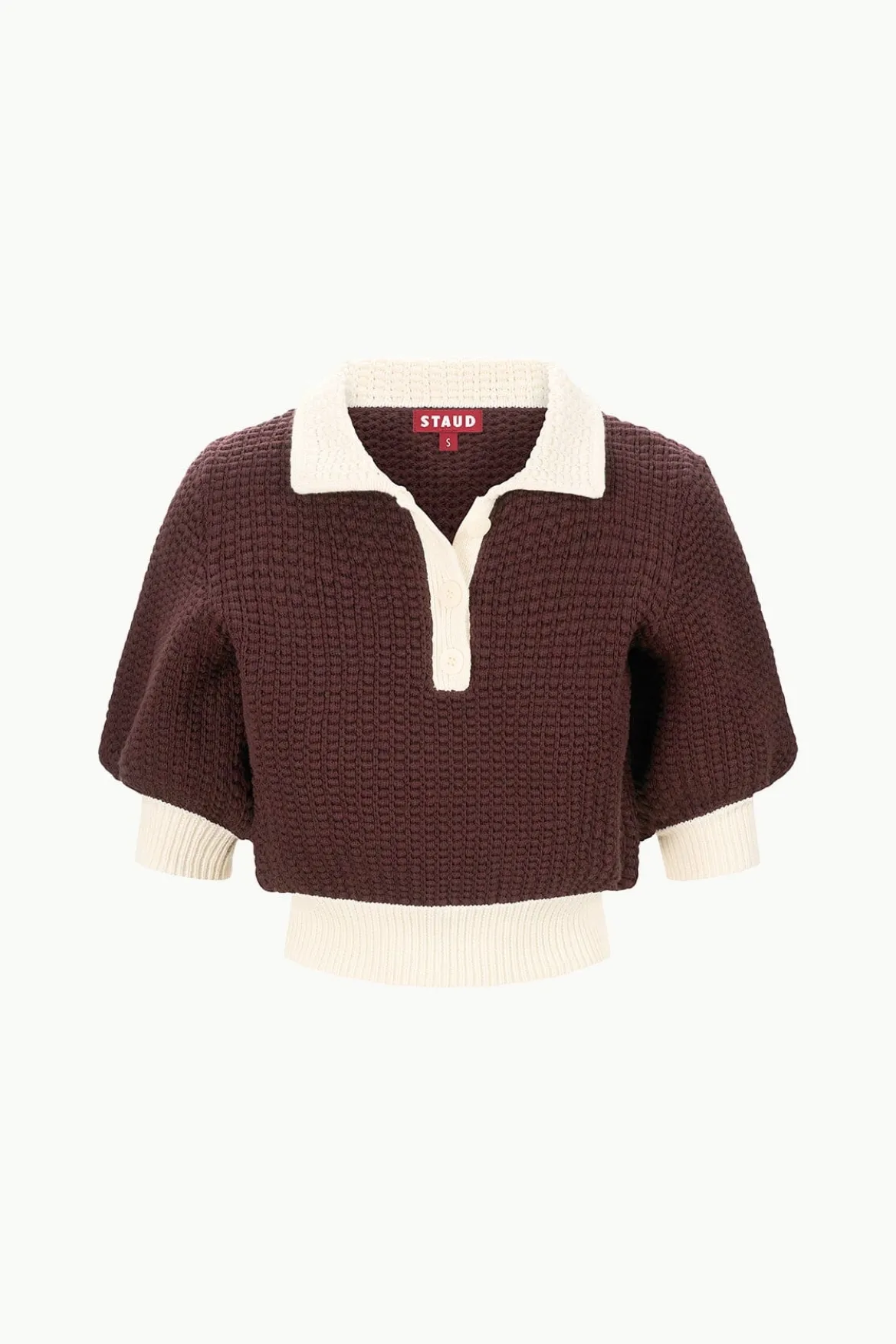 A short sleeve polo top, the Altea Sweater is made out of a chunky cotton waffle knit. This style features contrast cuffs, hem and collar.
