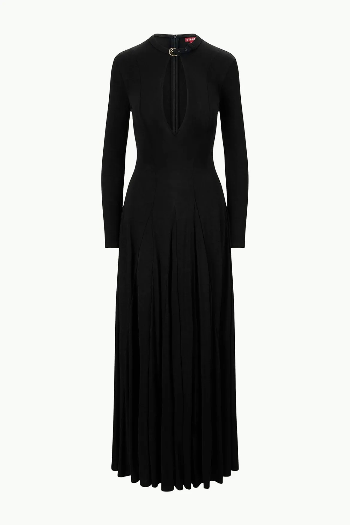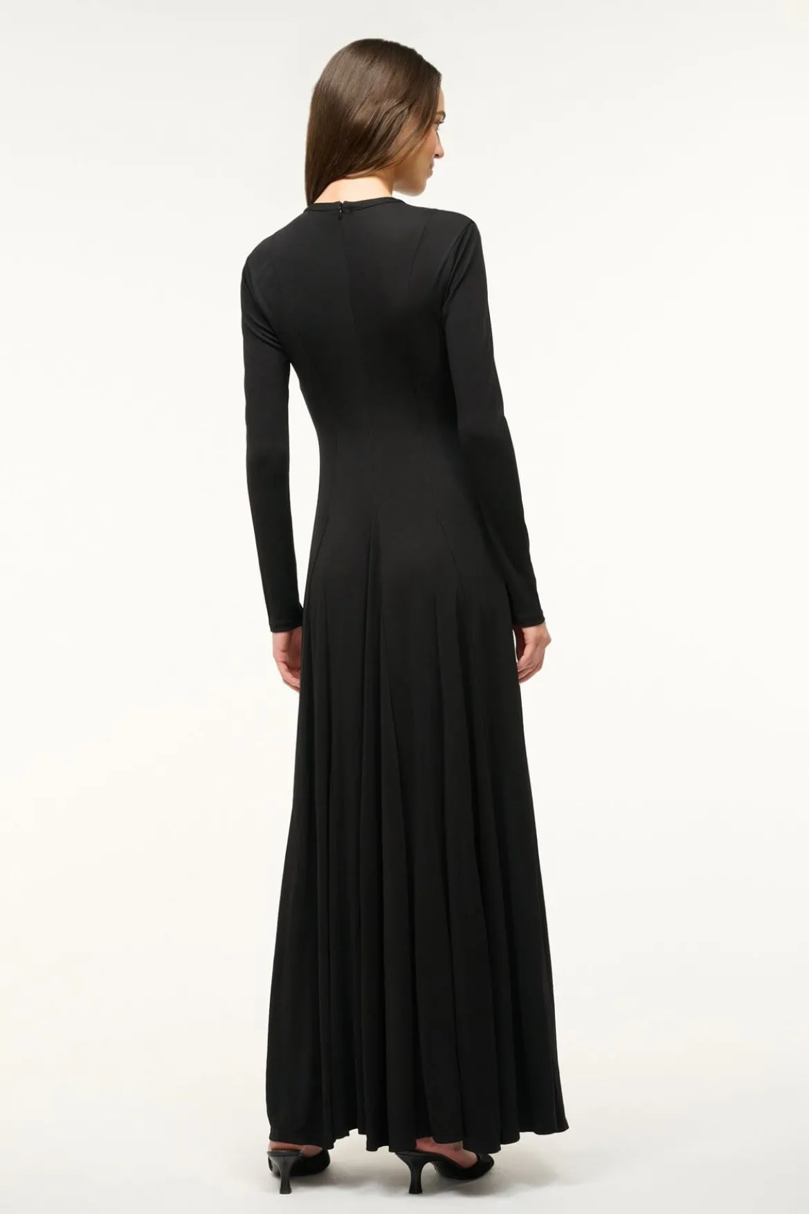 The Amerie Dress is a jersey long sleeve dress with a low v-neckline, a gold logo moon buckle closure, and a wide flowy sweep.
