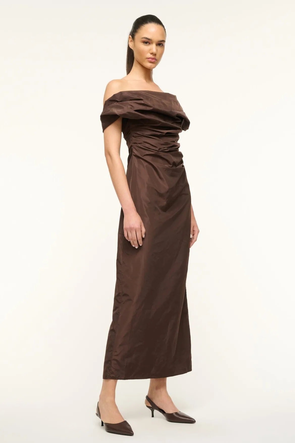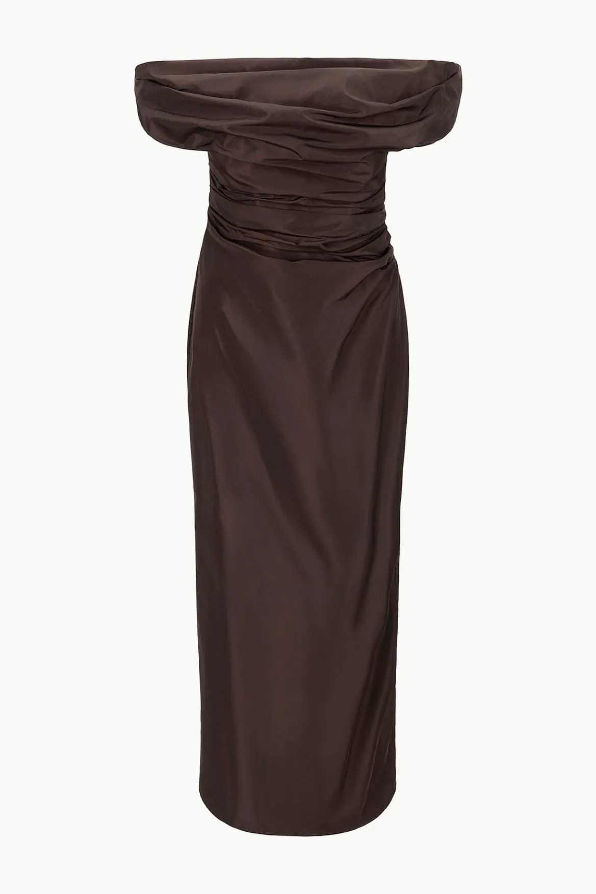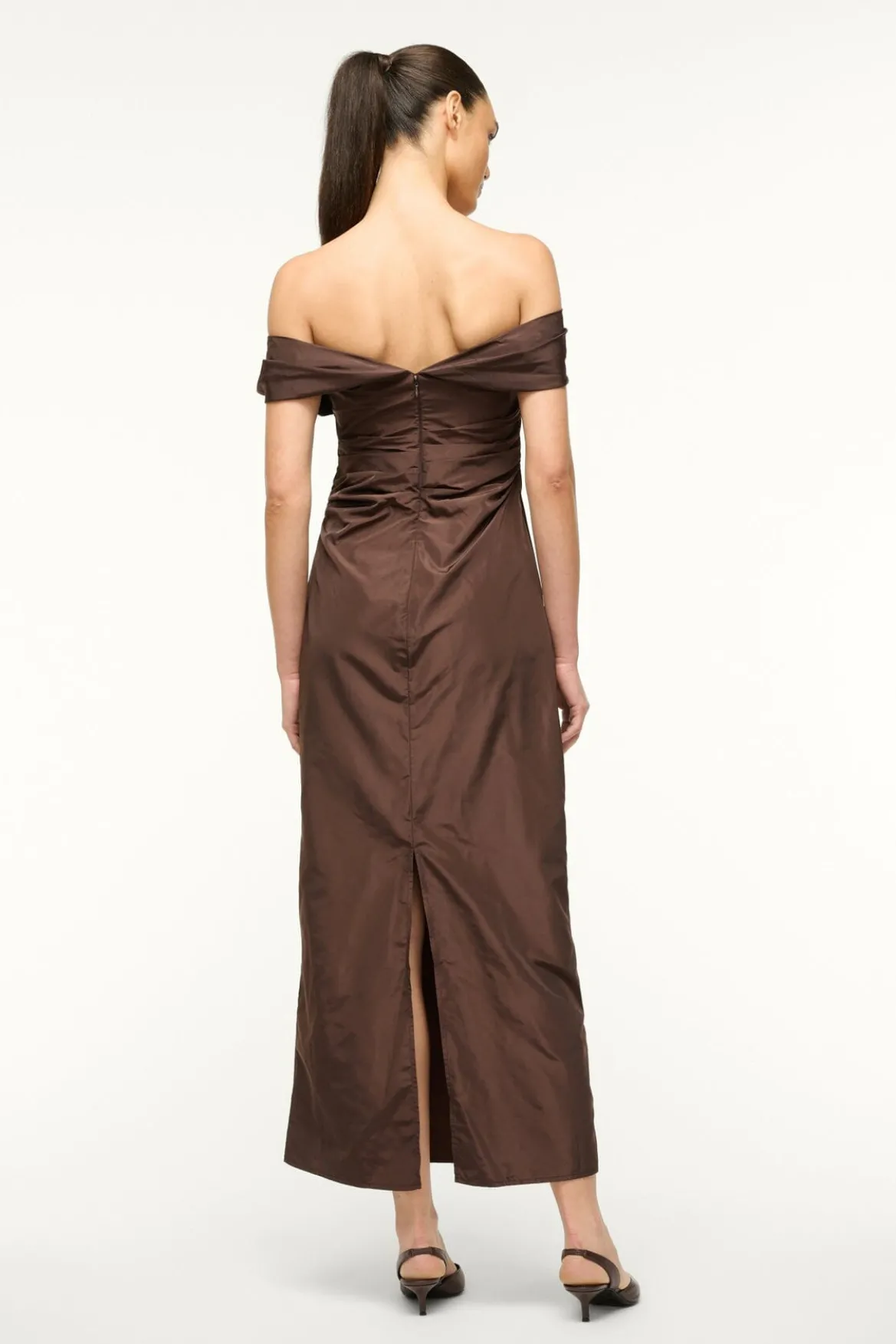 An of-the-shoulder dress crafted from a lustrous taffeta, the Andrea features a draped neckline detail and can be worn higher on the shoulders if desired.