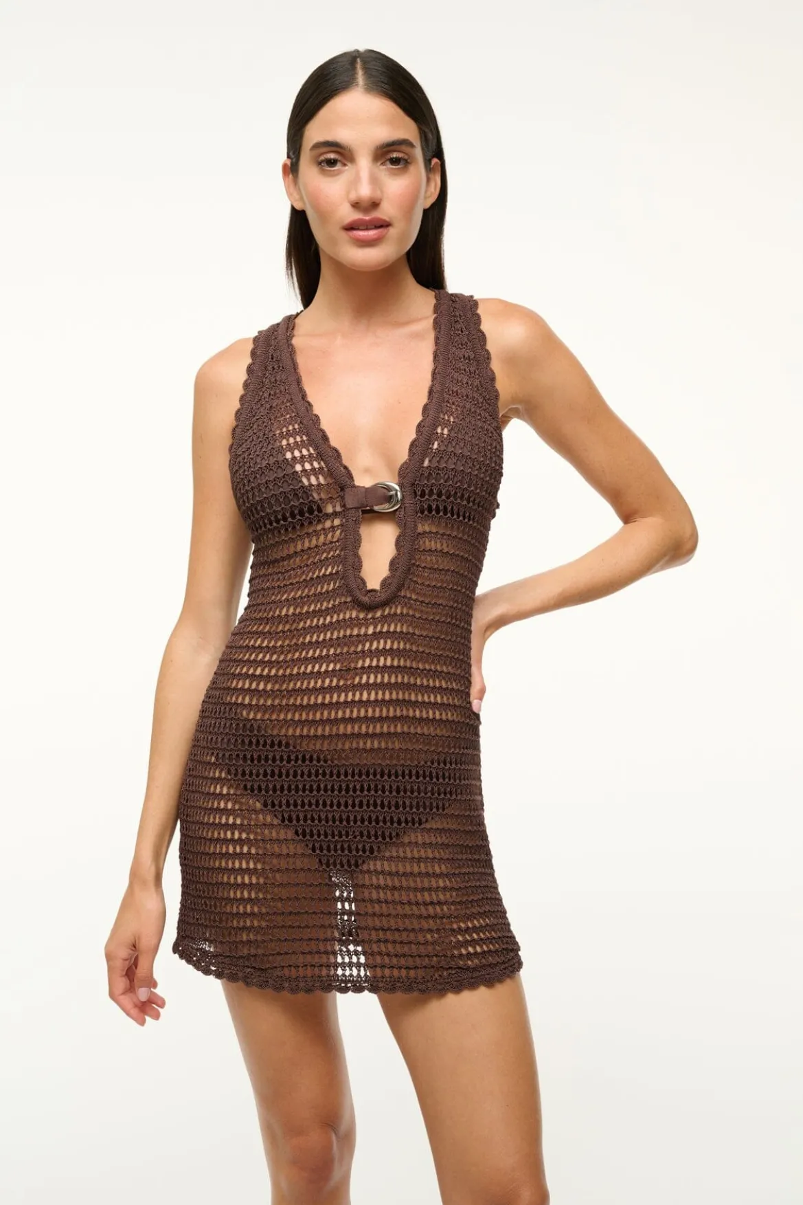 The Anok Dress is our latest crochet swim cover-up mini dress featuring our signature moon buckle hardware.