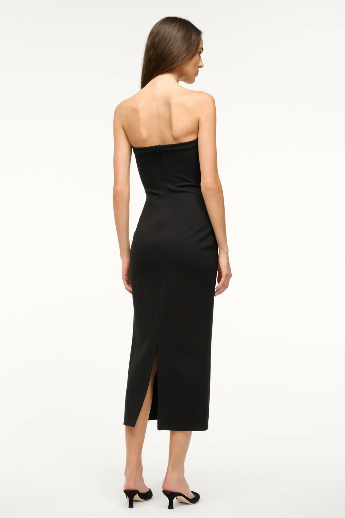 The Beekman is an ankle length strapless column dress with our signature moon buckle hardware at the neckline.