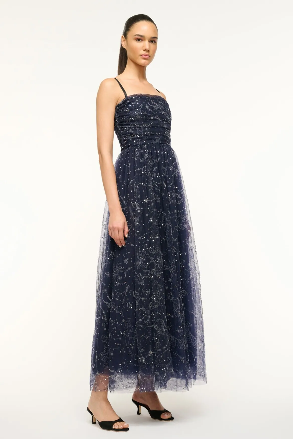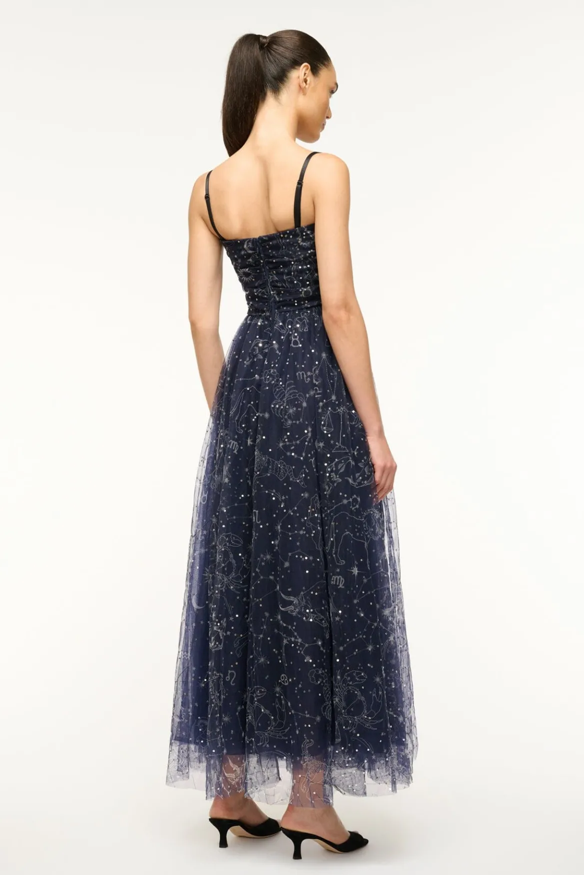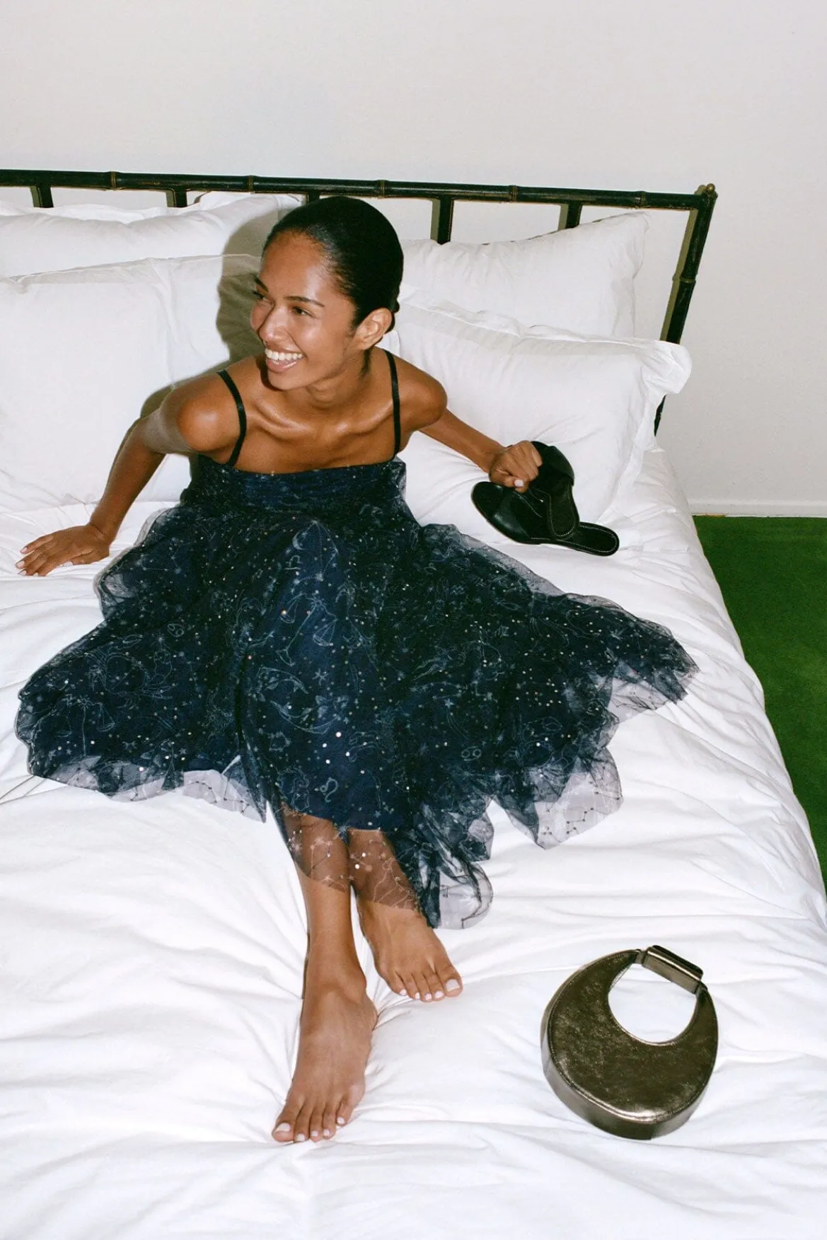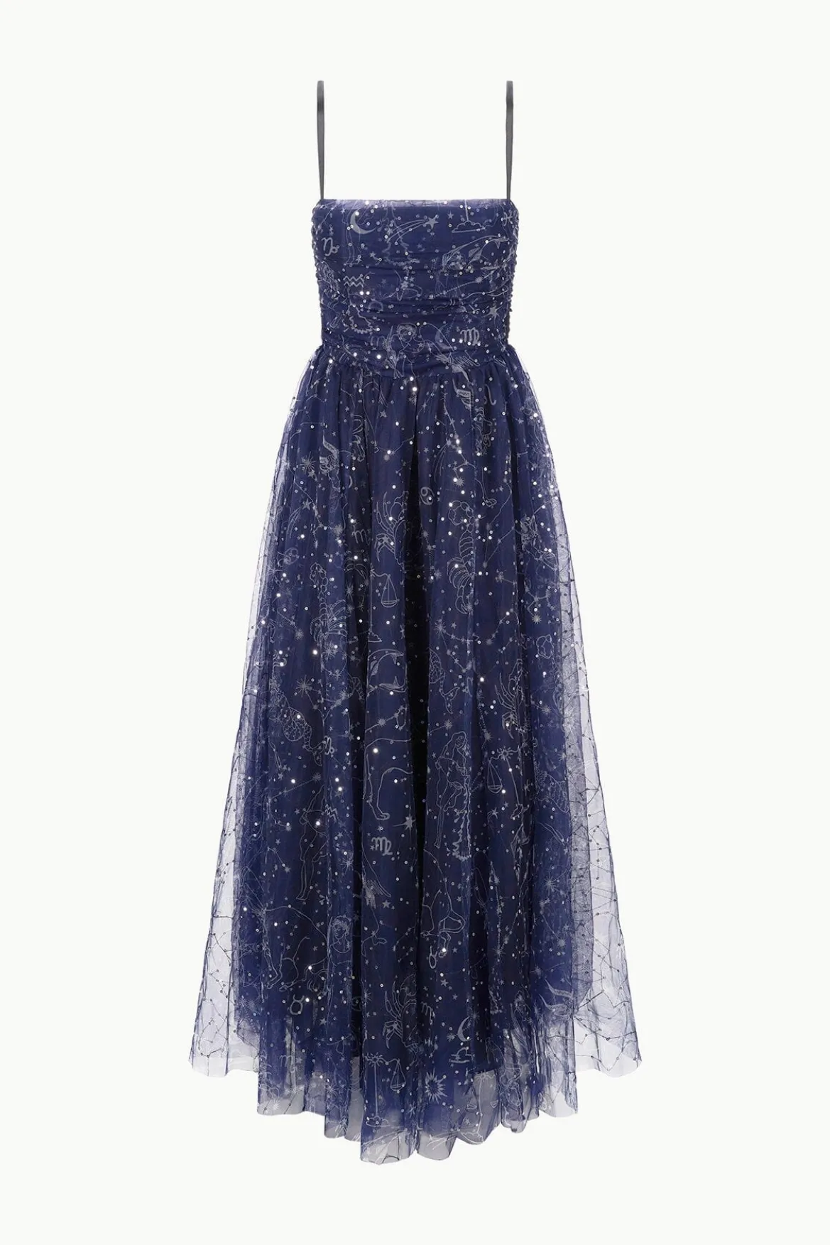 A sequin-embellished tulle gown featuring a constellation-inspired pattern. The Bettina Dress offers interior corsetting for a bustier-inspired bodice and detachable elastic straps.