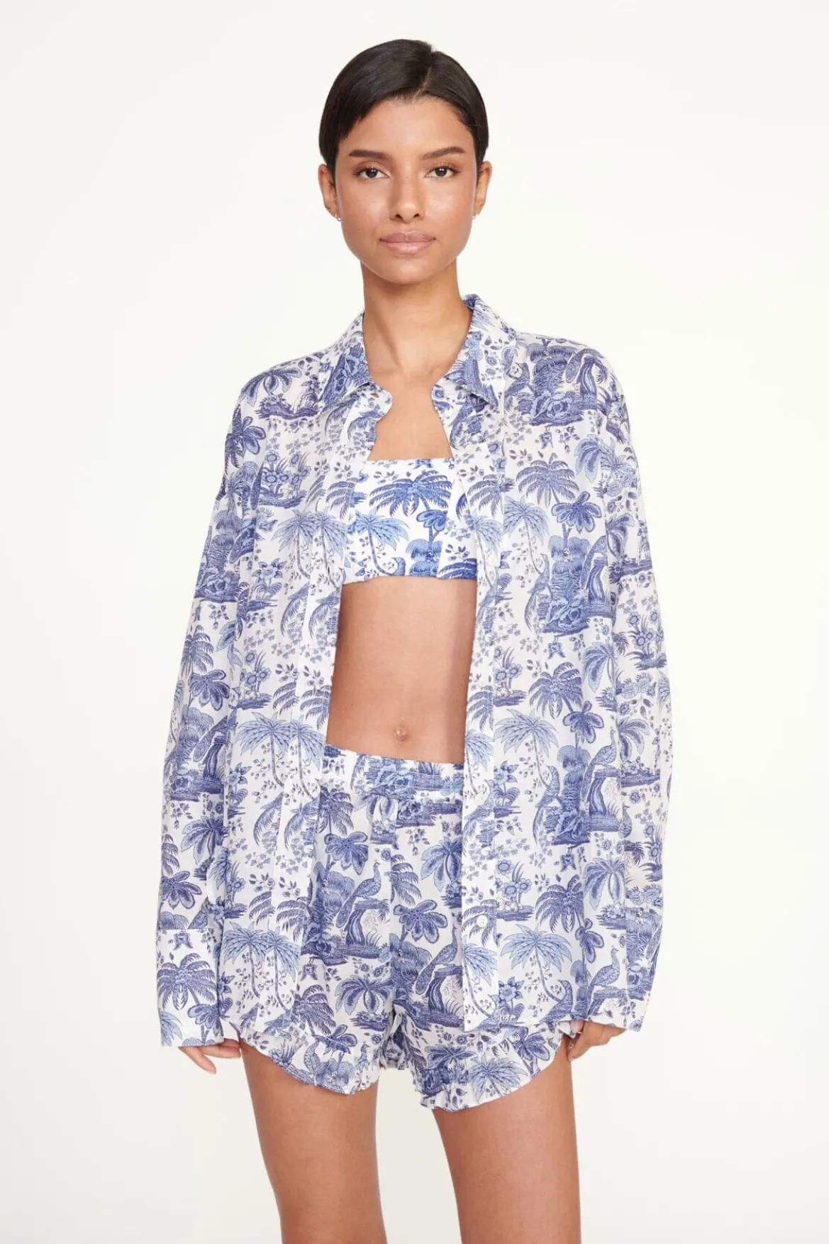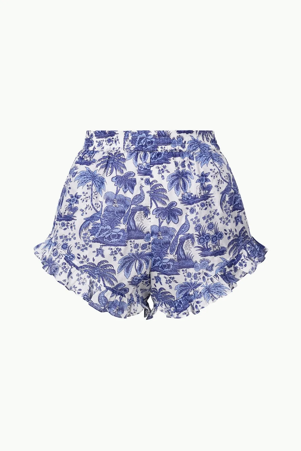 The Boyana Short is a pull-on coverup short with an elastic waistband. This style is slightly oversized and features aruffle at the leg opening.