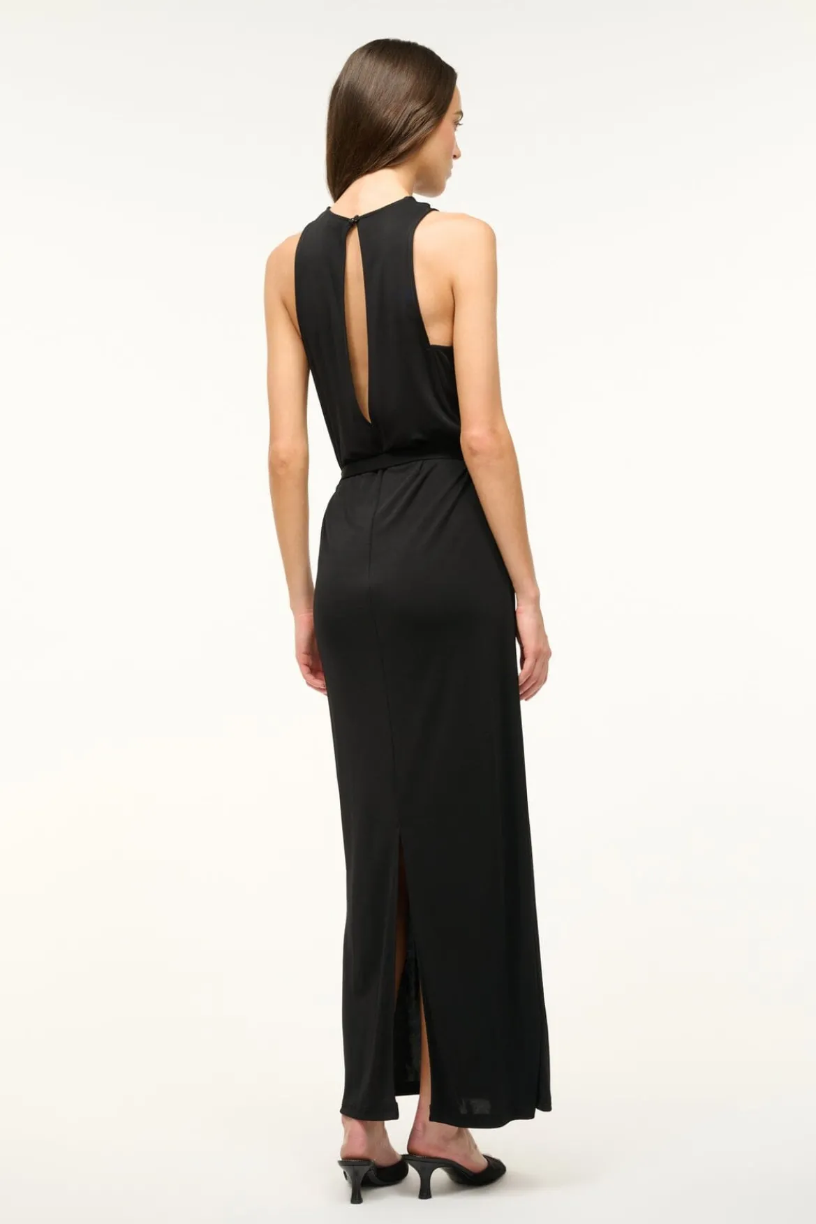 The Brandy is a maxi length dress with a high neckline and waist belt featuring our signature moon buckle hardware.