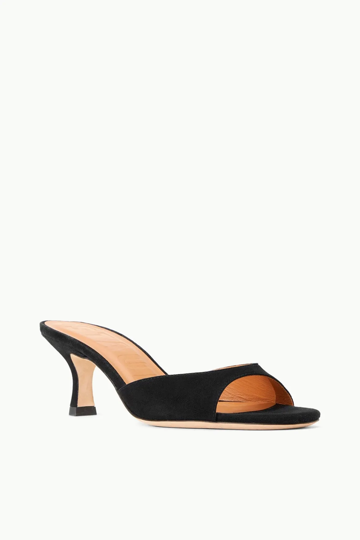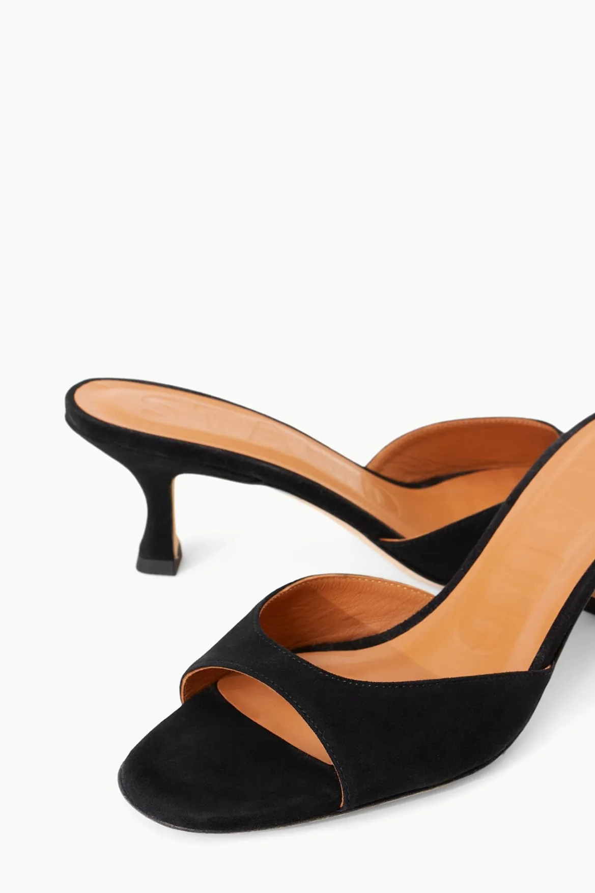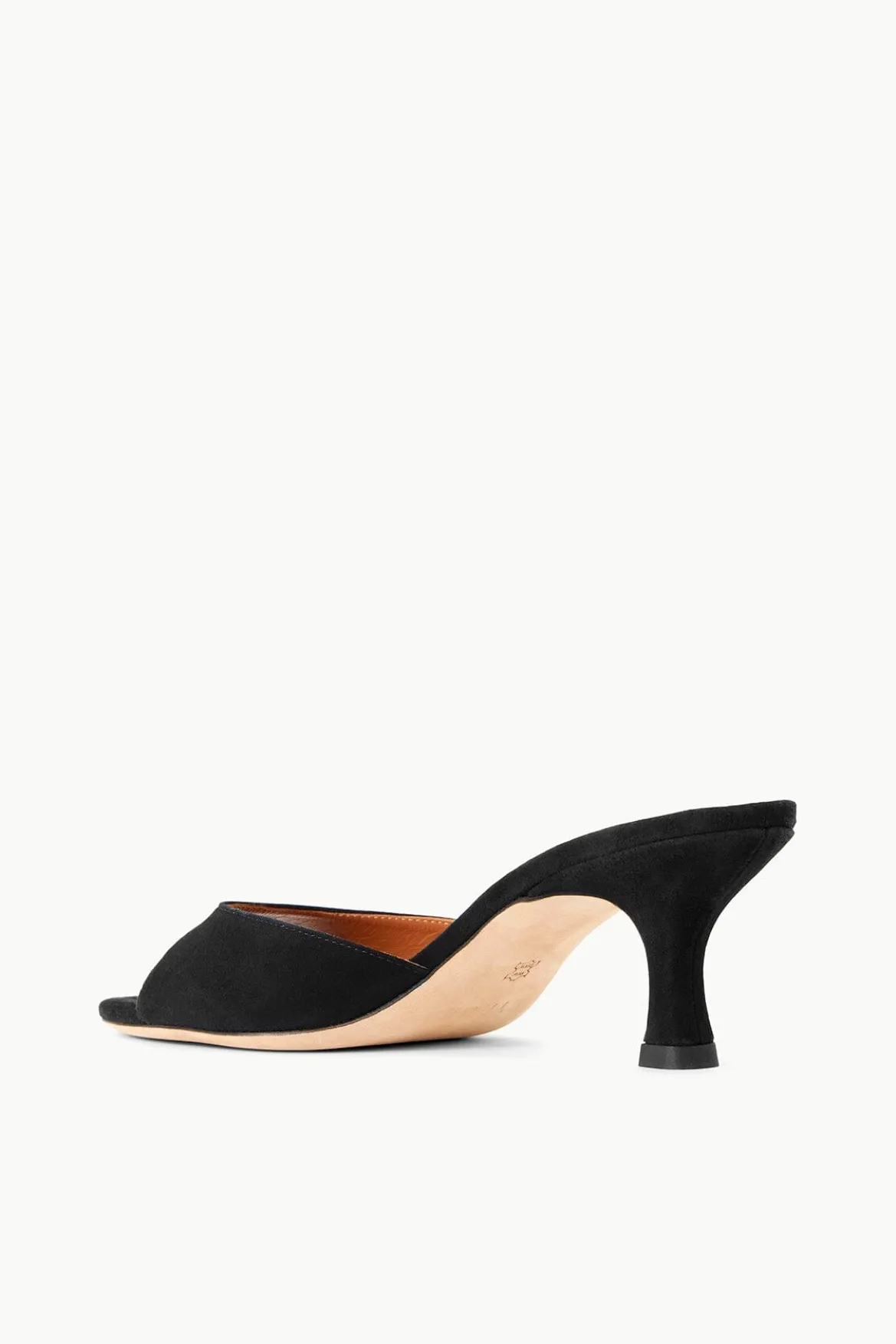 An open-toe mule crafted in soft suede, the Brigitte is an essential kitten heel for versatile dressing.