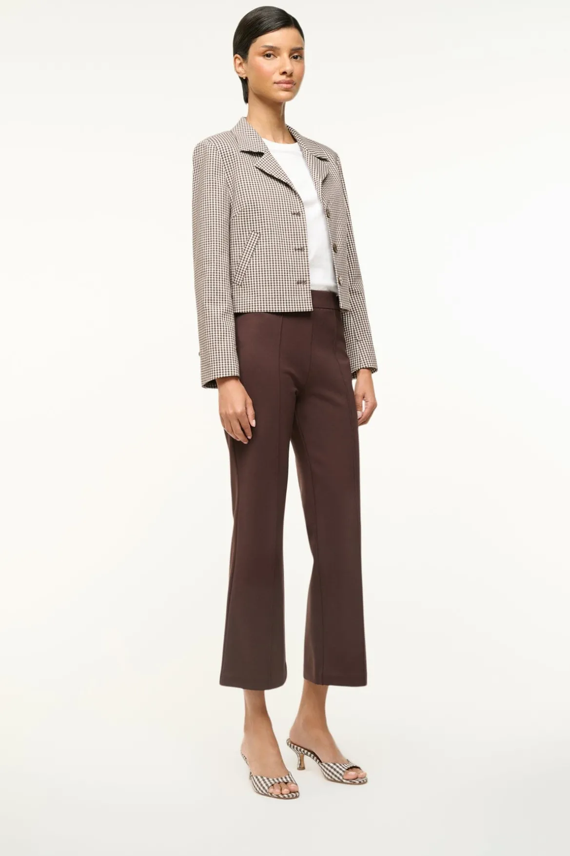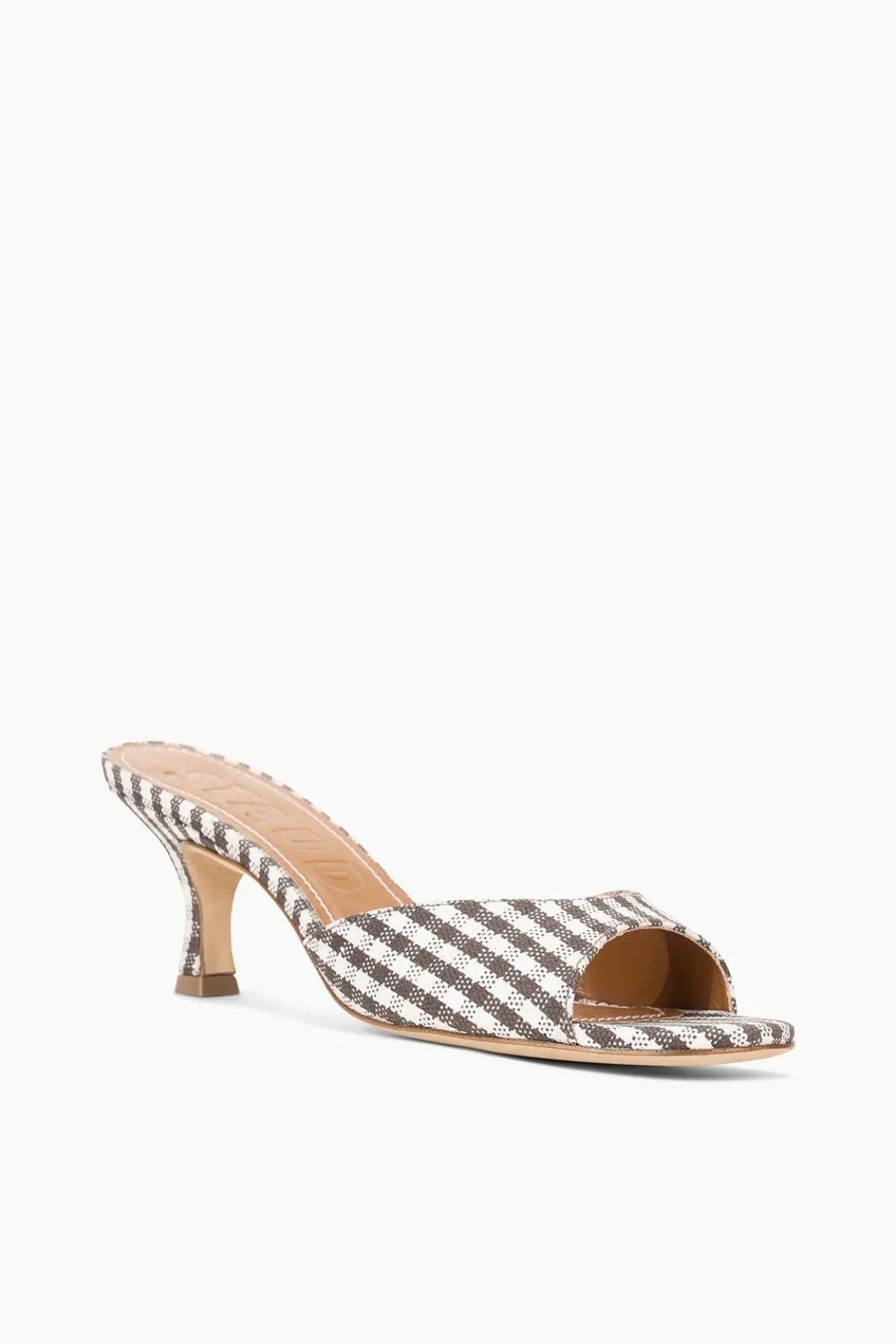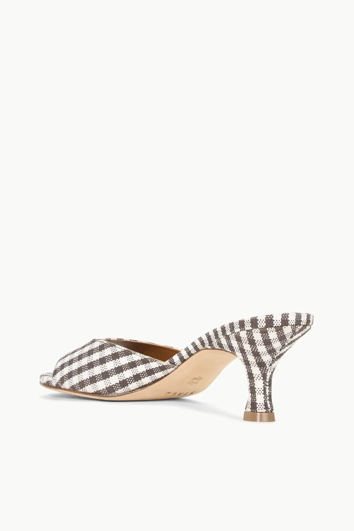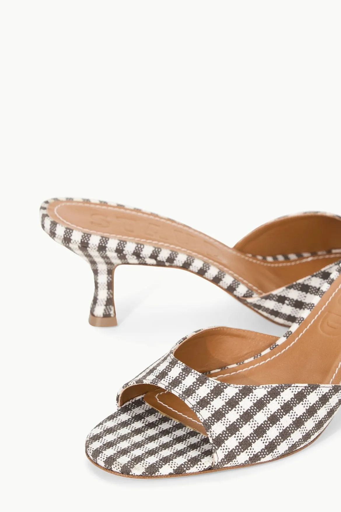 An open-toe mule featuring a gingham cotton canvas upper, the Brigitte is an essential kitten heel for versatile dressing.