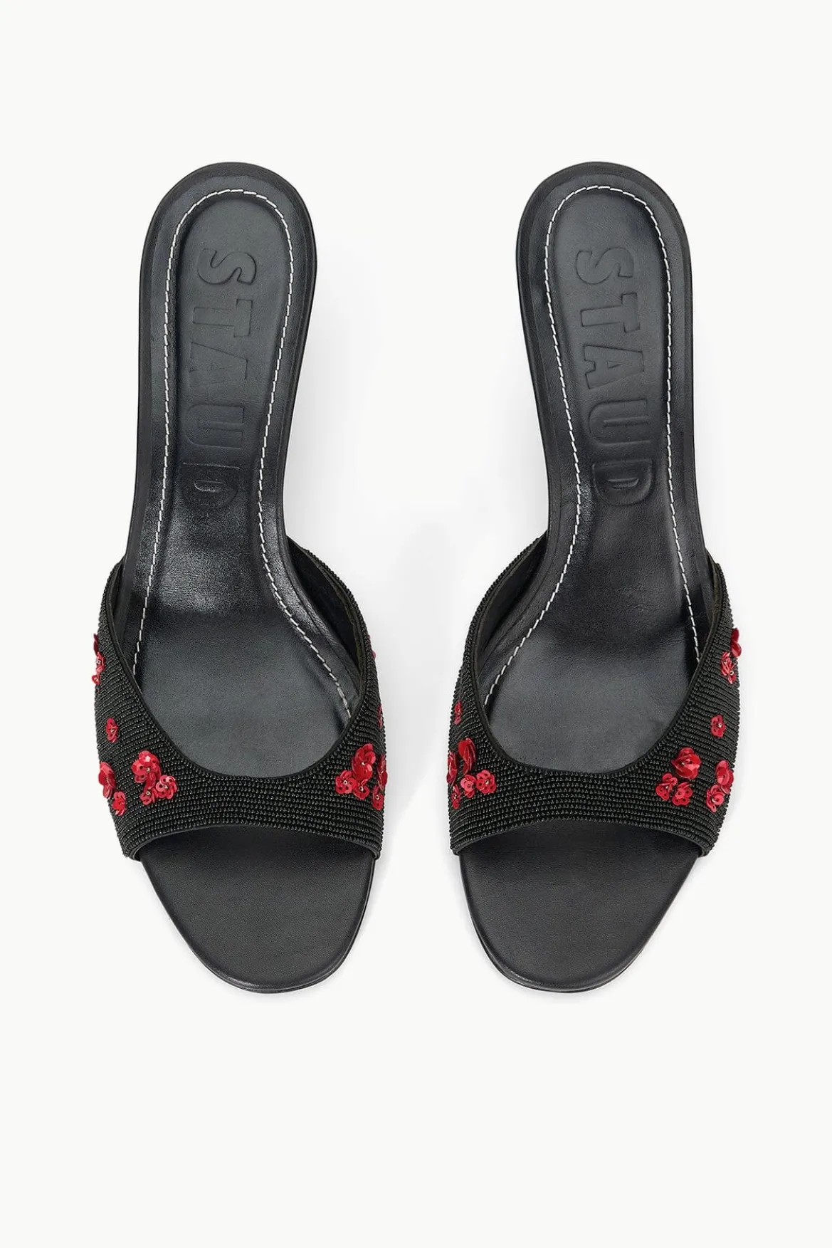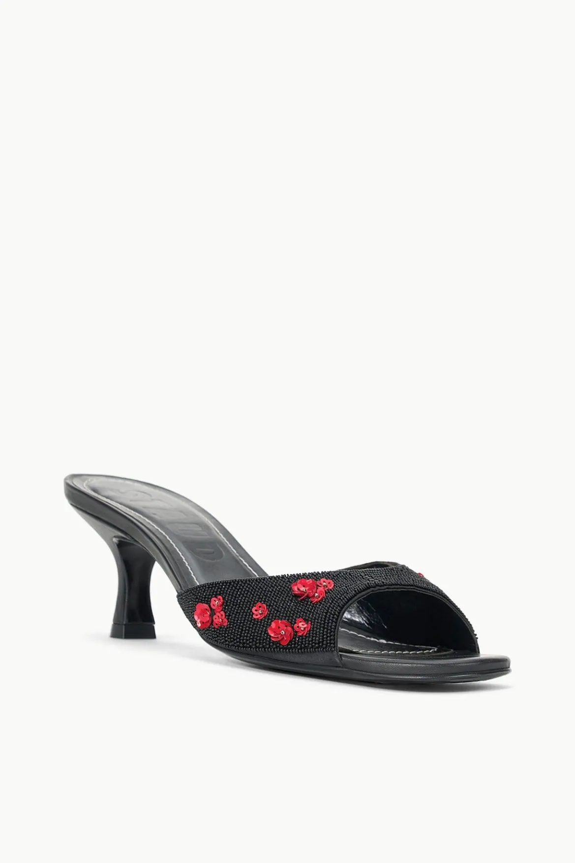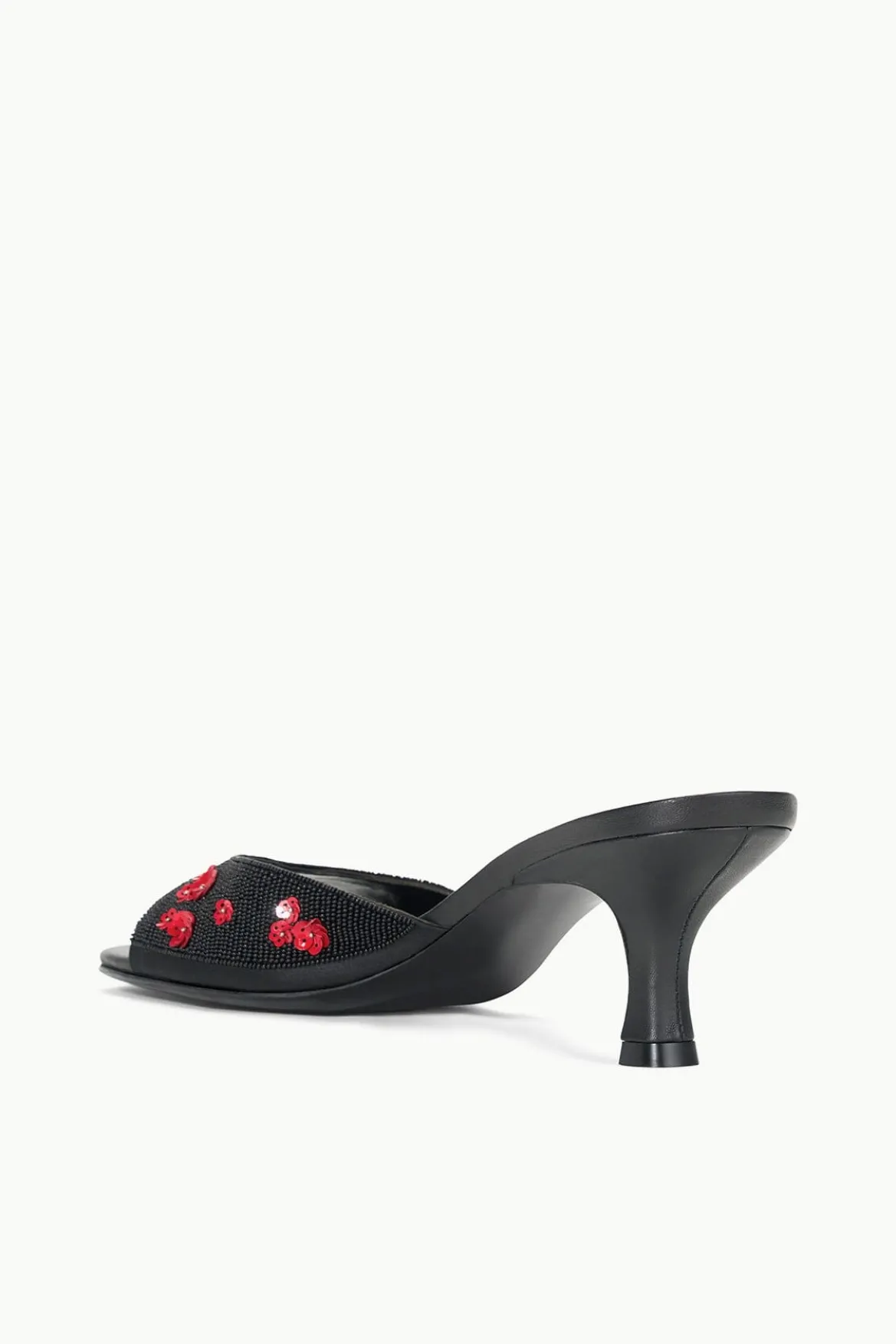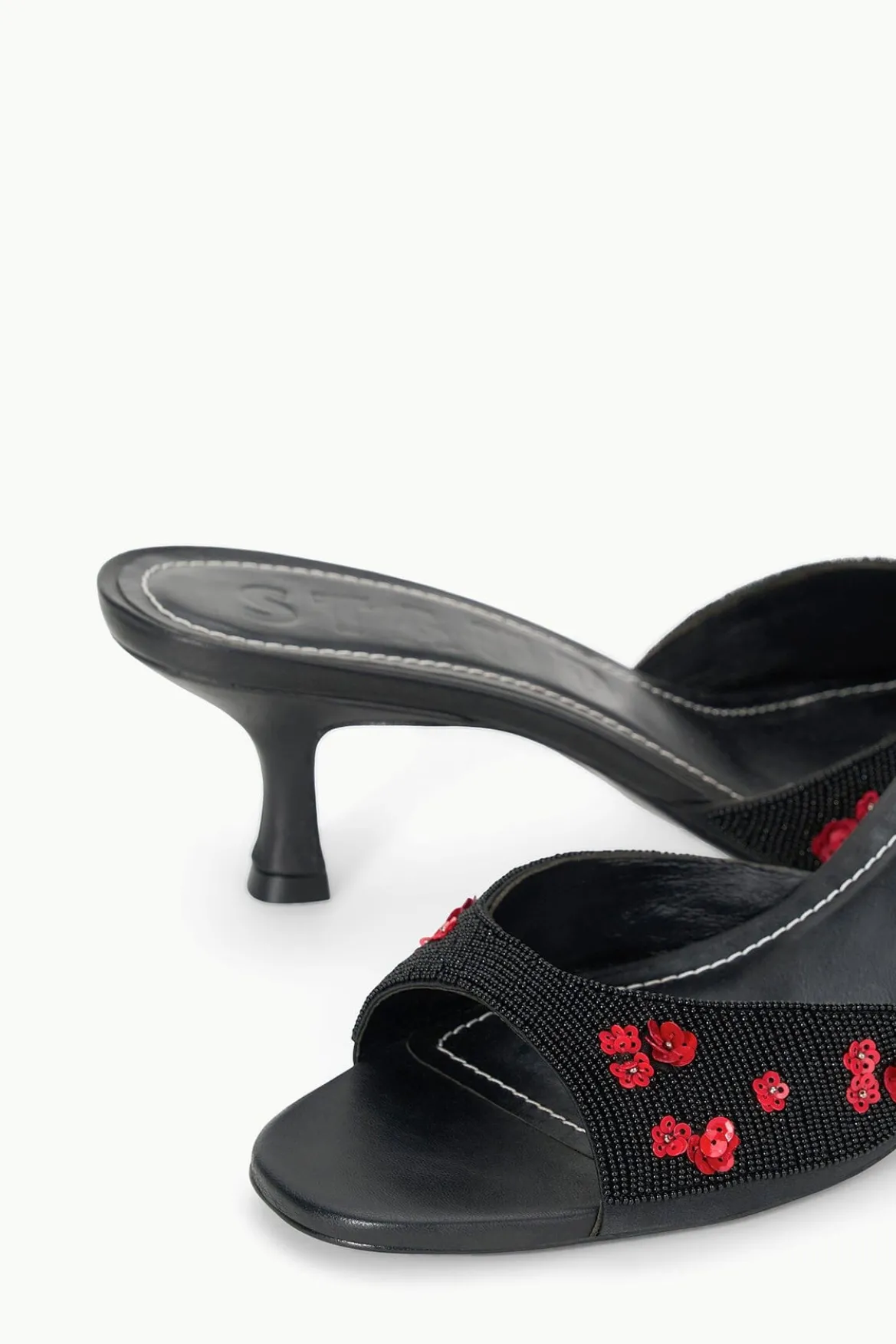 An open-toe mule crafted from a beaded satin, the Brigitte is an essential kitten heel for versatile dressing.