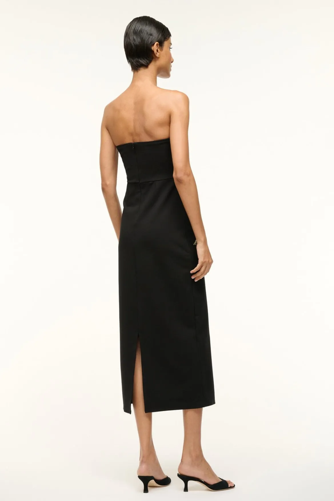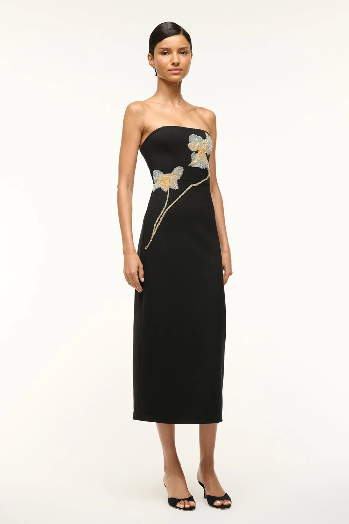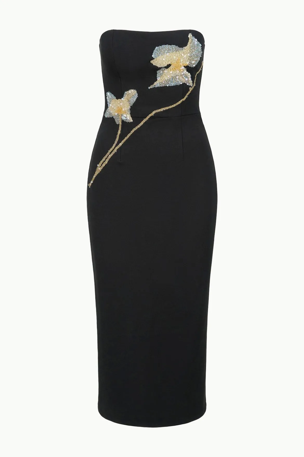 The Brooke is a strapless midi length dress with a hand-beaded floral detail across the bodice.