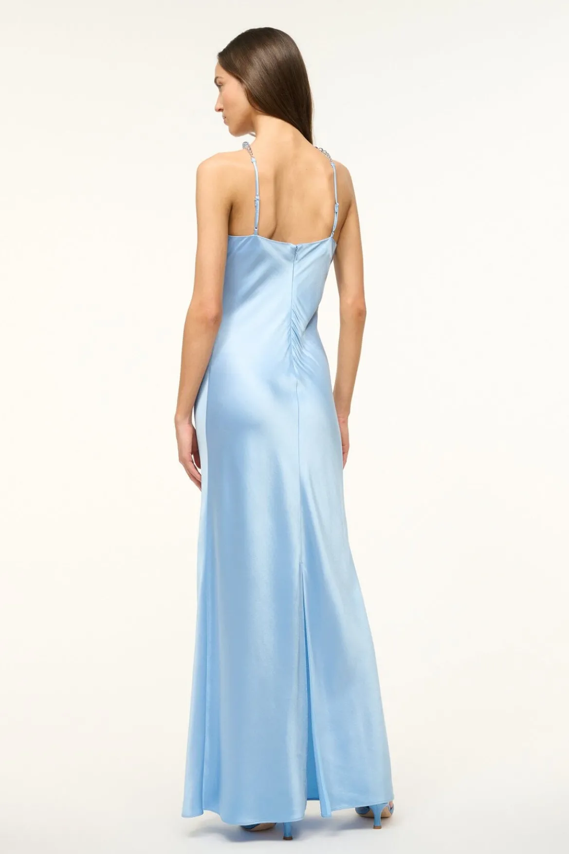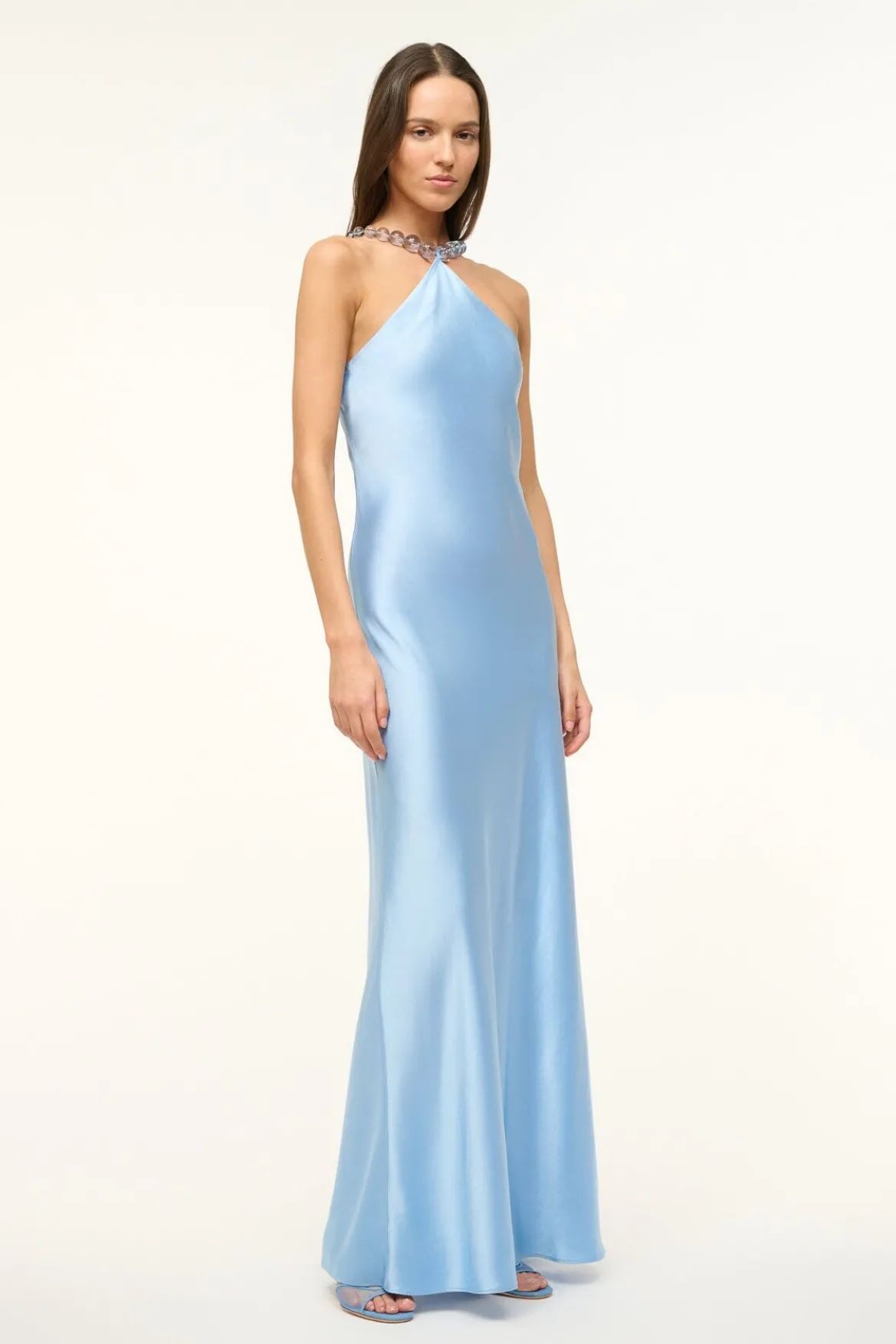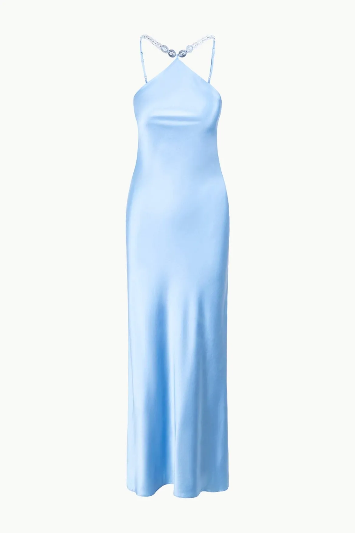 The Cadence is a floor length slip dress featuring a halter neckline with beaded straps. This dress is crafted in satin and has a hidden back zipper.