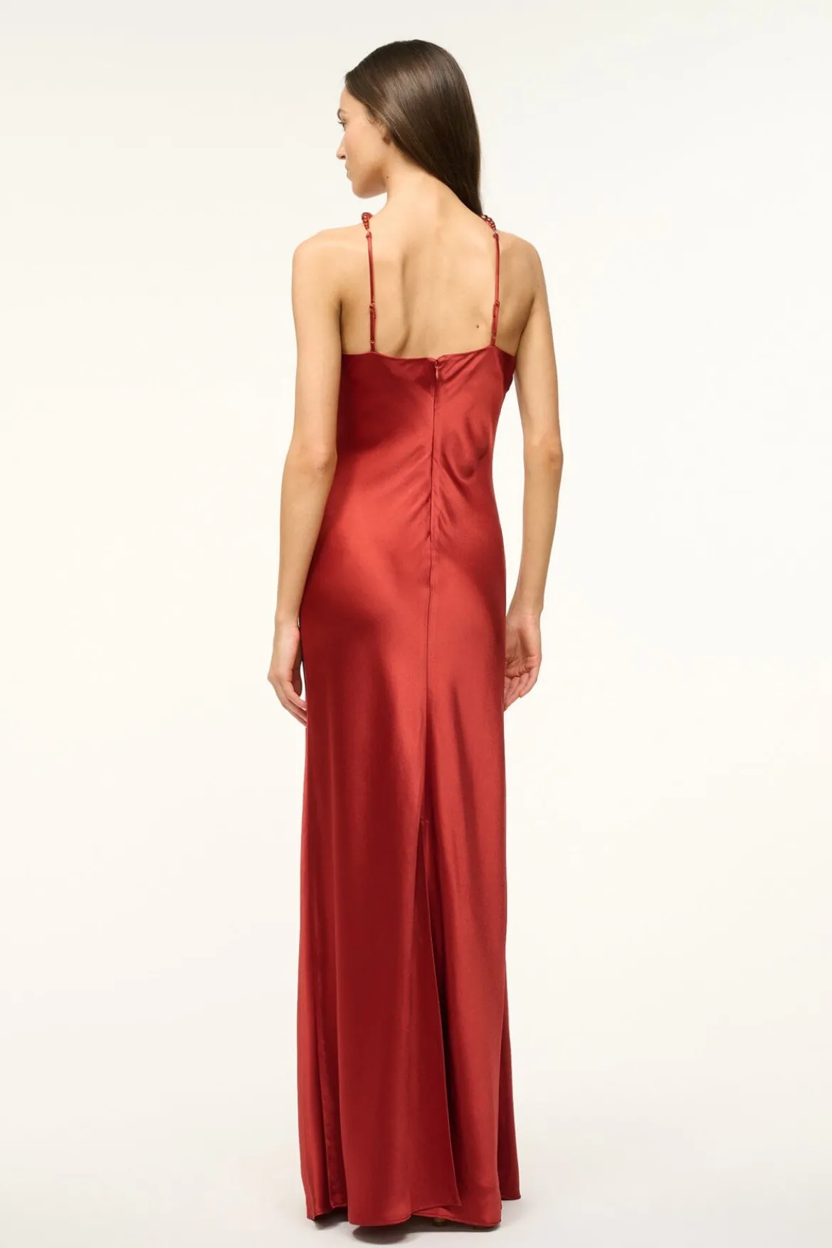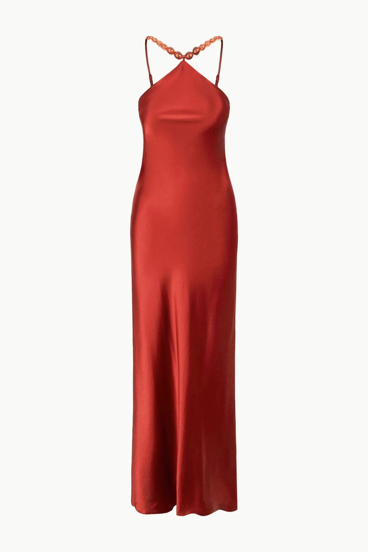 The Cadence is a floor length slip dress featuring a halter neckline with beaded straps. This dress is crafted in satin and has a hidden back zipper.