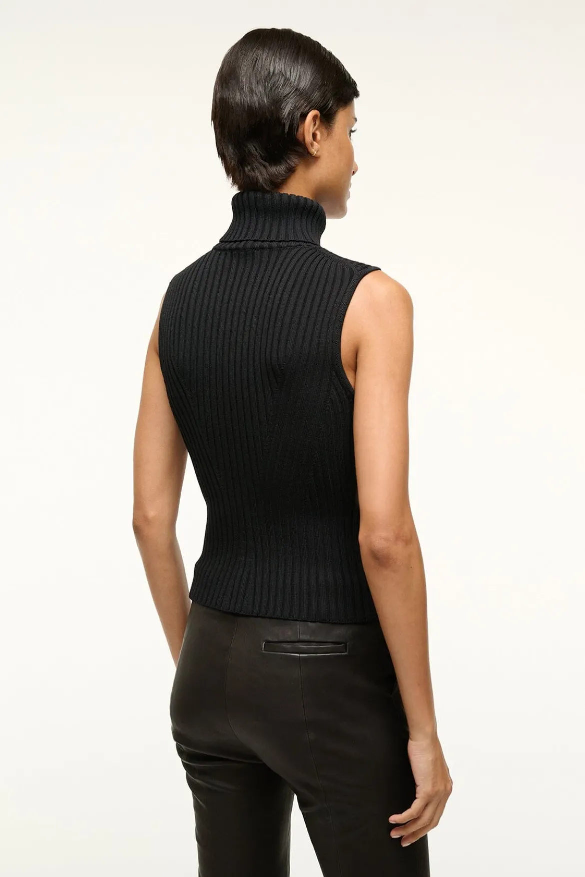 A sleeveless turtleneck top made out of a stretchy rib knit fabric. This style offers a fitted silhouette and full fashioning pattern throughout.