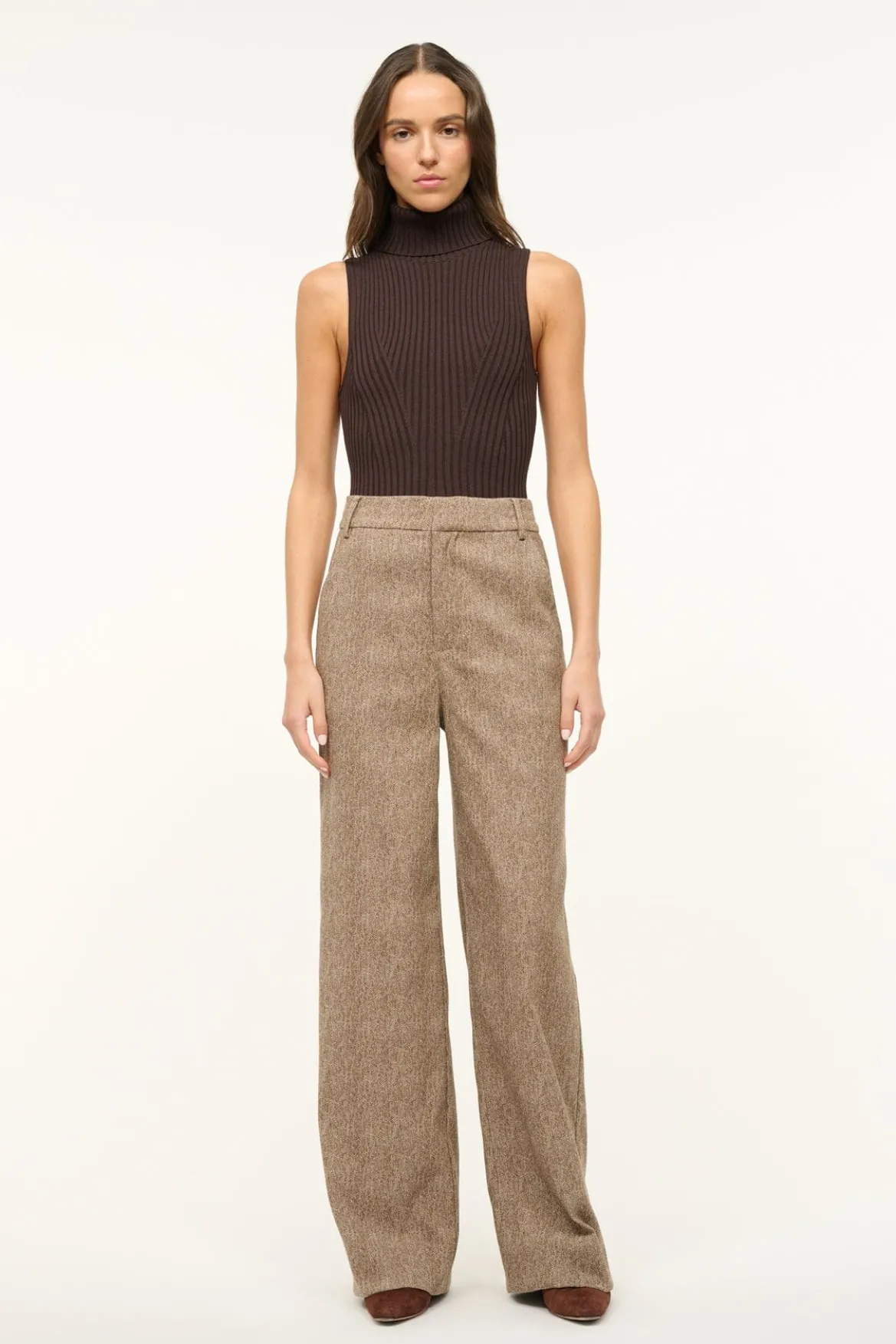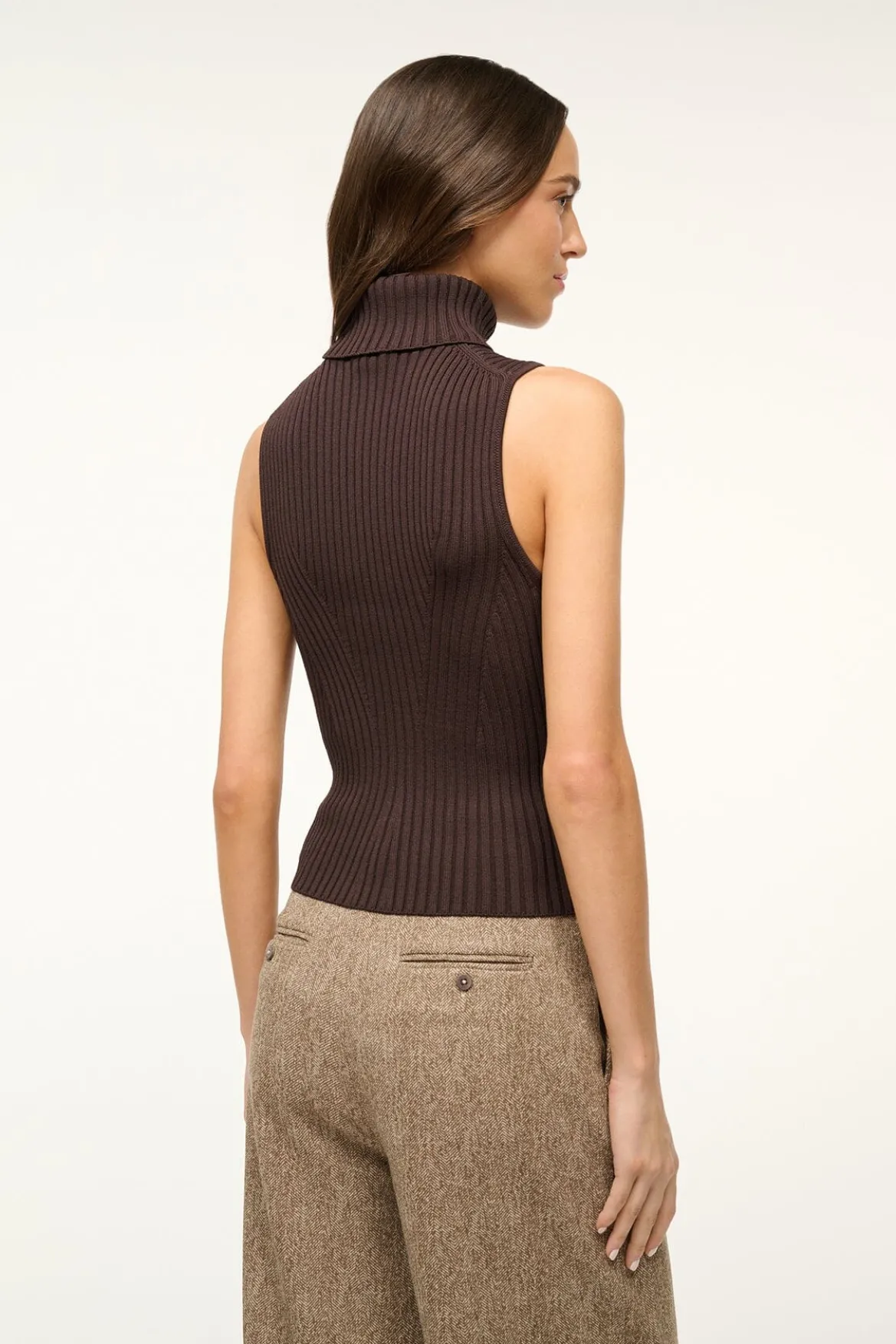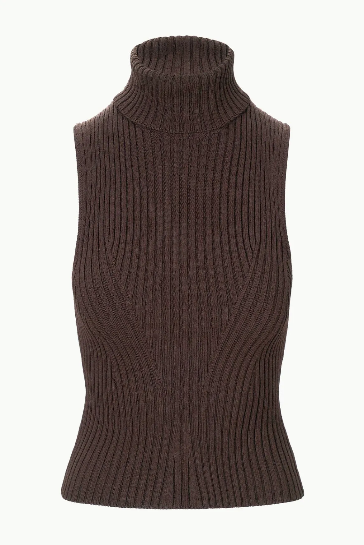A sleeveless turtleneck top made out of a stretchy rib knit fabric with a fitted silhouette.