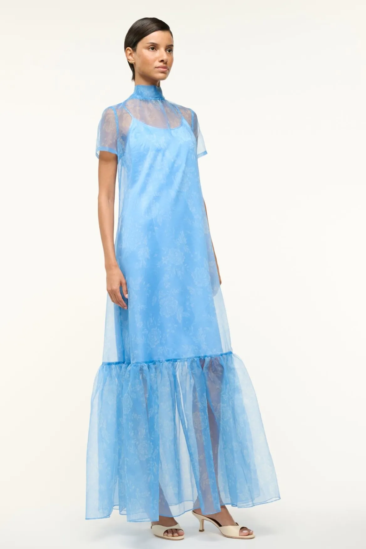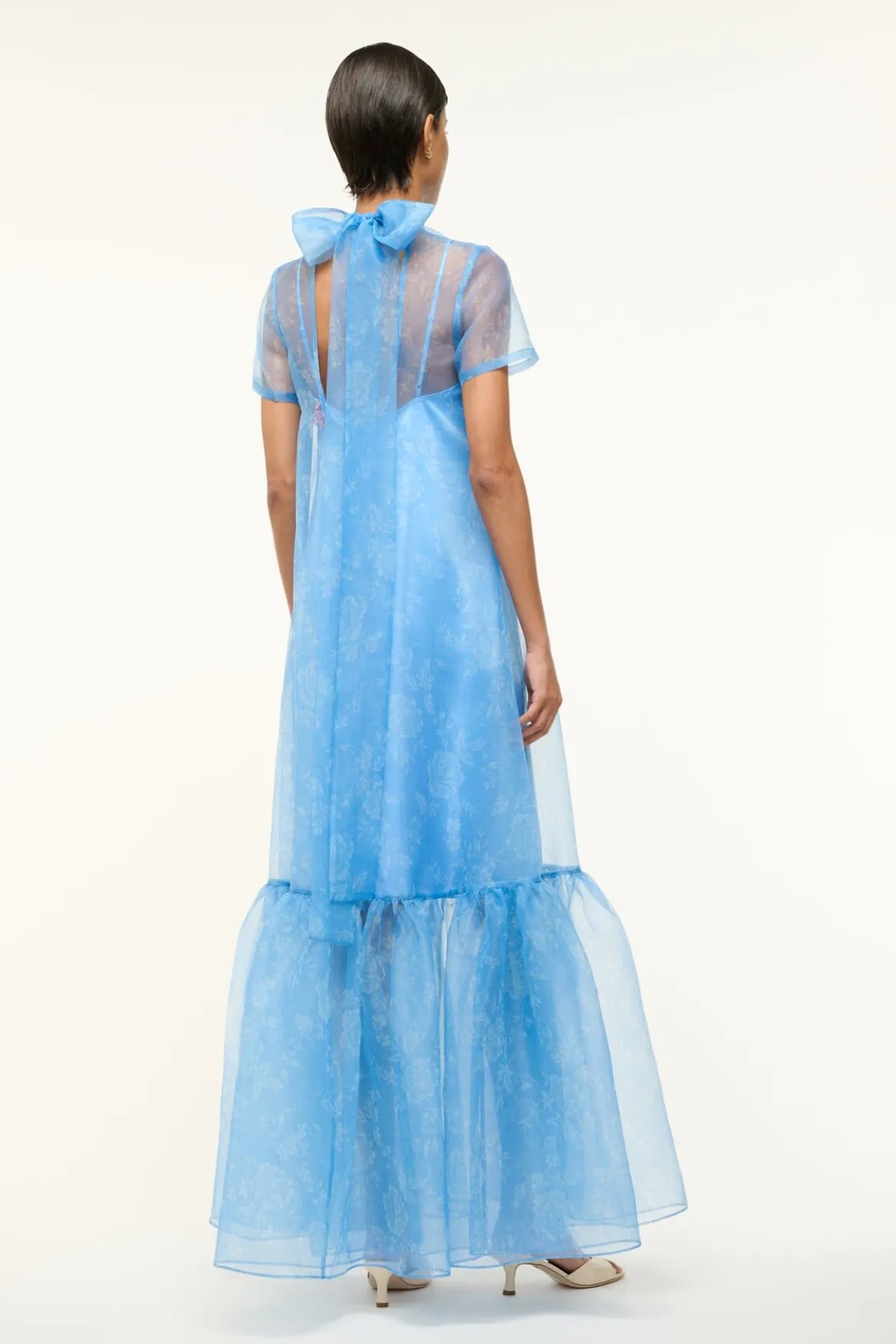 The Calluna Dress is a high neck organza gown with scoop back and functional neck tie. This style features a tiered skirt ruffle hem.