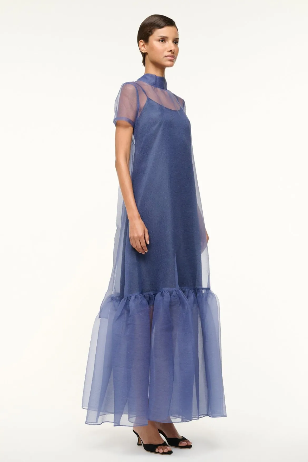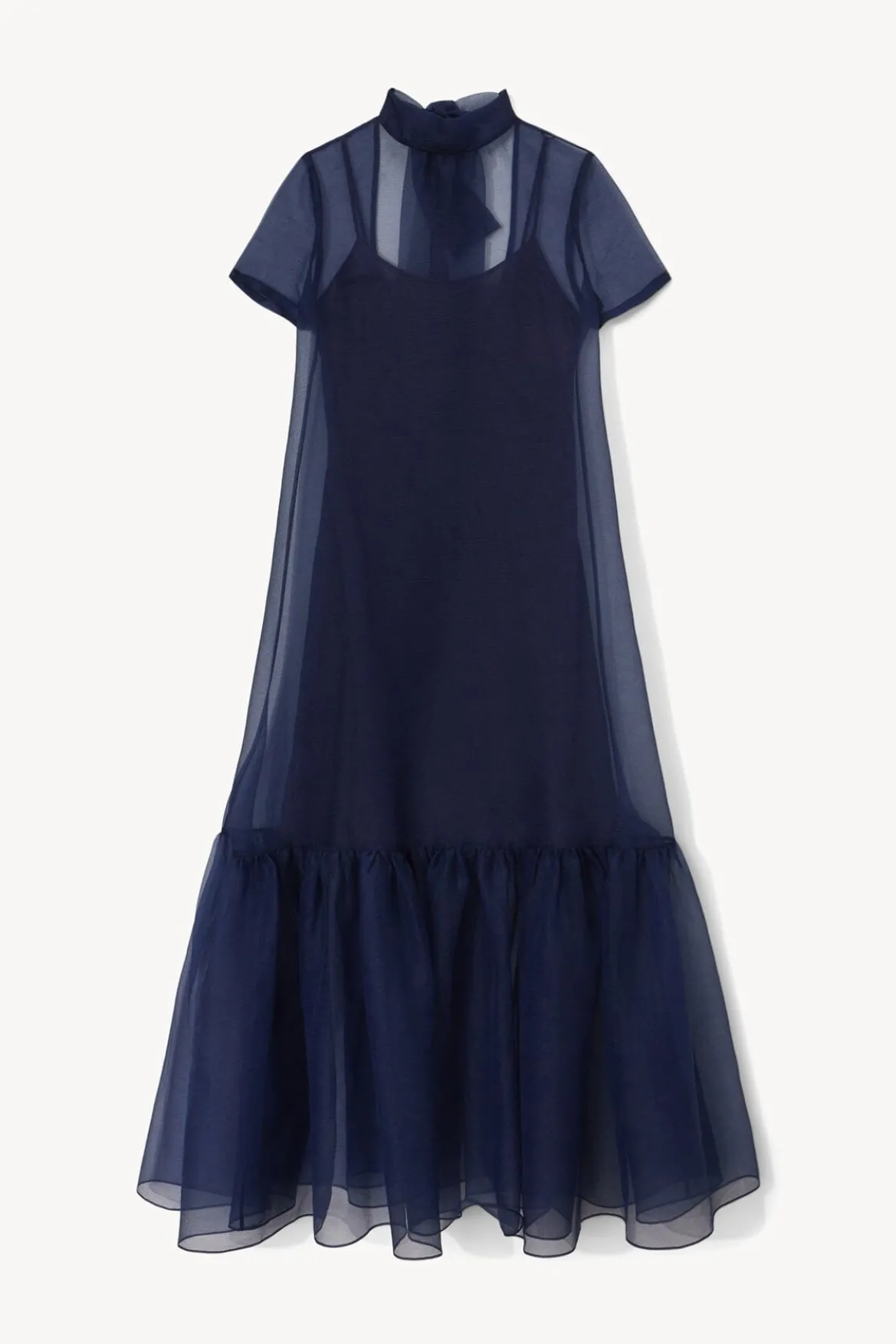 The Calluna Dress is a high neck organza gown with scoop back and functional neck tie. This style features a tiered skirt ruffle hem.