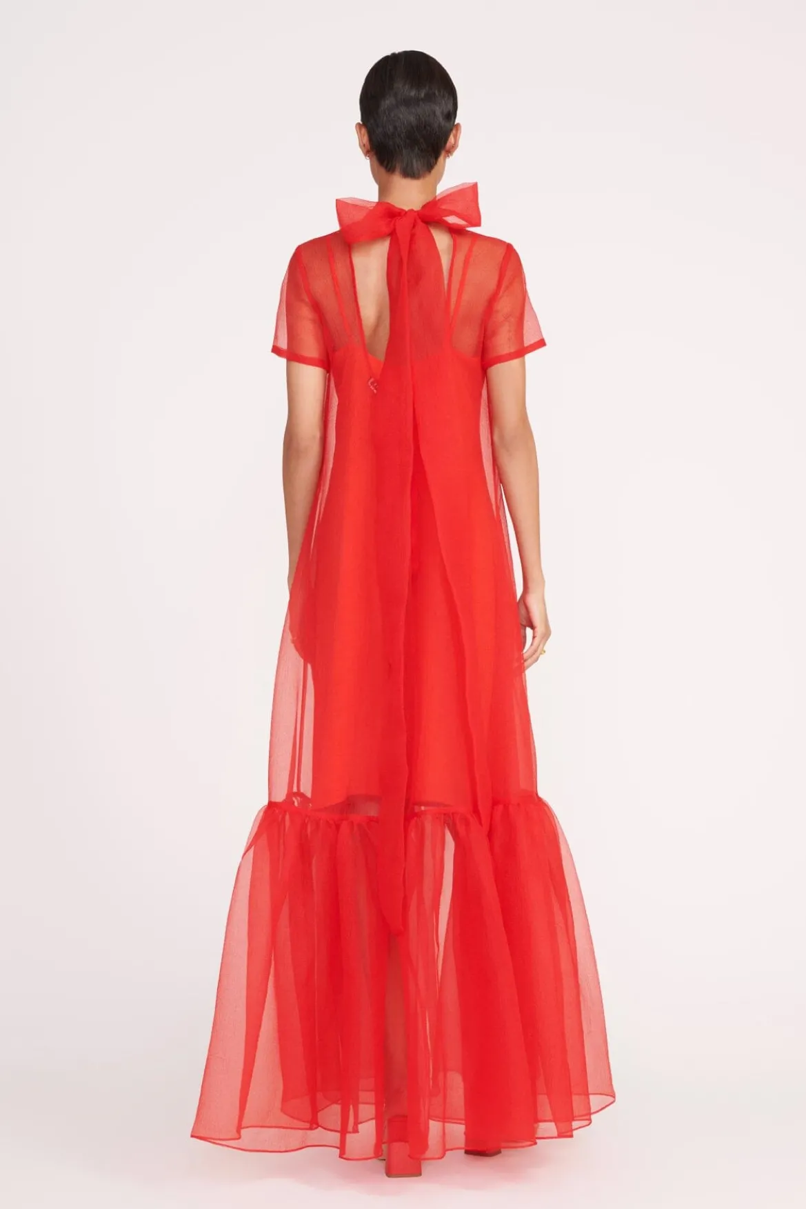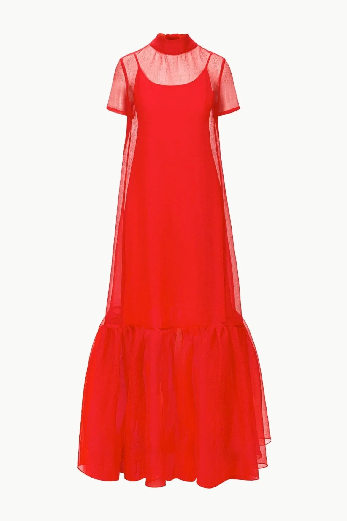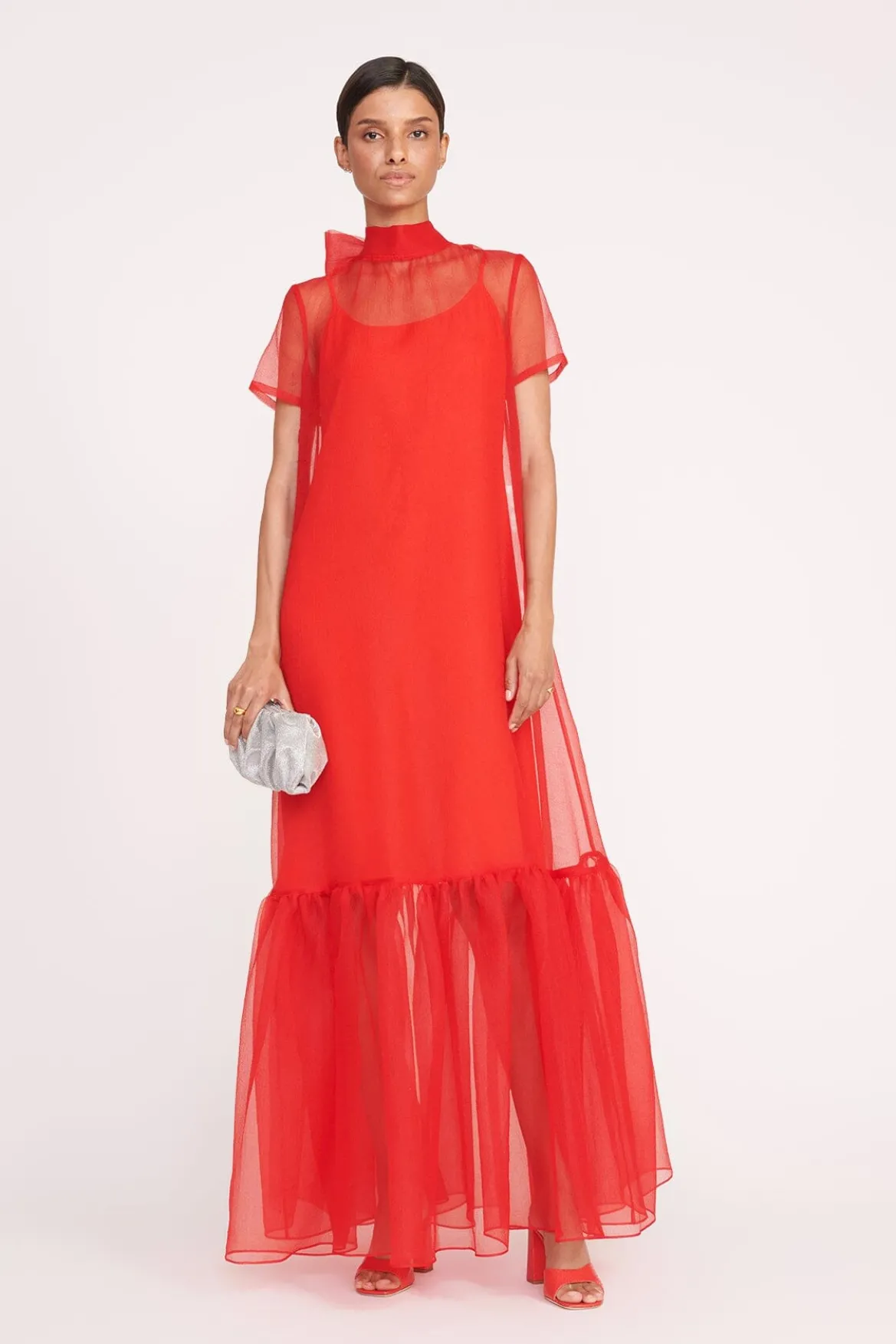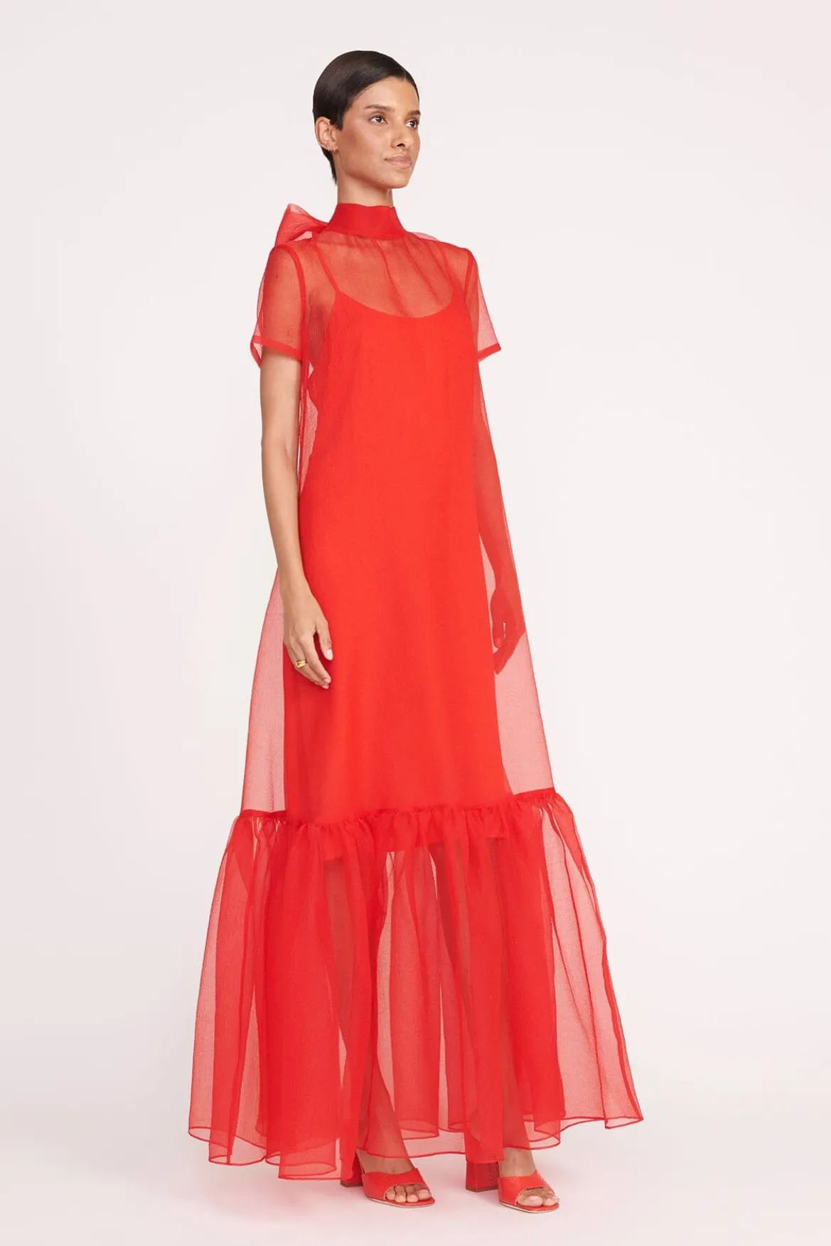 The Calluna Dress is a high neck organza gown with scoop back and functional neck tie. This style features a tiered ruffle hem and a midi slip.
