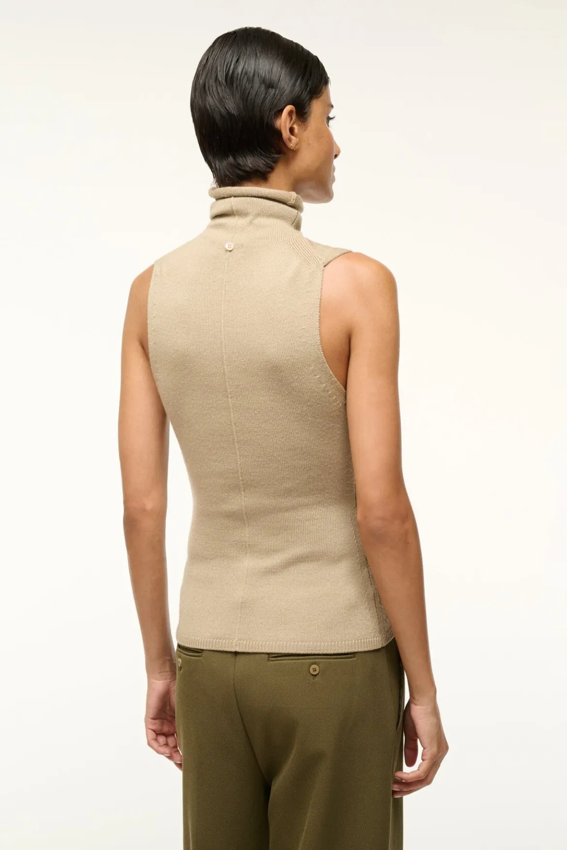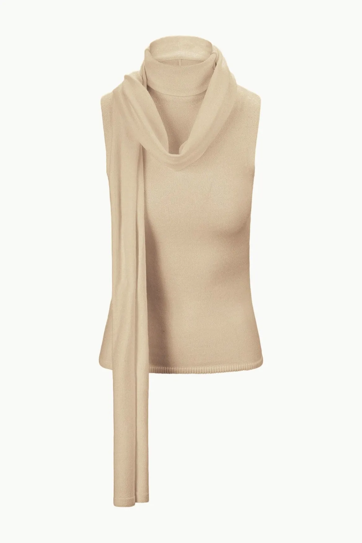 The Canal Top is a lightweight merino wool knit, with a mock turtleneck and comes with a detachable scarf.