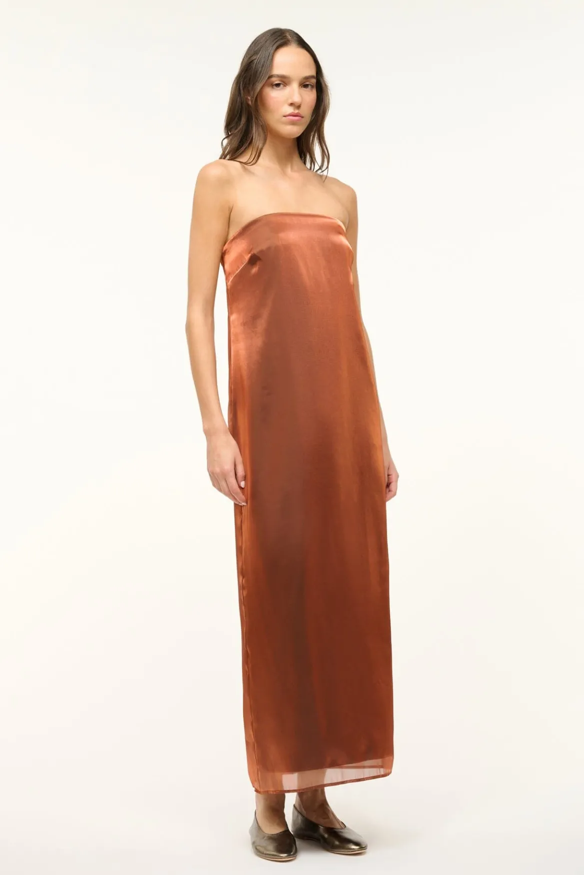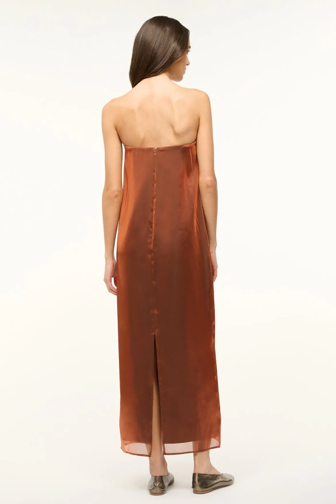 Our best-selling Casey Dress has been reimagined for the Fall season; crafted from an iridescent organza, this strapless gown features a relaxed silhouette throughout the body, a back slit, and a hidden zipper.