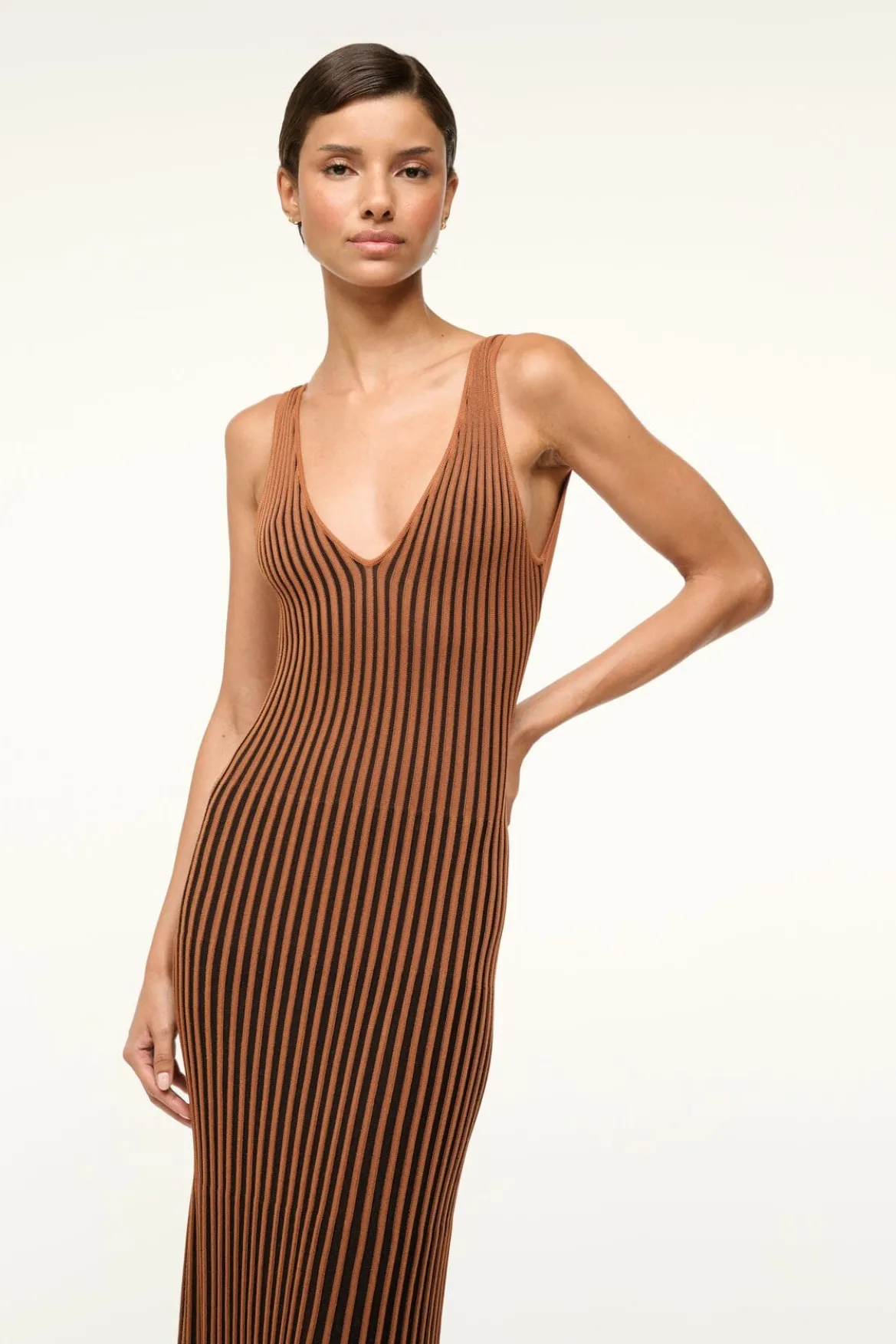 A sleeveless, maxi length dress made out of a flattering two-toned pleated rib knit fabric. This slip-on dress features a deep v neckline and slightly fluted skirt.