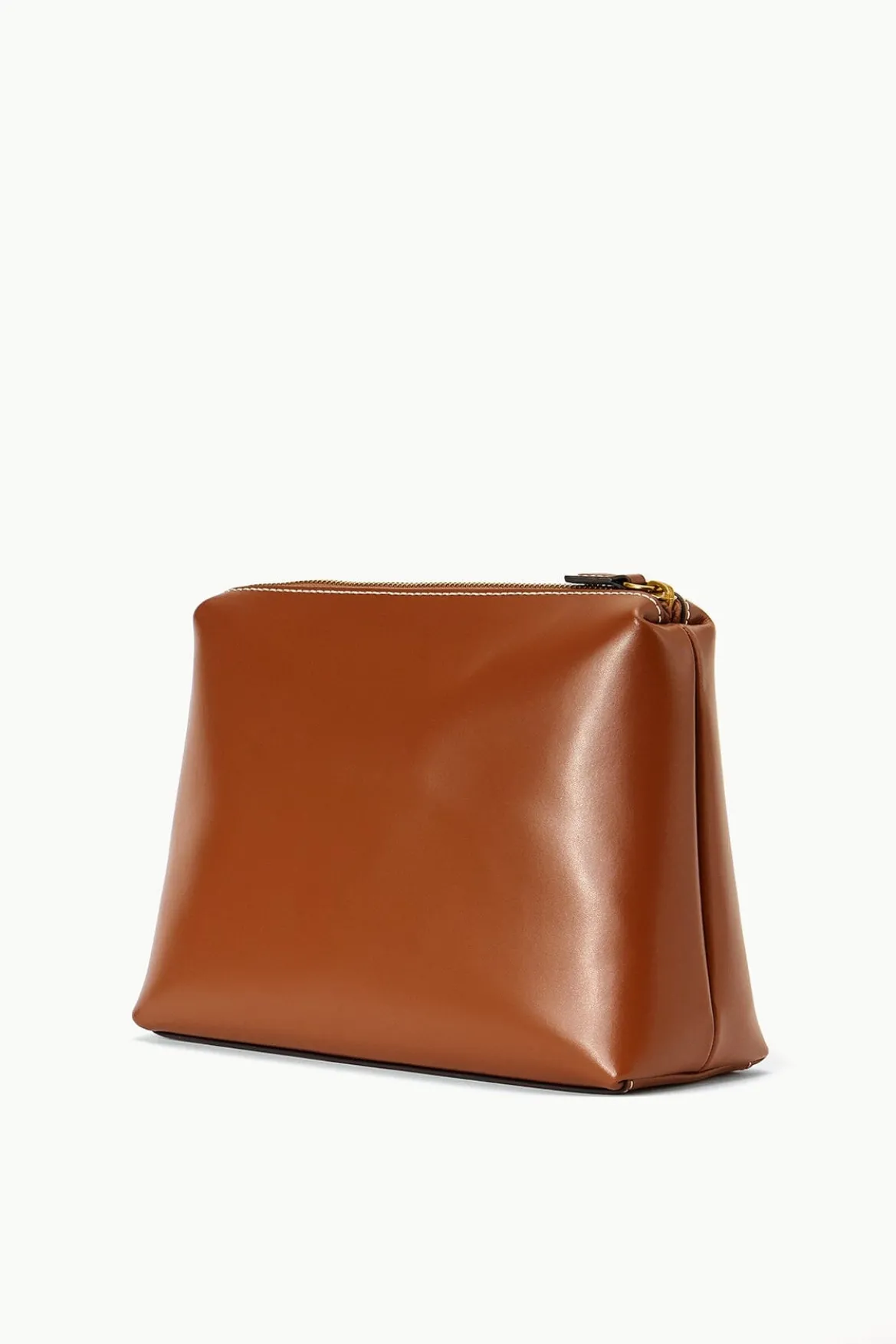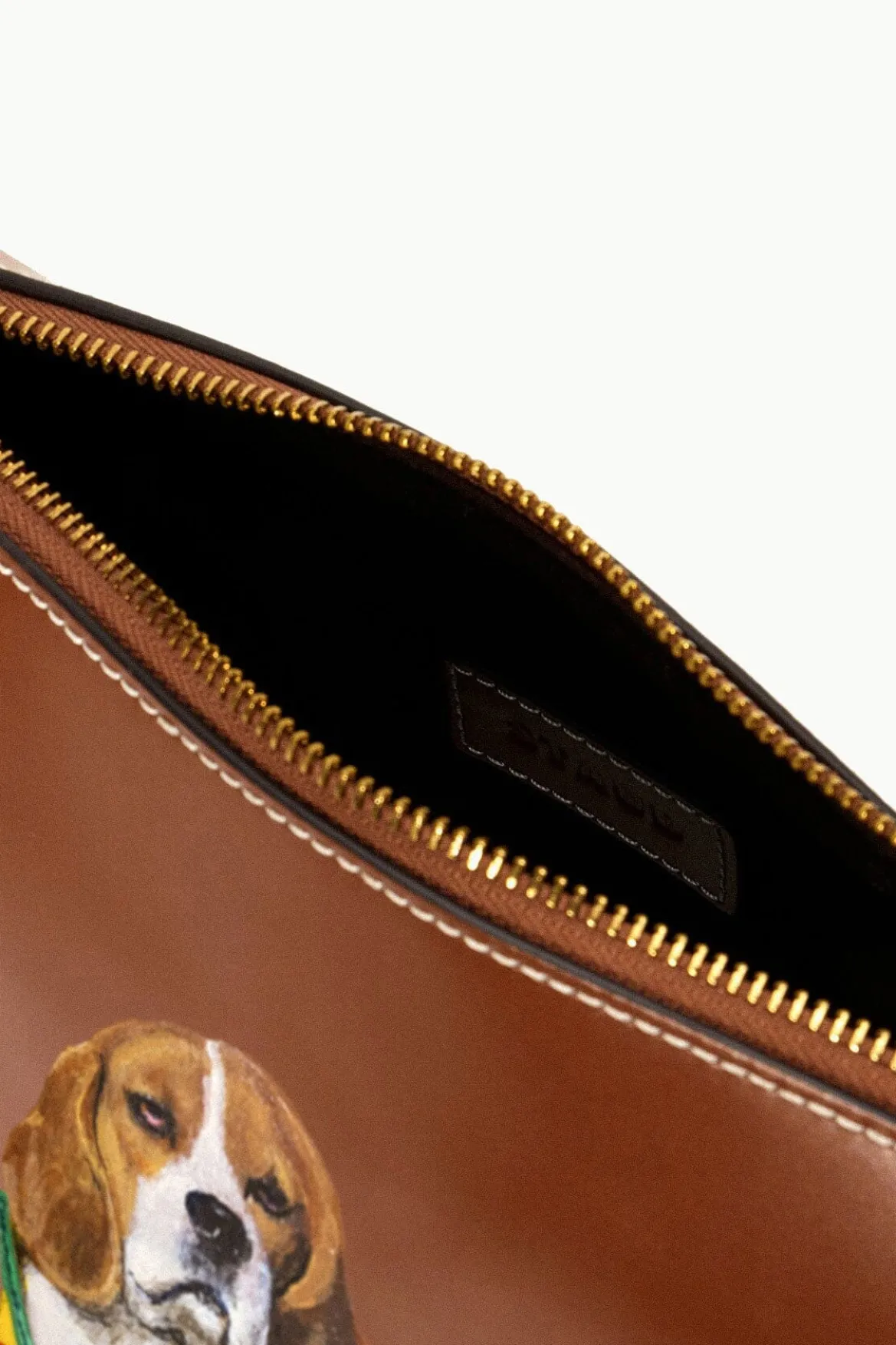 TheShirley Pouch features a zipper closure, antique gold hardware, and suede lining.