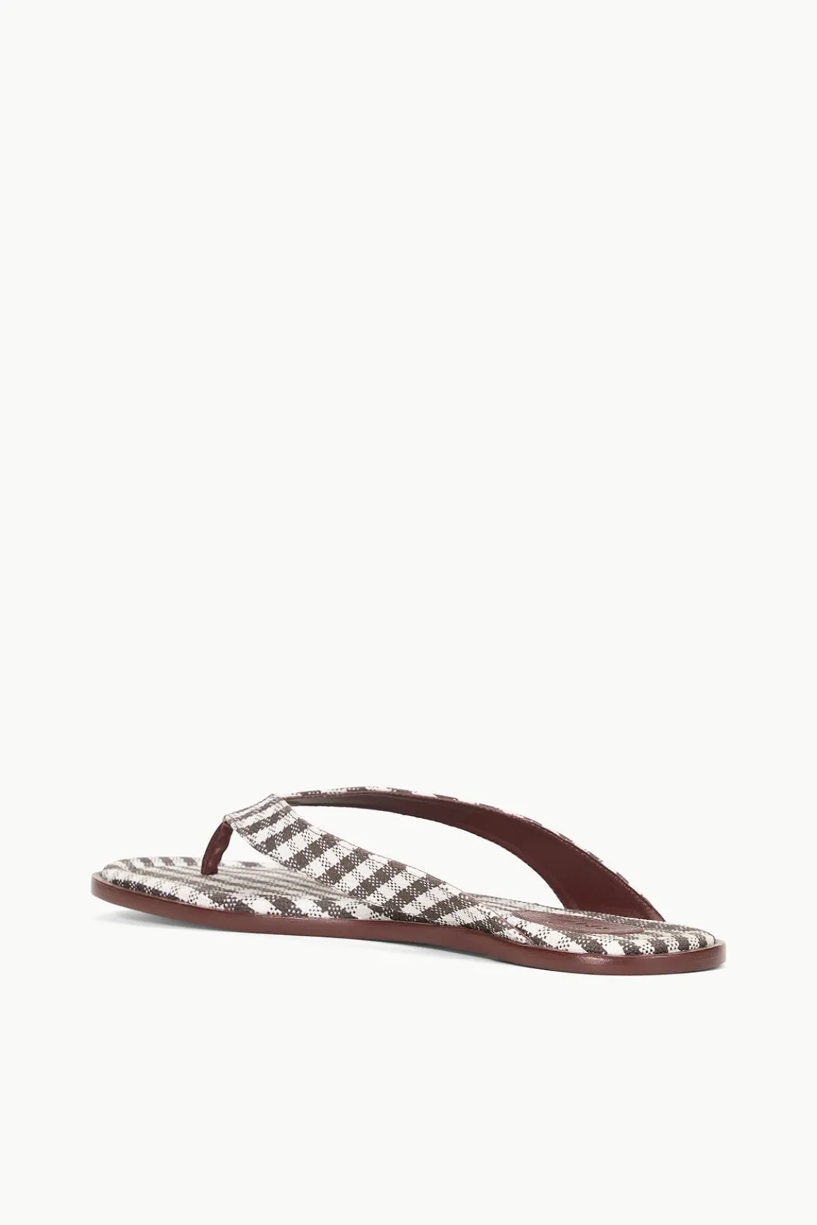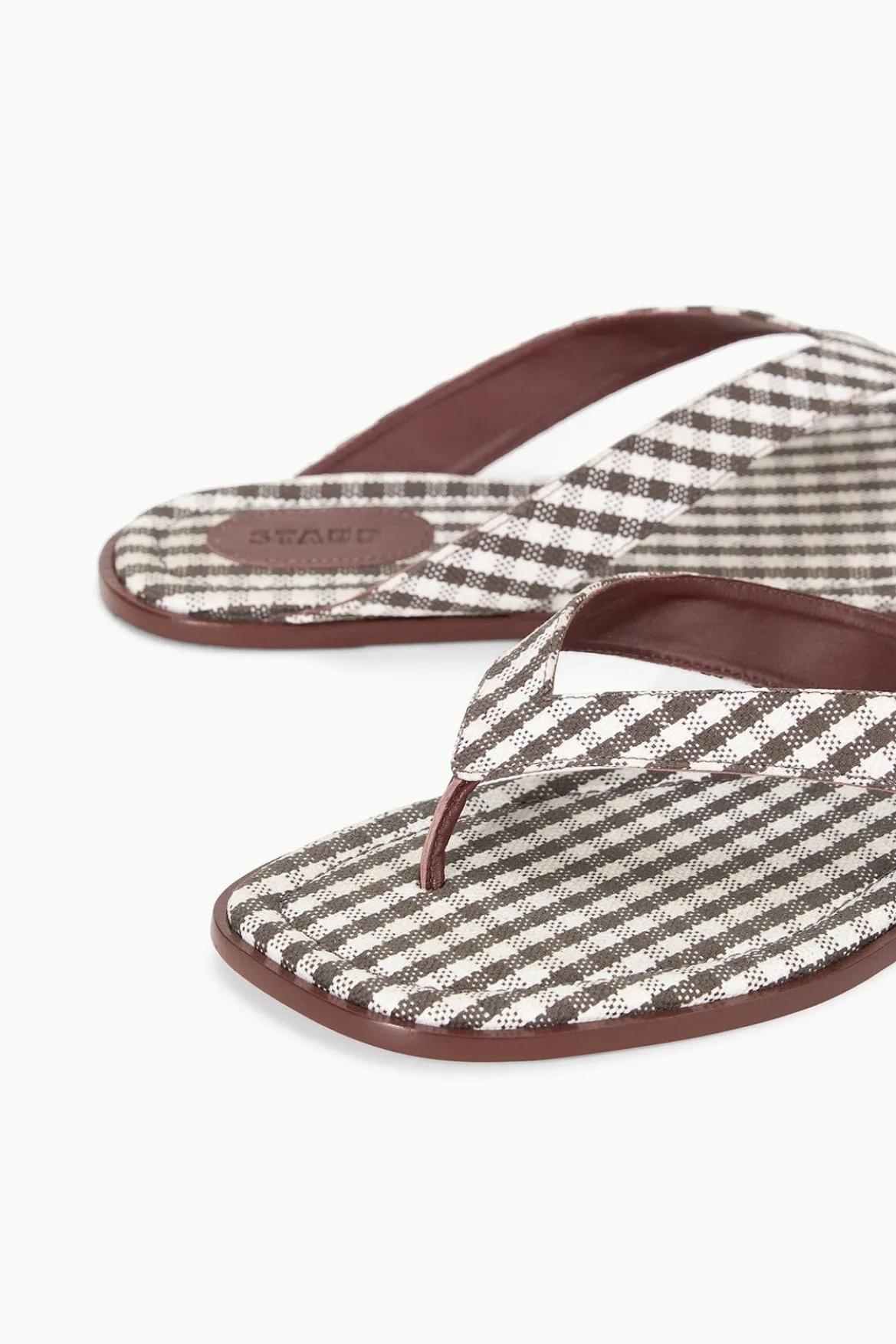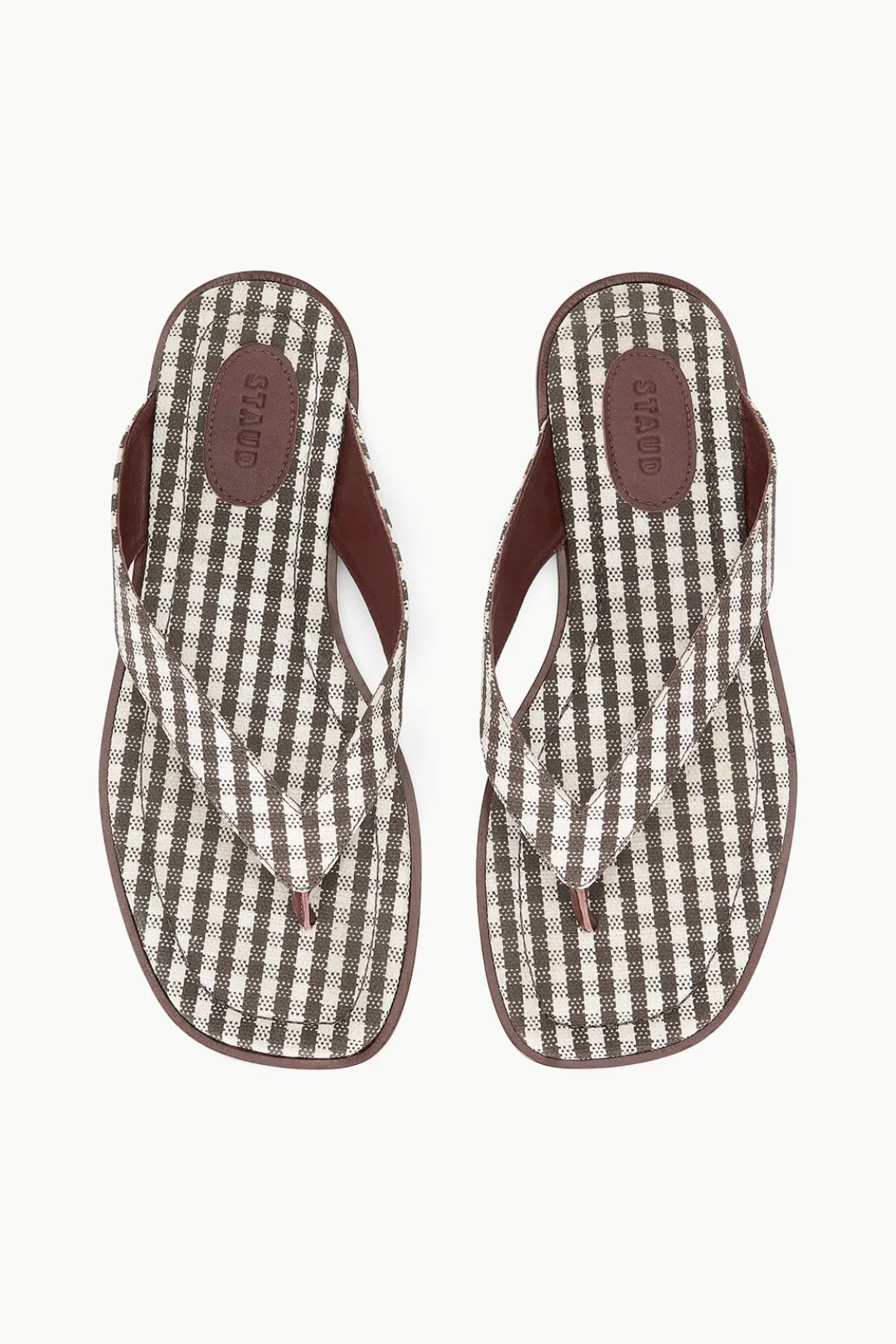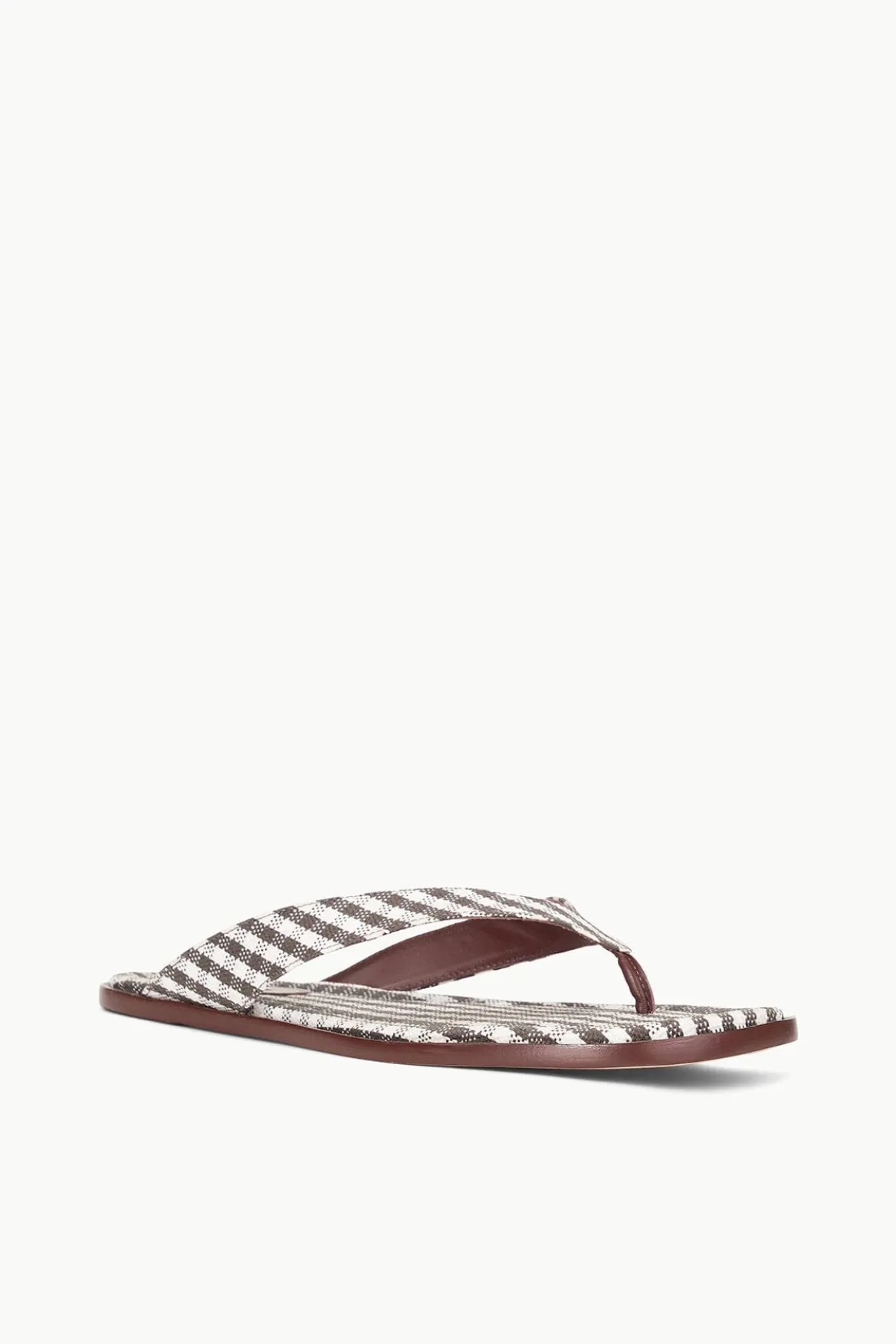 An update to our Dante thong slide now offered in a printed cotton canvas featuring a cushioned footbed, leather sole and rubber heel.
