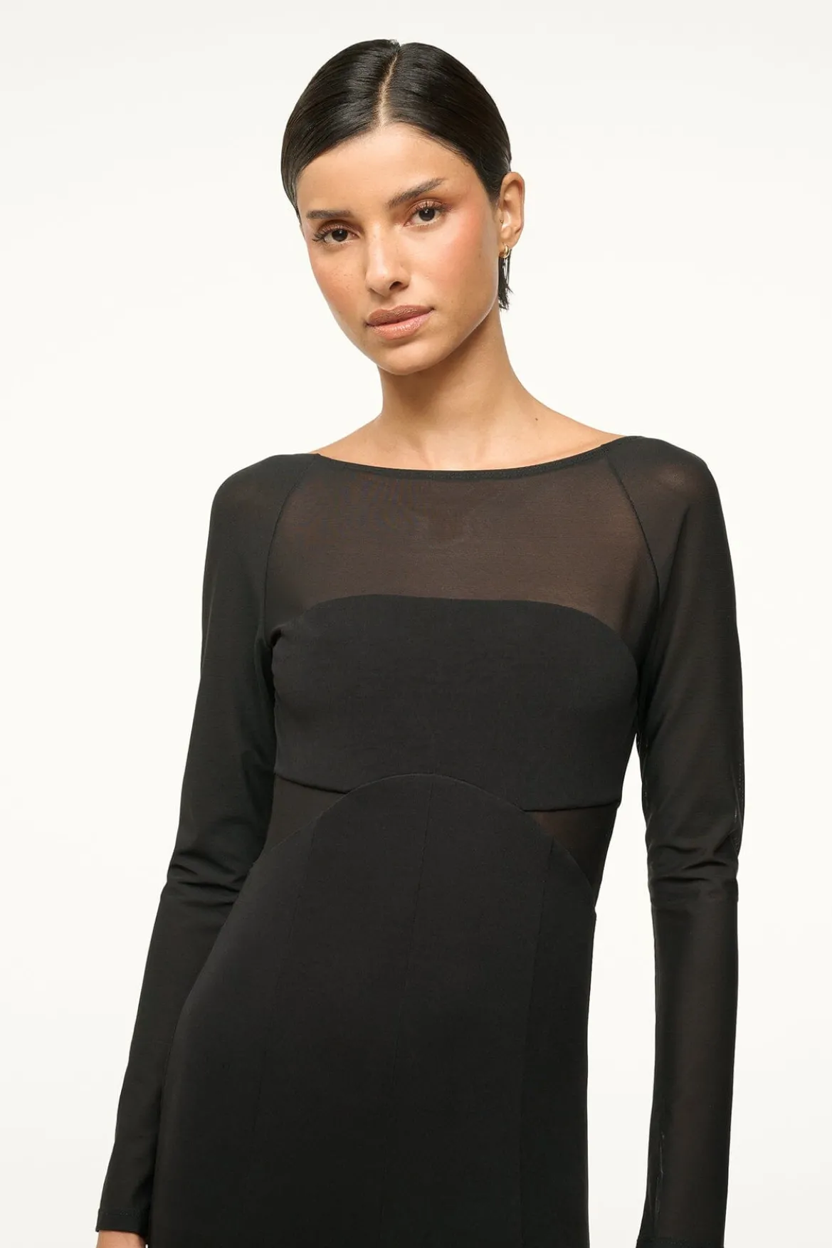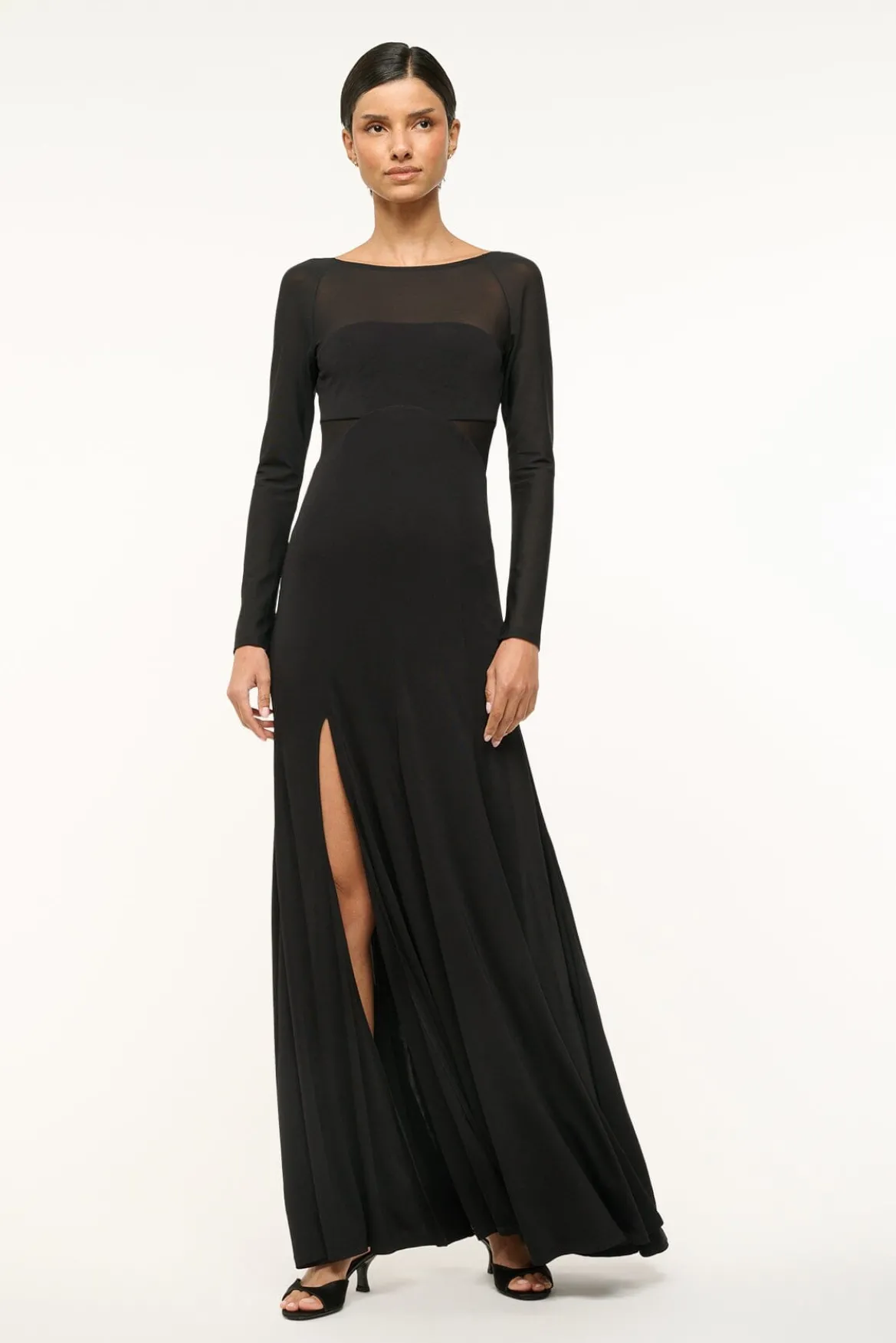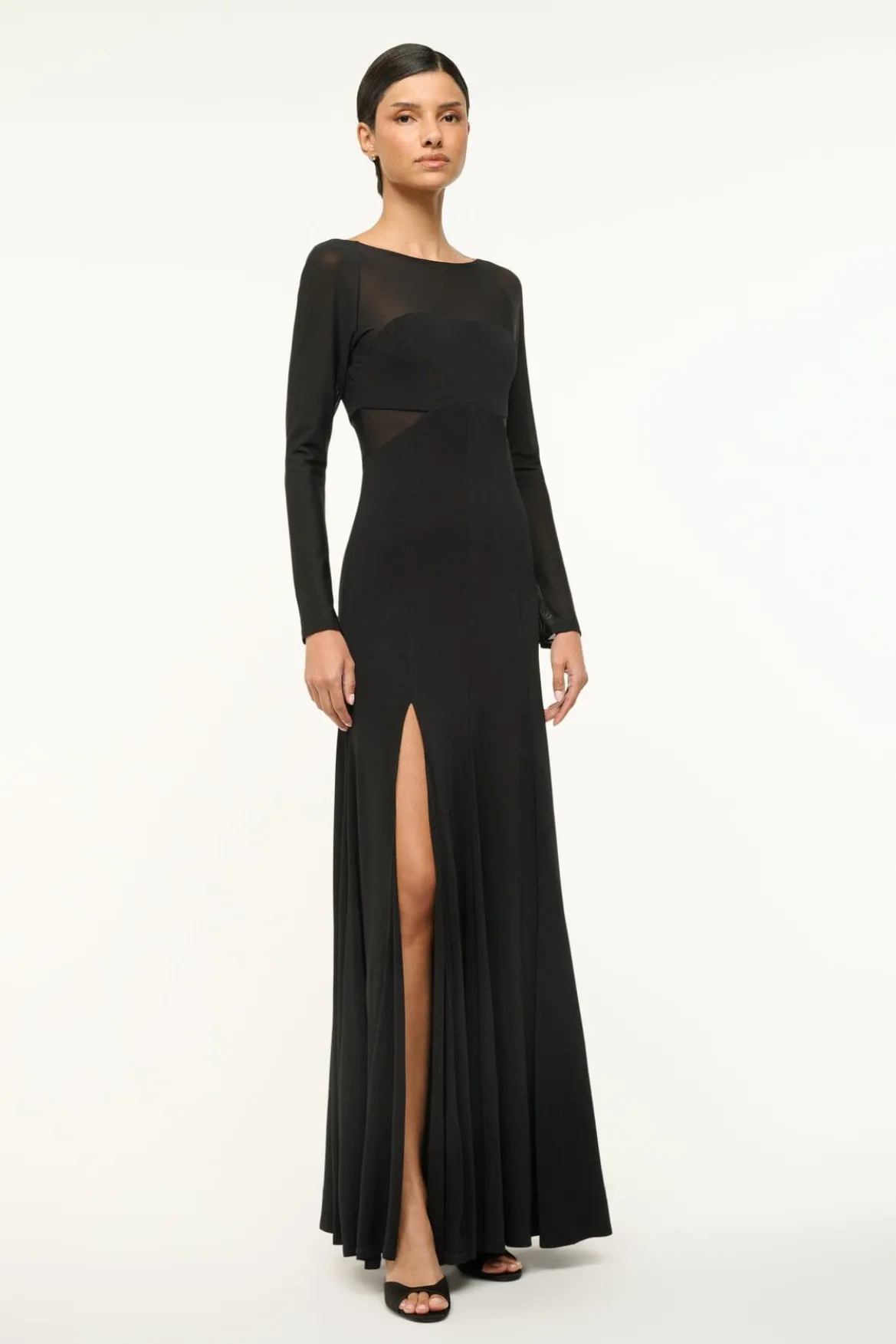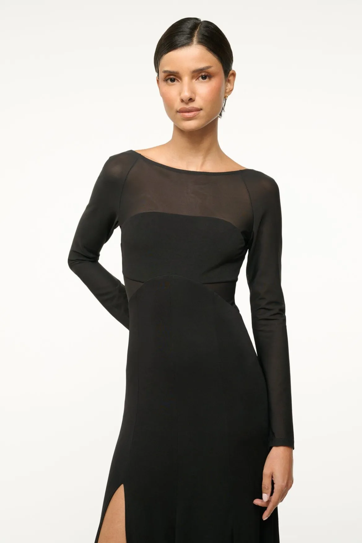 The Dara Dress is a long sleeve maxi dress with sheer sleeves and a low back. The dress features a high side slit and a boatneck.