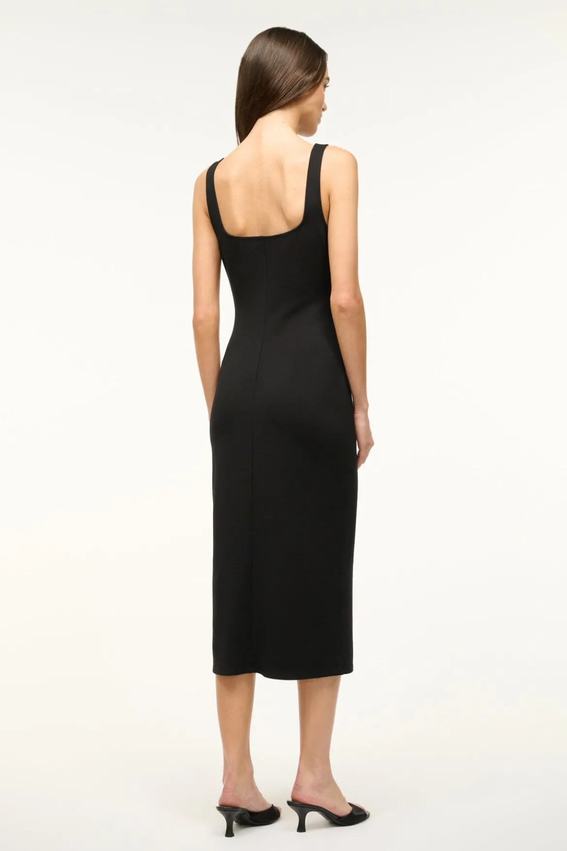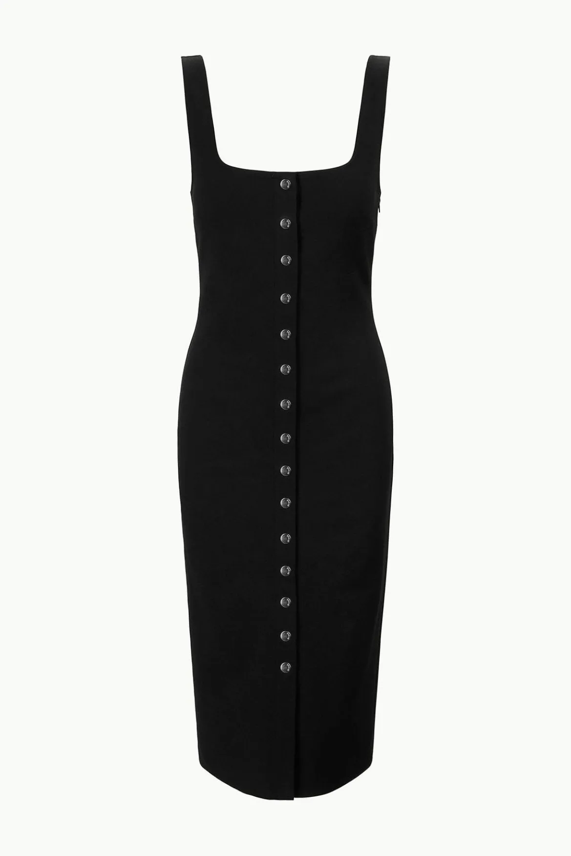 A sleeveless, midi-length dress made from our stretchy ponte knit, the Domani features a square neckline and center front snap buttons.