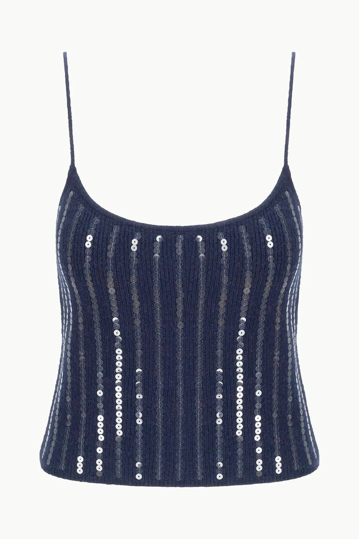 A fuzzy knit camisole with sequin embroidery perfect for any Holiday occasion. The Emerson Tank features adjustable straps and completes a coordinating look with the matching Mimi Skirt.